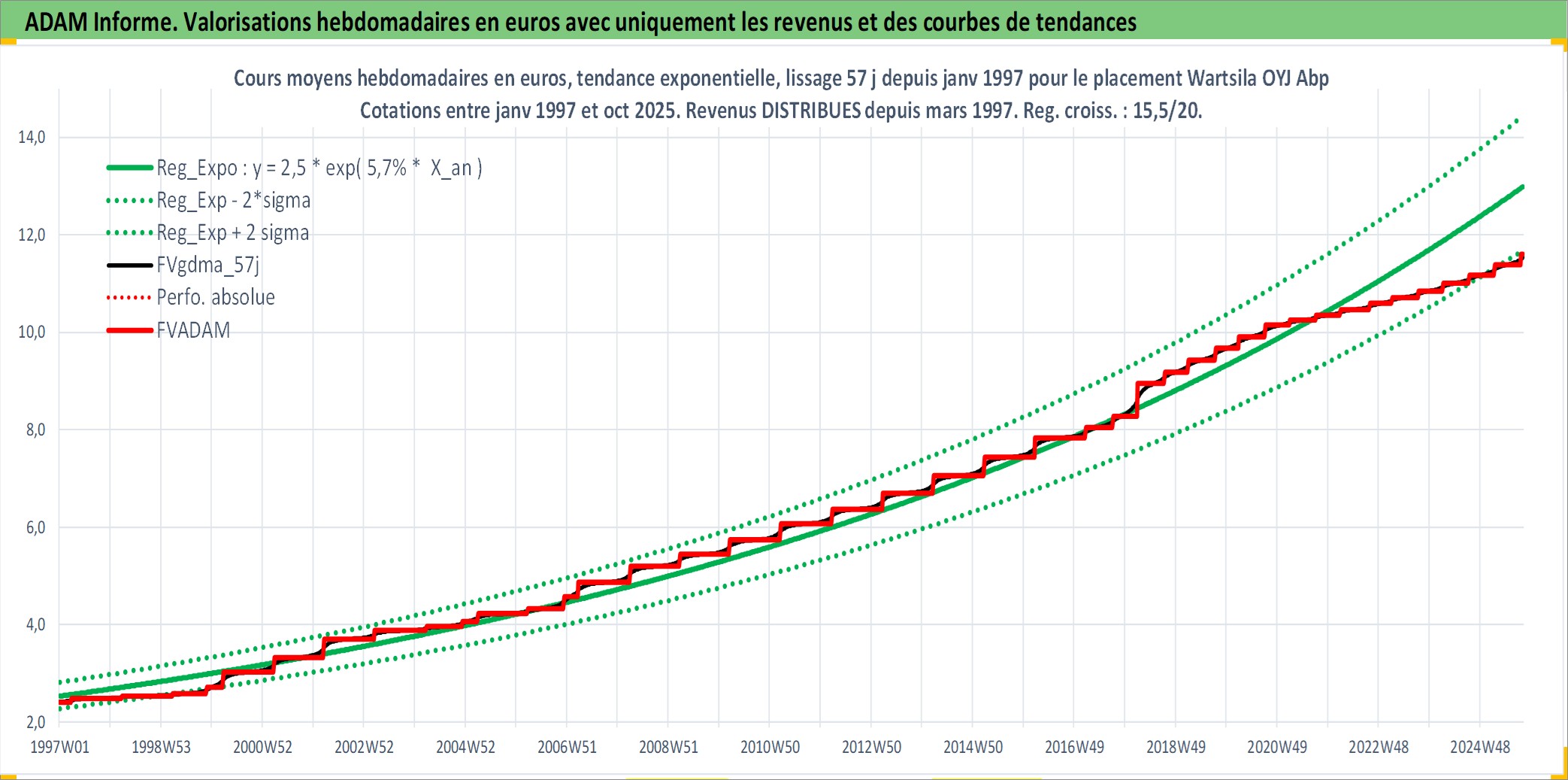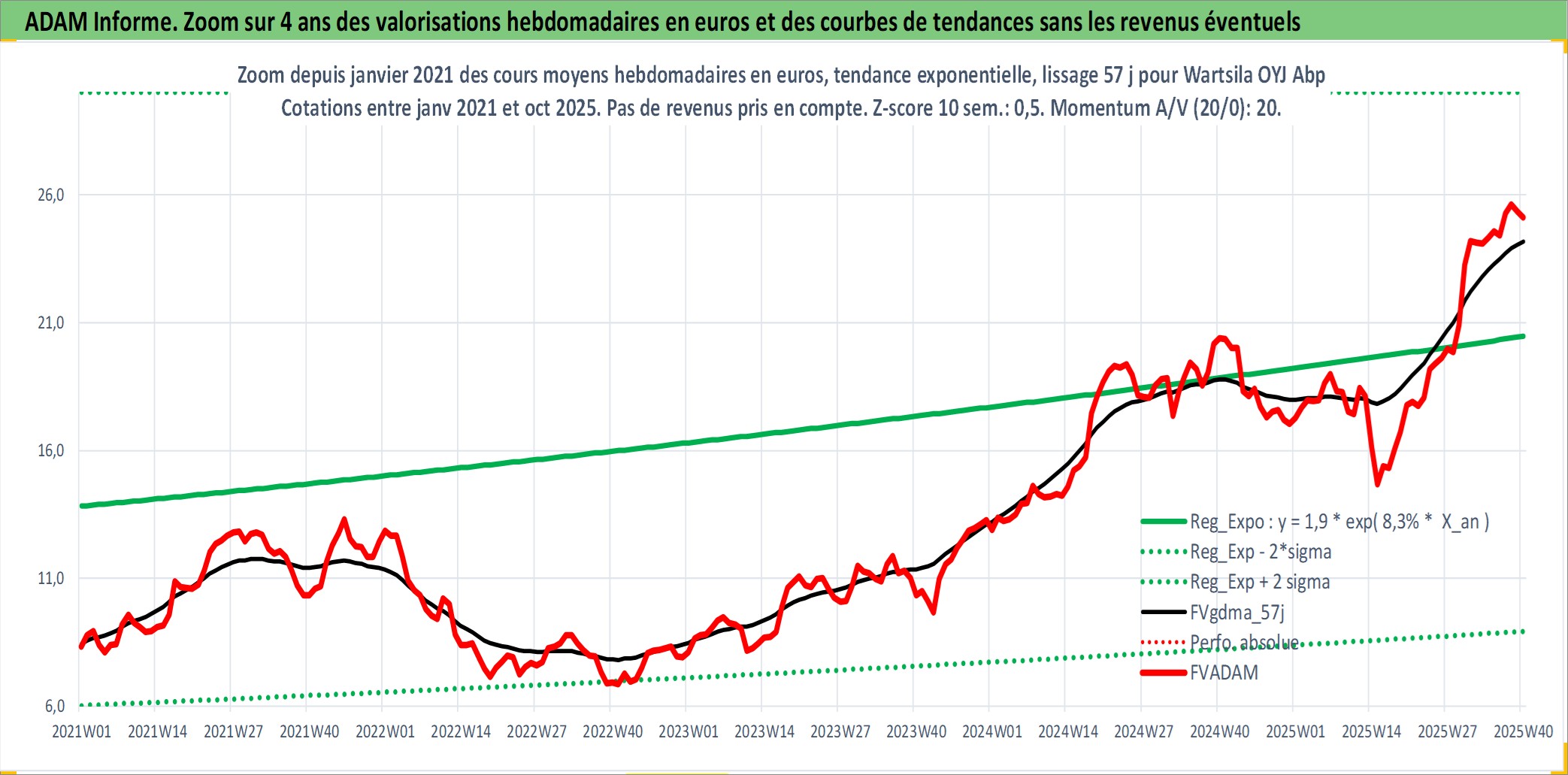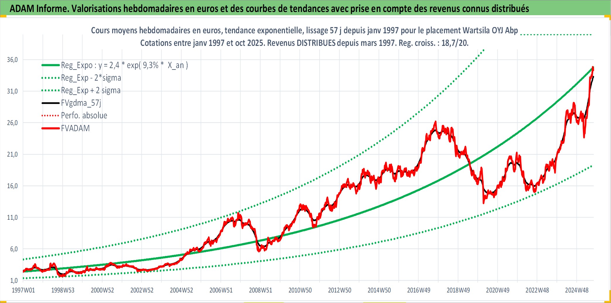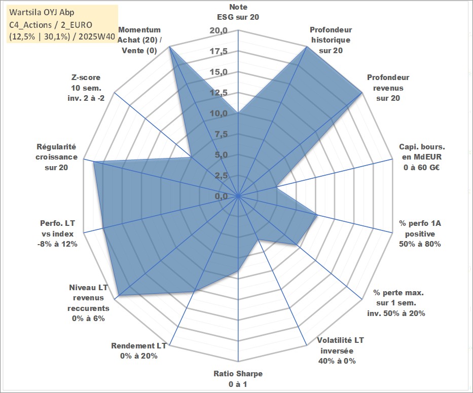 Site dédié aux investisseursPage dédiée sur site financeAnalyse des valorisations hebdomadaires de l'action Wartsila OYJ Abp. Cet actif est cote en EUR. Les valorisations couvrent les semaines 1997W01 a 2025W40. Les revenus de cet actif financier sont pris en compte depuis la semaine 1997W13. La note globale ESG de cet actif est estimee a 10.0 (apres rebasage entre 0 et 20).