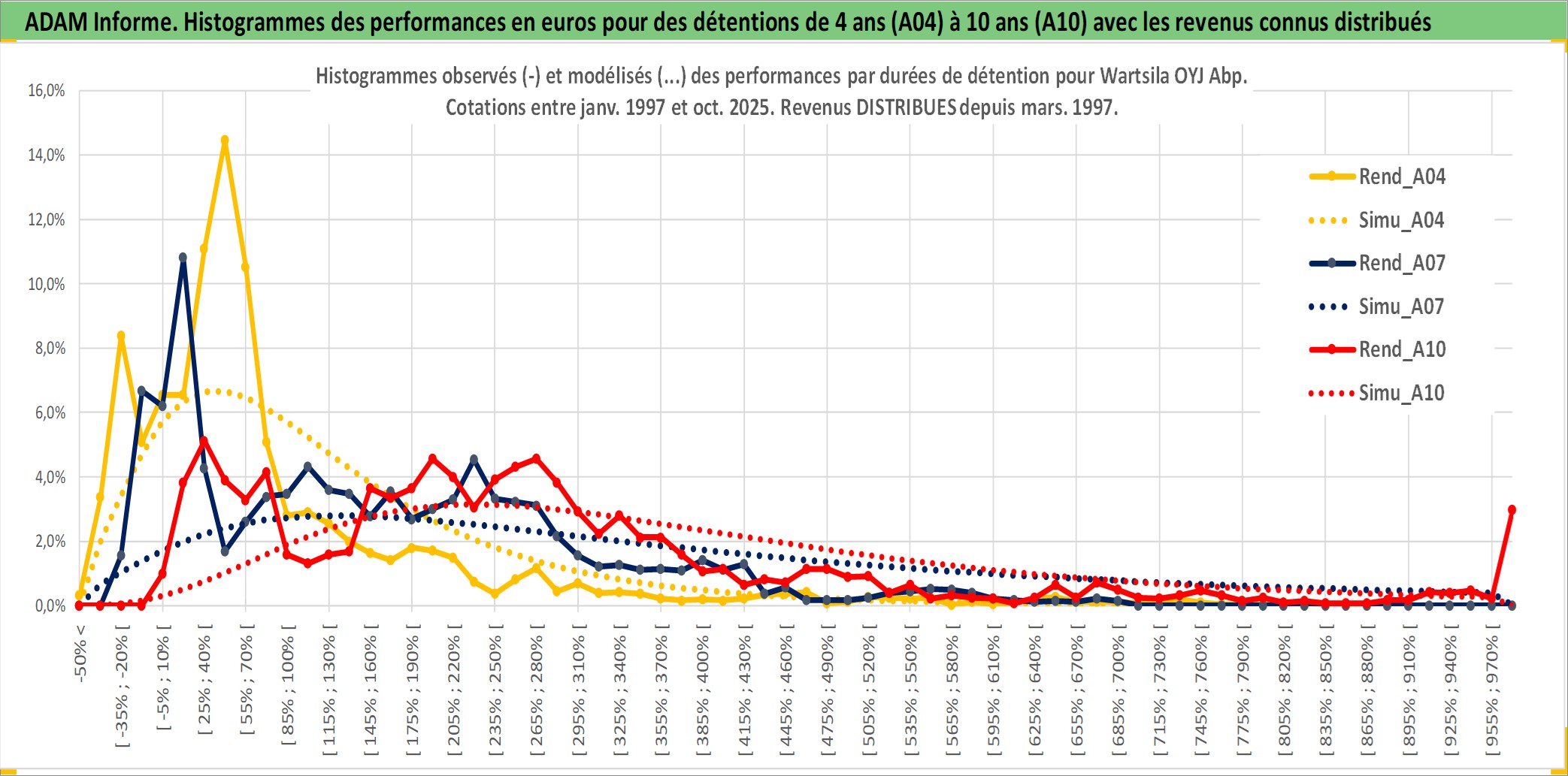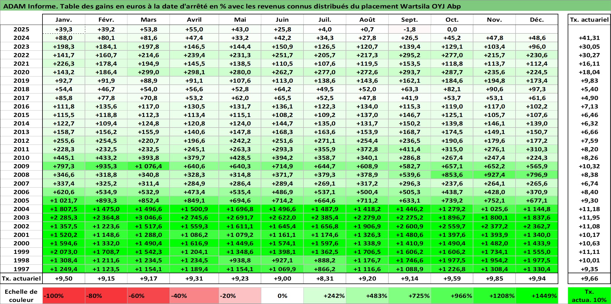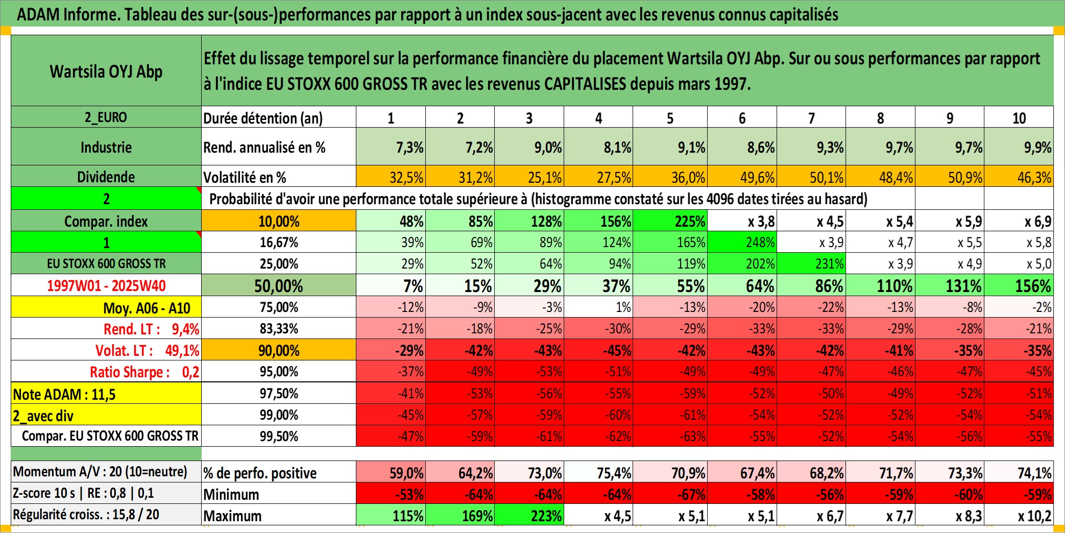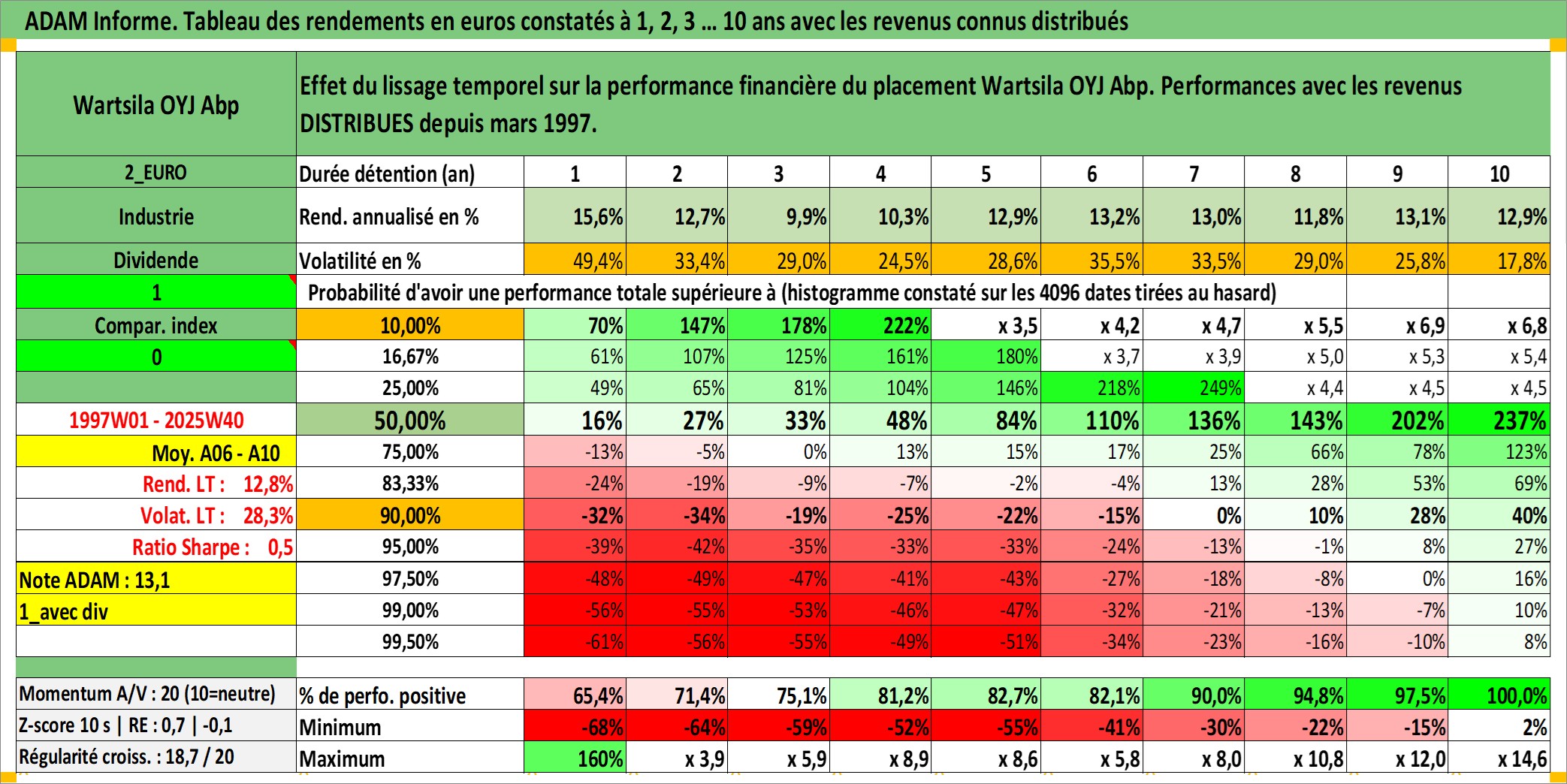 Site dédié aux investisseursPage dédiée sur site financeAnalyse des valorisations hebdomadaires de l'action Wartsila OYJ Abp. Cet actif est cote en EUR. Les valorisations couvrent les semaines 1997W01 a 2025W40. Les revenus de cet actif financier sont pris en compte depuis la semaine 1997W13. La note globale ESG de cet actif est estimee a 10.0 (apres rebasage entre 0 et 20).