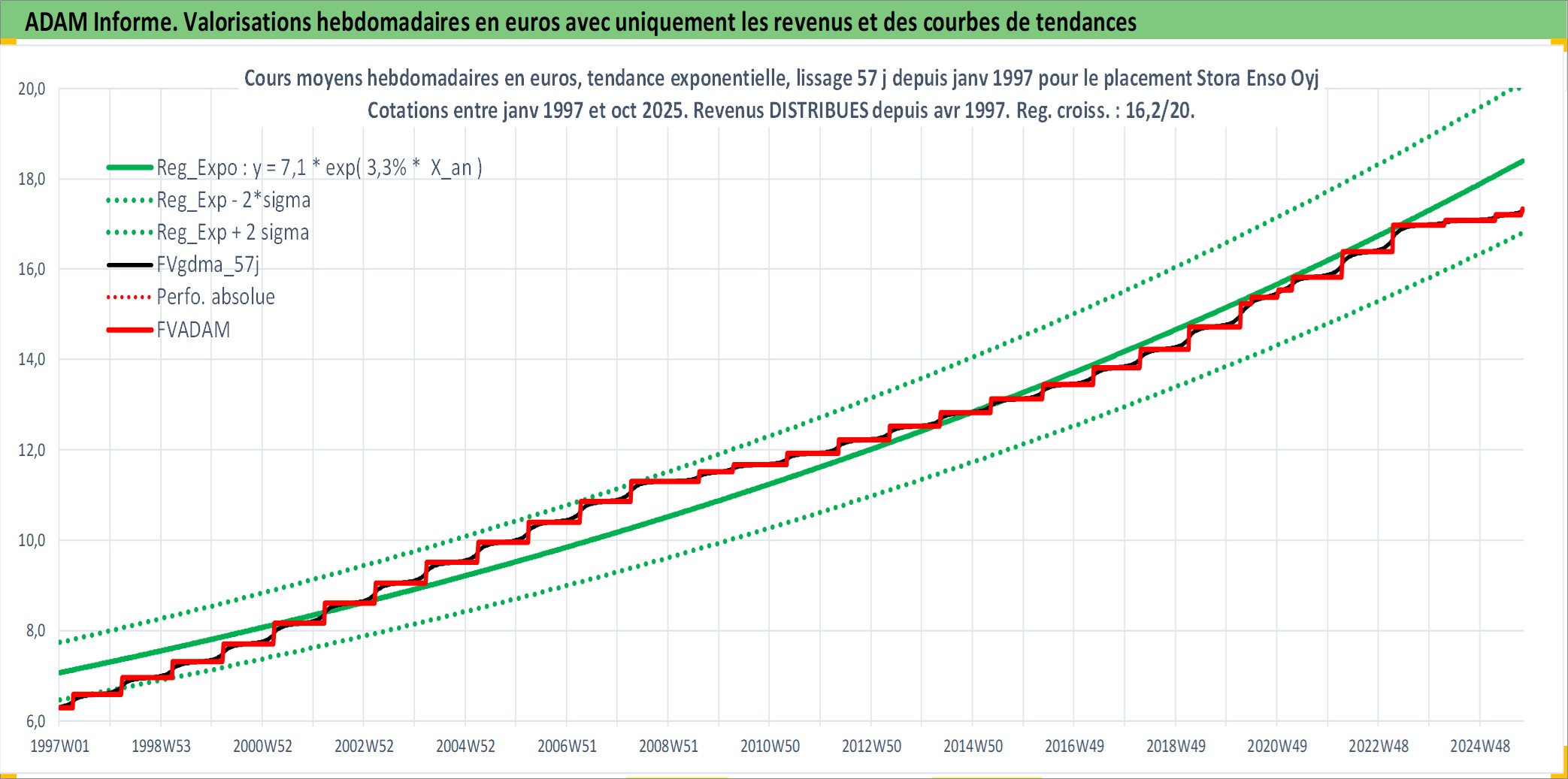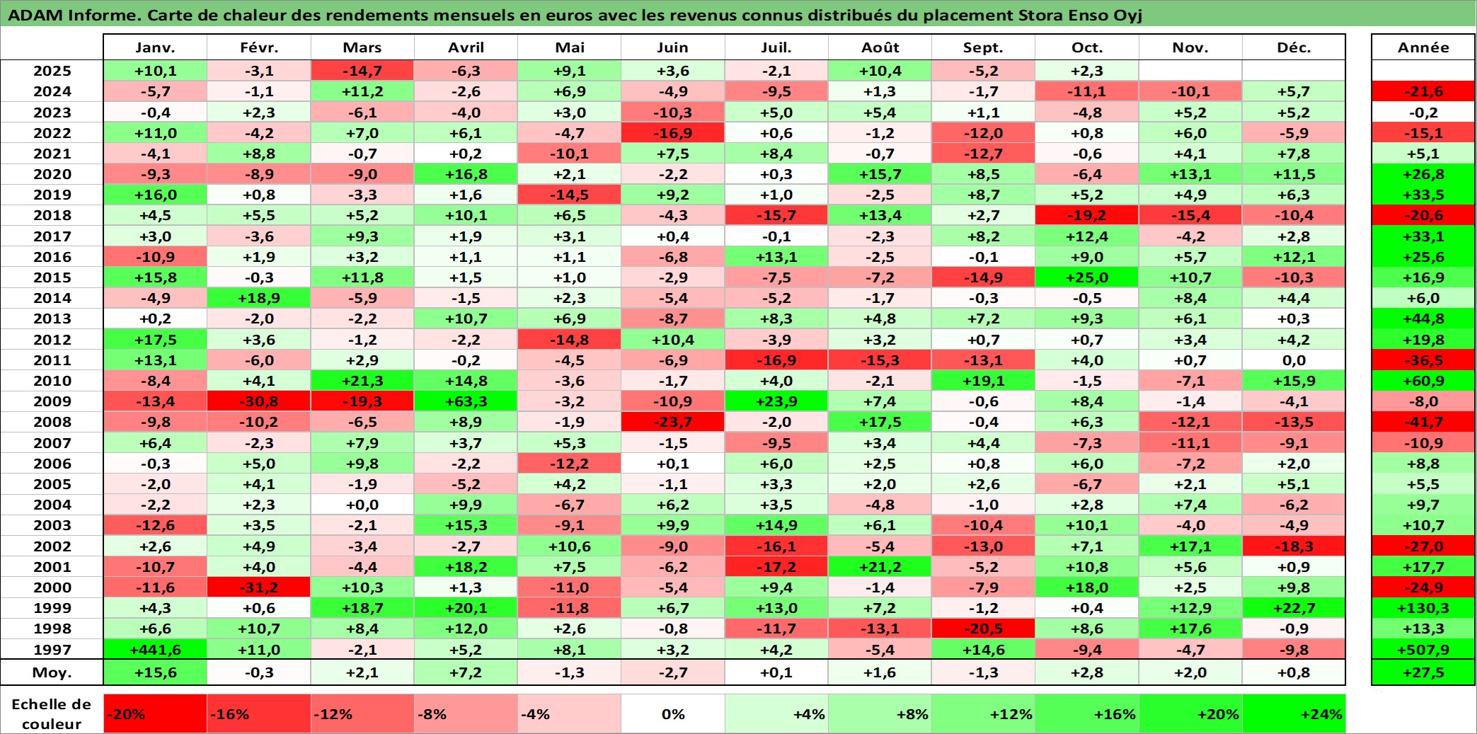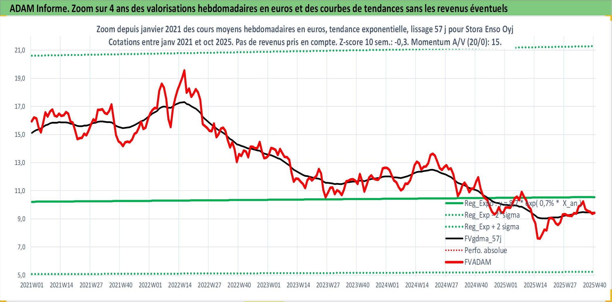 Site dédié aux investisseursPage dédiée sur site financeAnalyse des valorisations hebdomadaires de l'action Stora Enso Oyj. Cet actif est cote en EUR. Les valorisations couvrent les semaines 1997W01 a 2025W40. Les revenus de cet actif financier sont pris en compte depuis la semaine 1997W15. La note globale ESG de cet actif est estimee a 13.0 (apres rebasage entre 0 et 20).