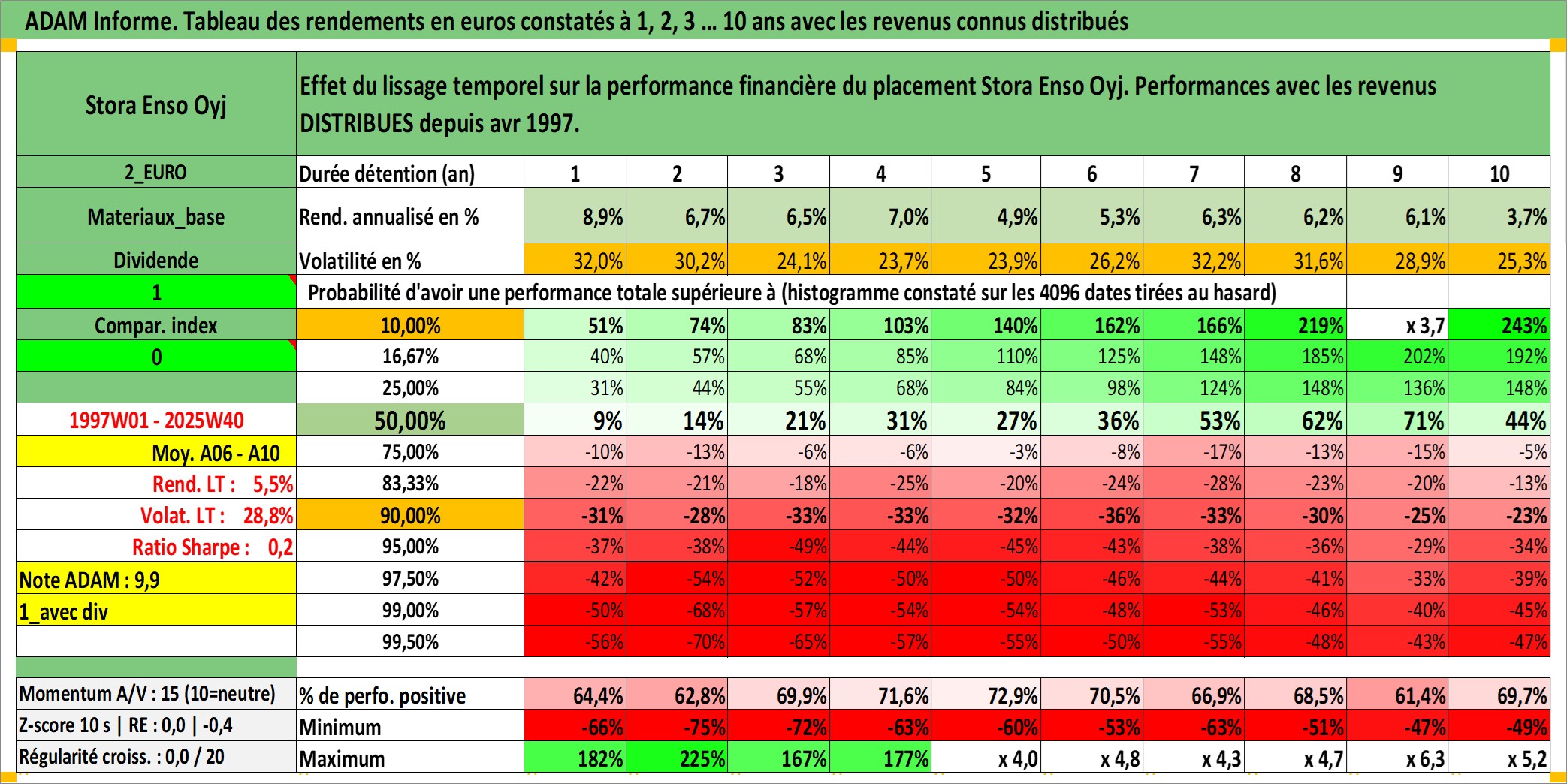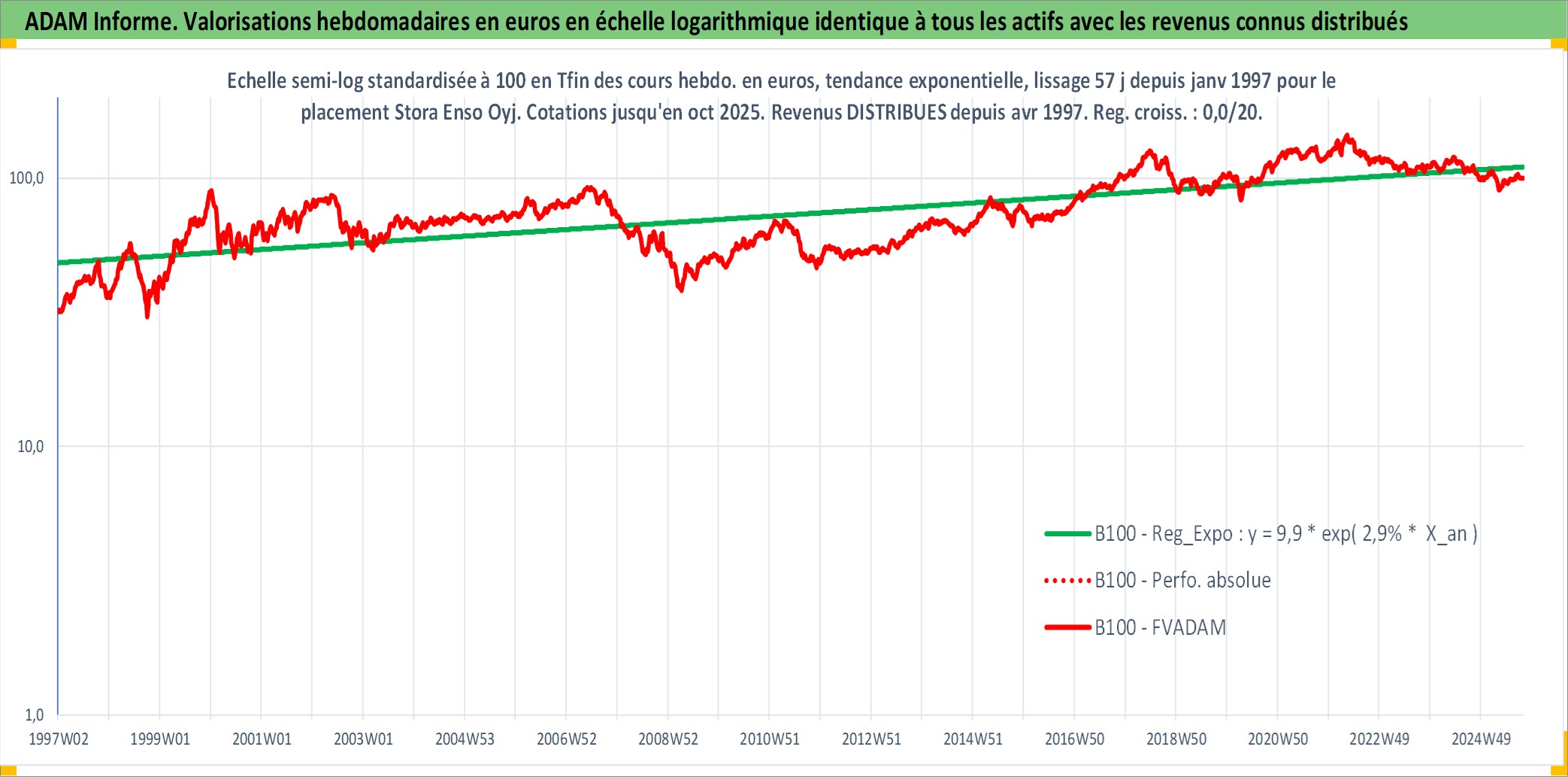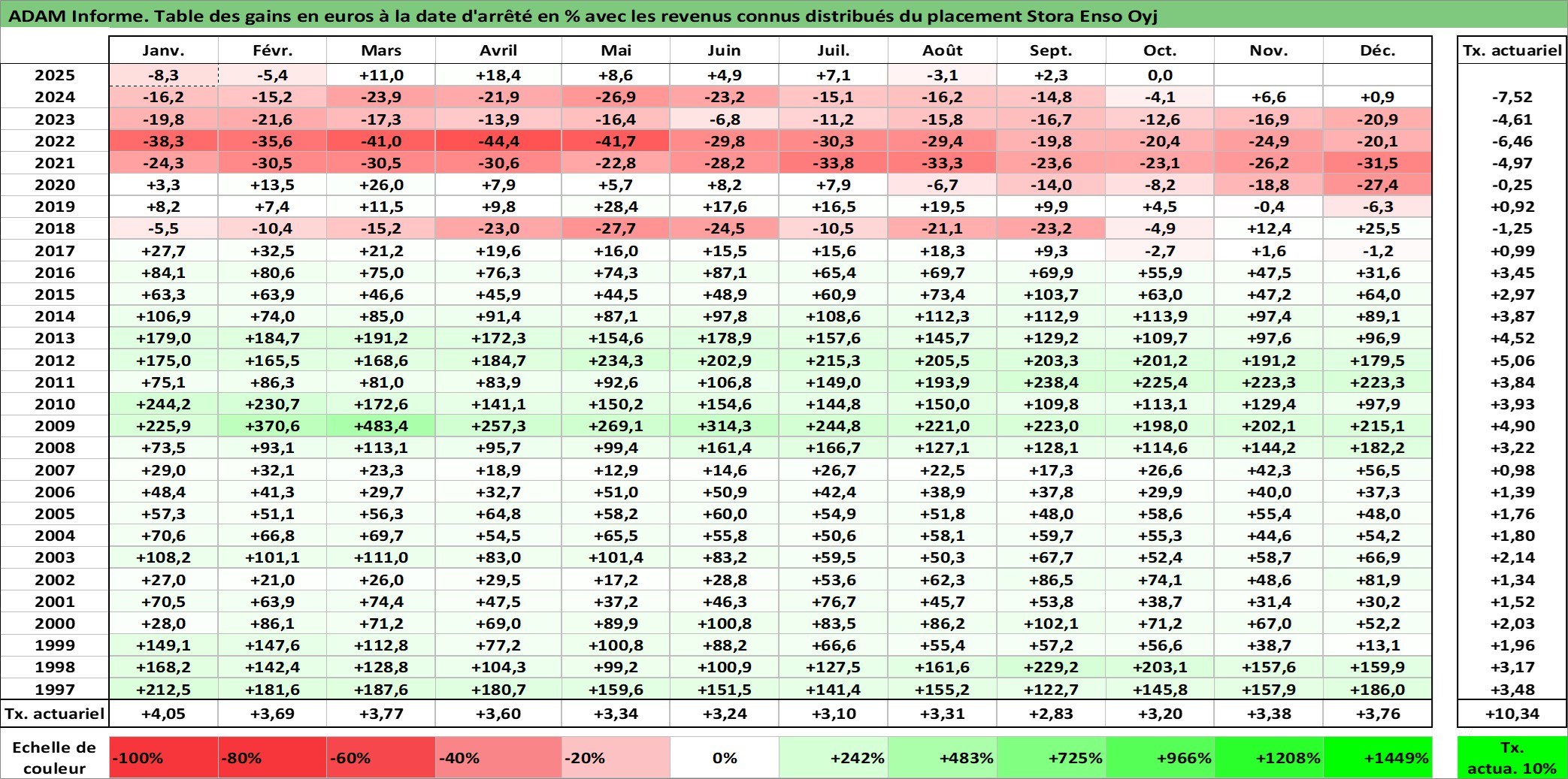 Site dédié aux investisseursPage dédiée sur site financeAnalyse des valorisations hebdomadaires de l'action Stora Enso Oyj. Cet actif est cote en EUR. Les valorisations couvrent les semaines 1997W01 a 2025W40. Les revenus de cet actif financier sont pris en compte depuis la semaine 1997W15. La note globale ESG de cet actif est estimee a 13.0 (apres rebasage entre 0 et 20).