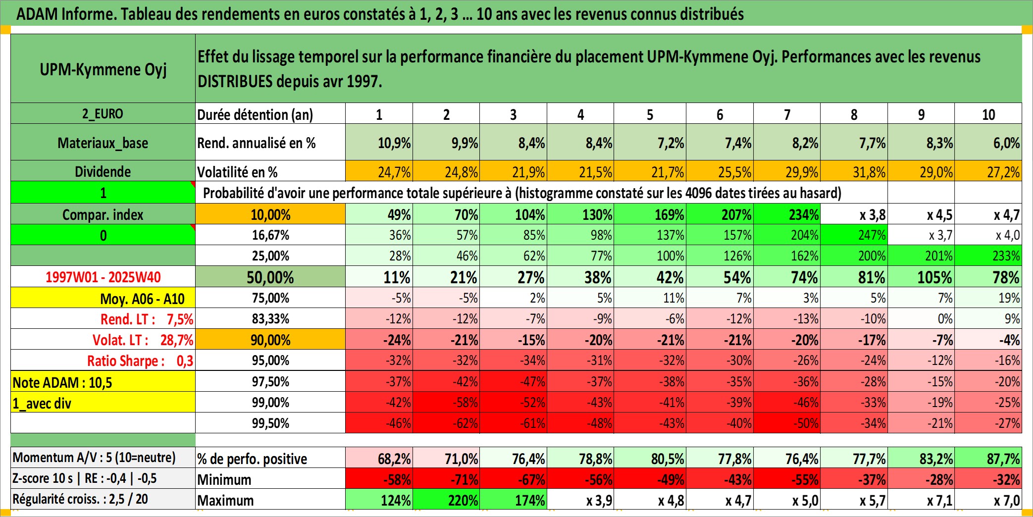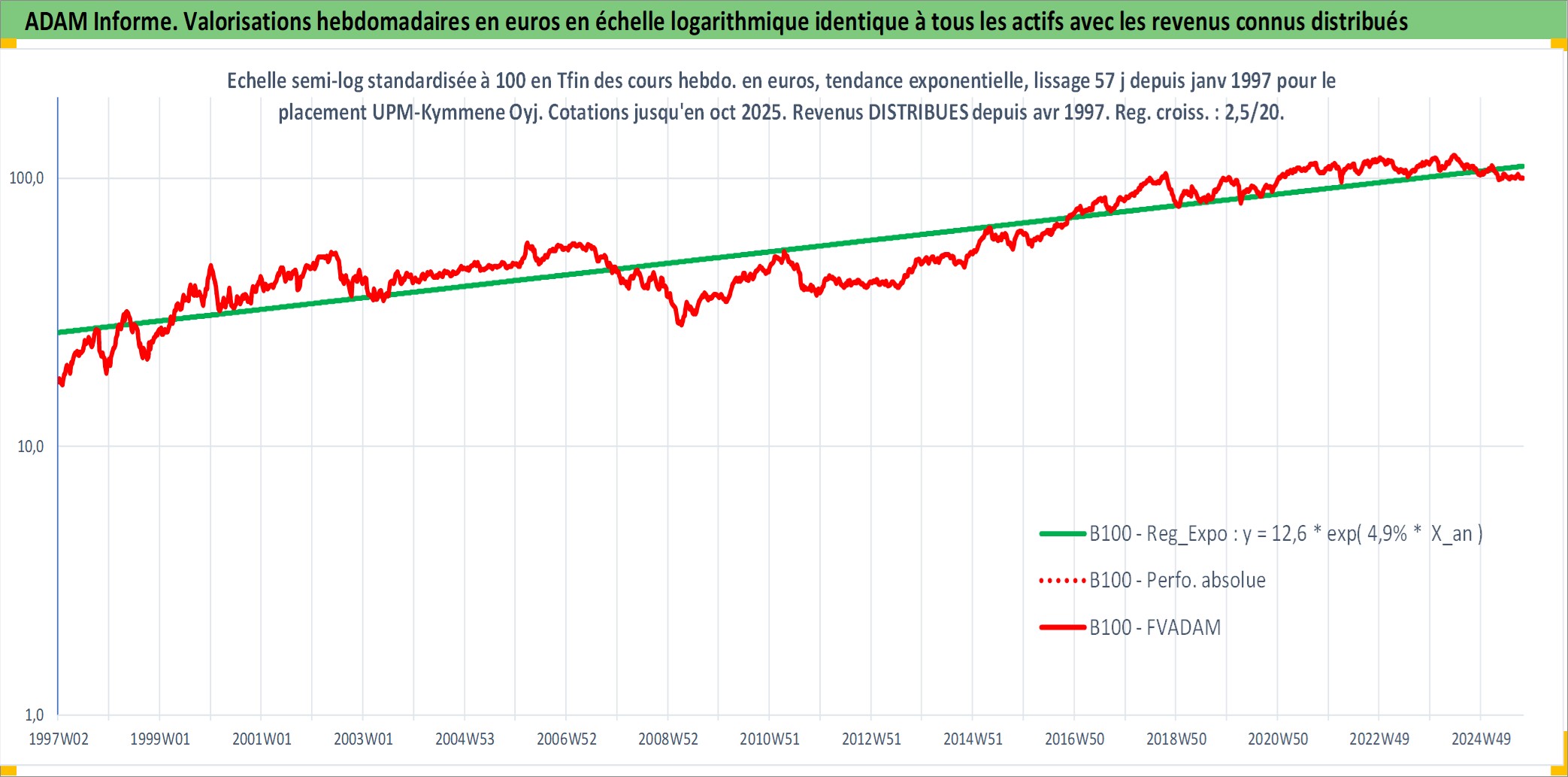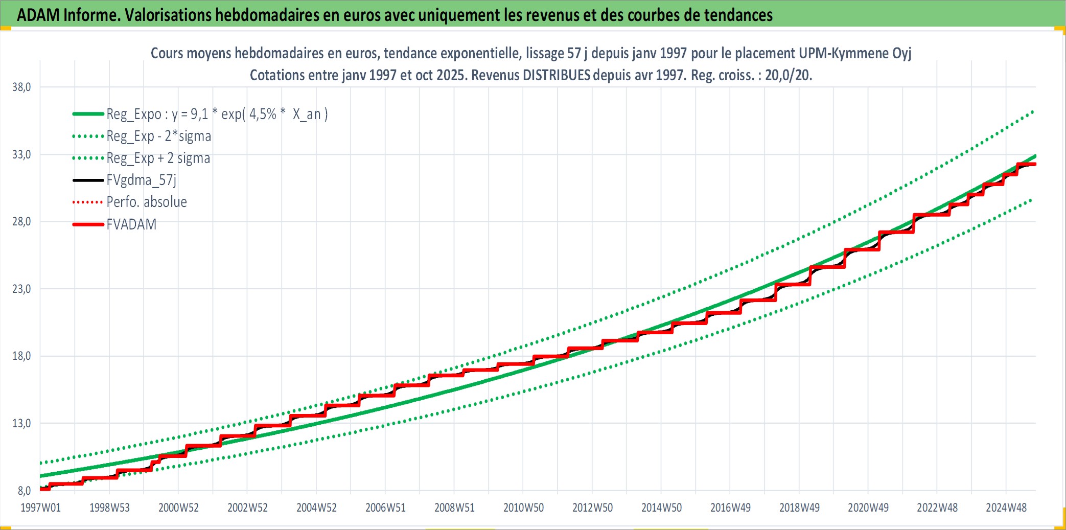 Site dédié aux investisseursPage dédiée sur site financeAnalyse des valorisations hebdomadaires de l'action UPM-Kymmene Oyj. Cet actif est cote en EUR. Les valorisations couvrent les semaines 1997W01 a 2025W40. Les revenus de cet actif financier sont pris en compte depuis la semaine 1997W15. La note globale ESG de cet actif est estimee a 13.0 (apres rebasage entre 0 et 20).