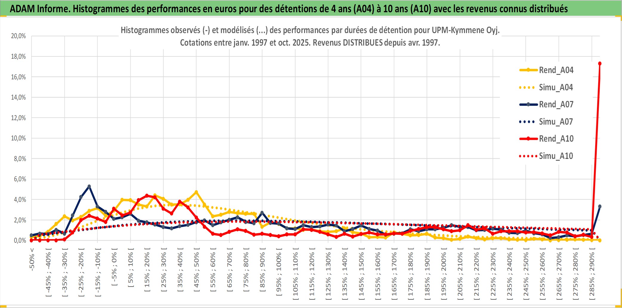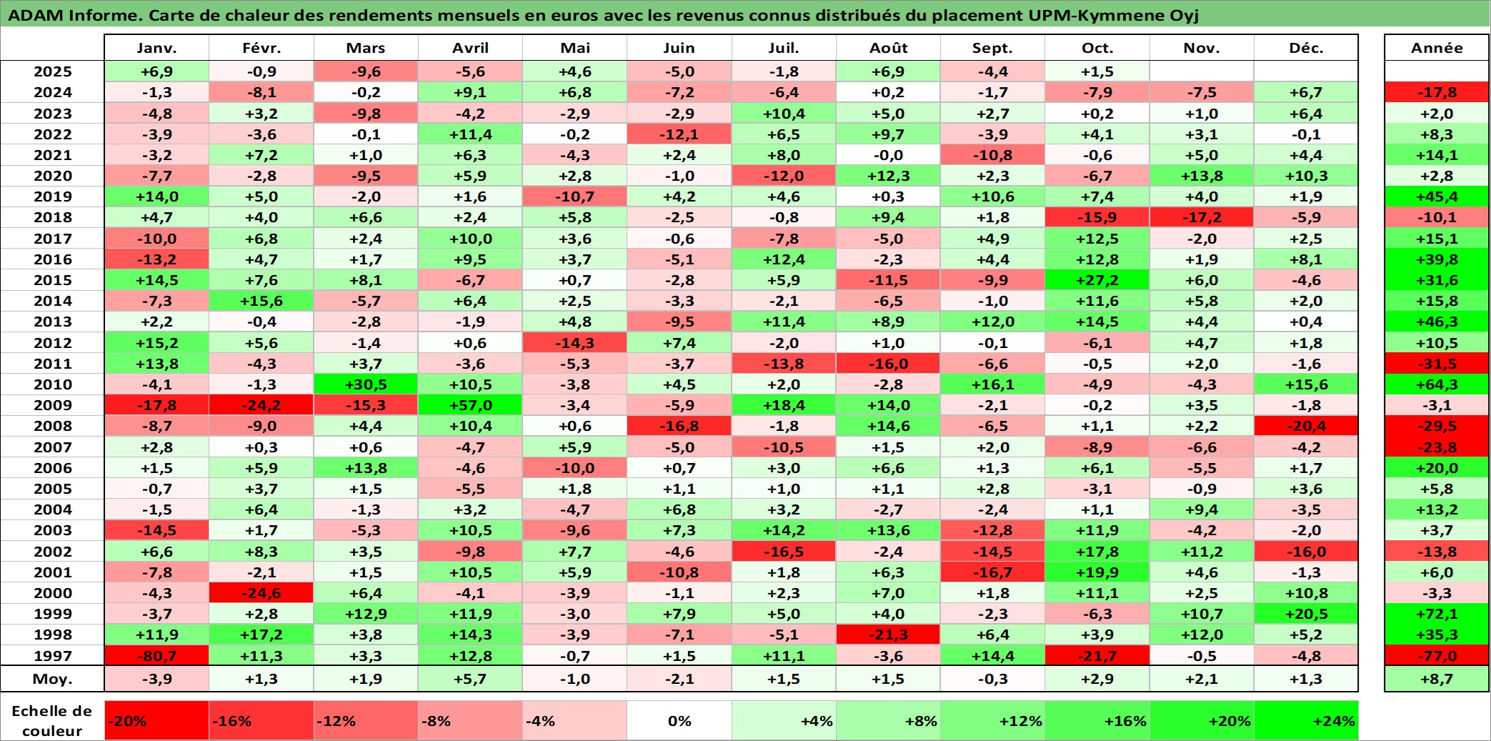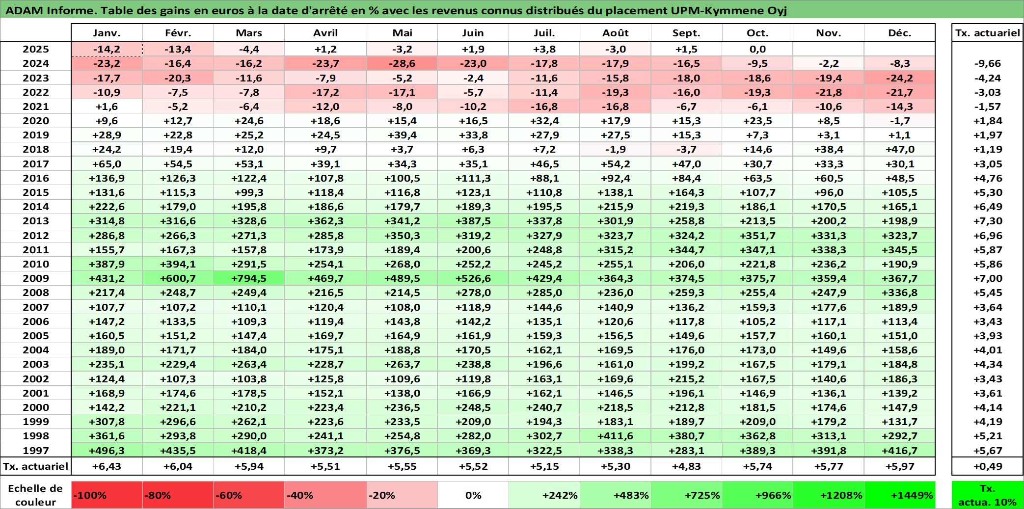 Site dédié aux investisseursPage dédiée sur site financeAnalyse des valorisations hebdomadaires de l'action UPM-Kymmene Oyj. Cet actif est cote en EUR. Les valorisations couvrent les semaines 1997W01 a 2025W40. Les revenus de cet actif financier sont pris en compte depuis la semaine 1997W15. La note globale ESG de cet actif est estimee a 13.0 (apres rebasage entre 0 et 20).