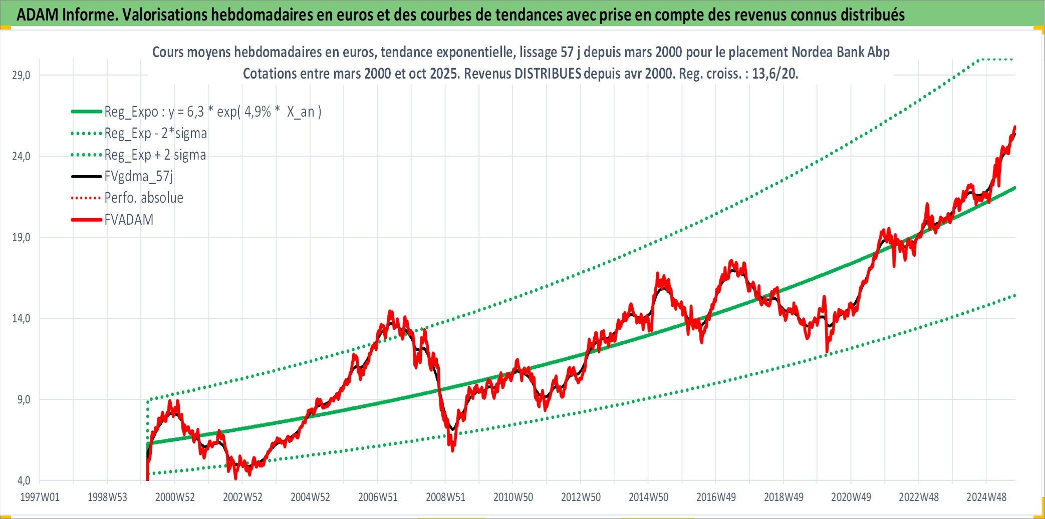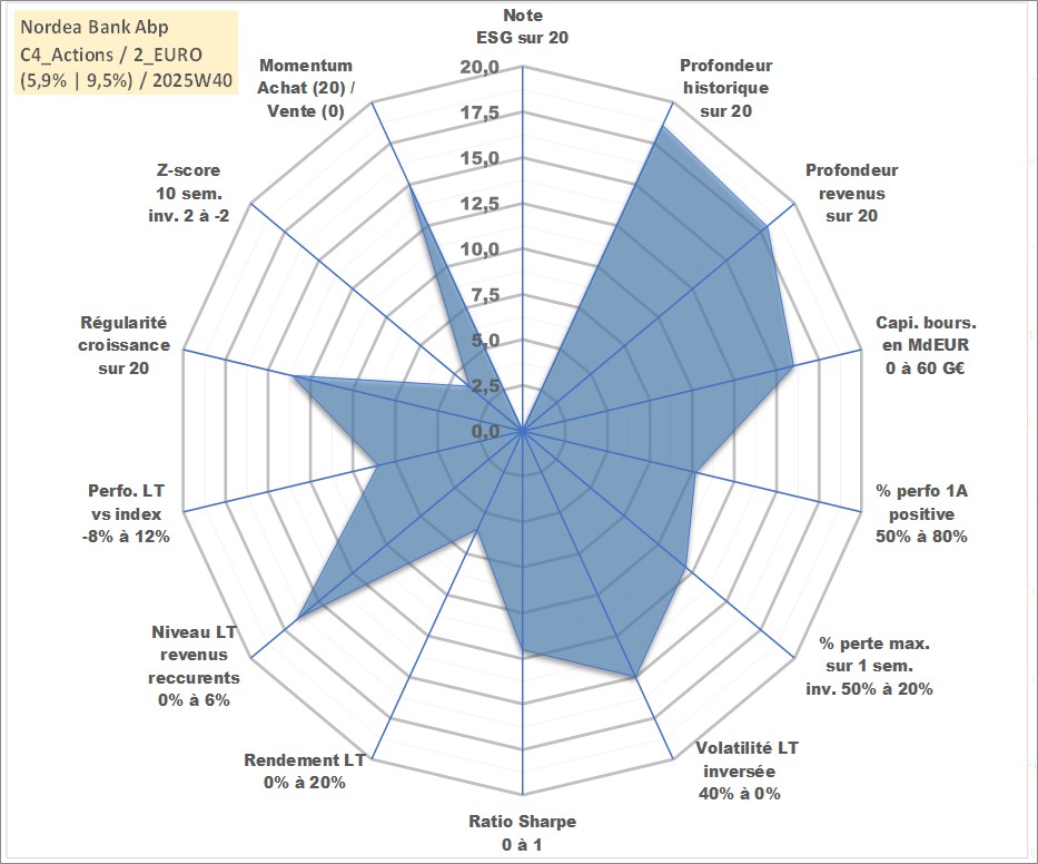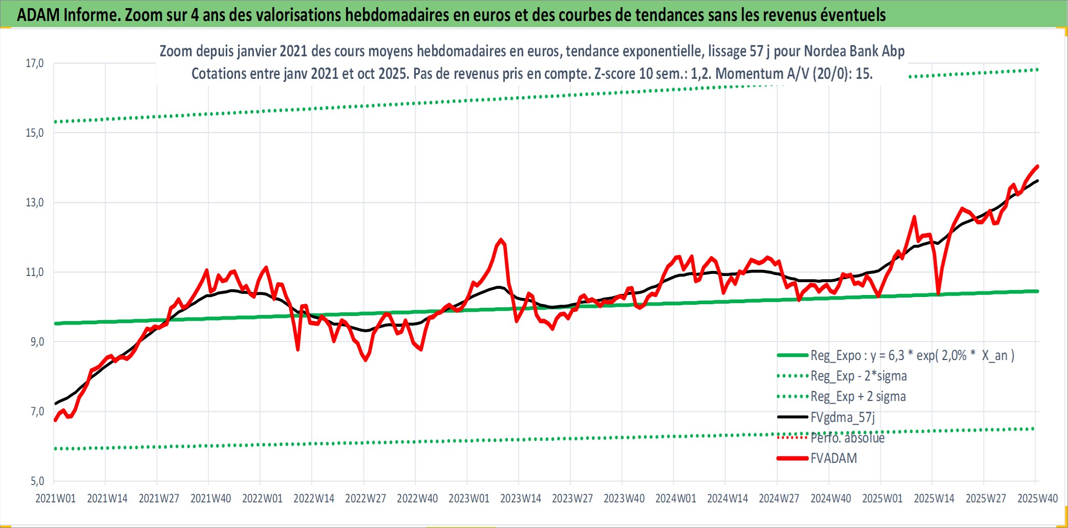 Site dédié aux investisseursPage dédiée sur site financeAnalyse des valorisations hebdomadaires de l'action Nordea Bank Abp. Cet actif est cote en EUR. Les valorisations couvrent les semaines 2000W10 a 2025W40. Les revenus de cet actif financier sont pris en compte depuis la semaine 2000W15. La note ESG de cet actif n'est pas connue.