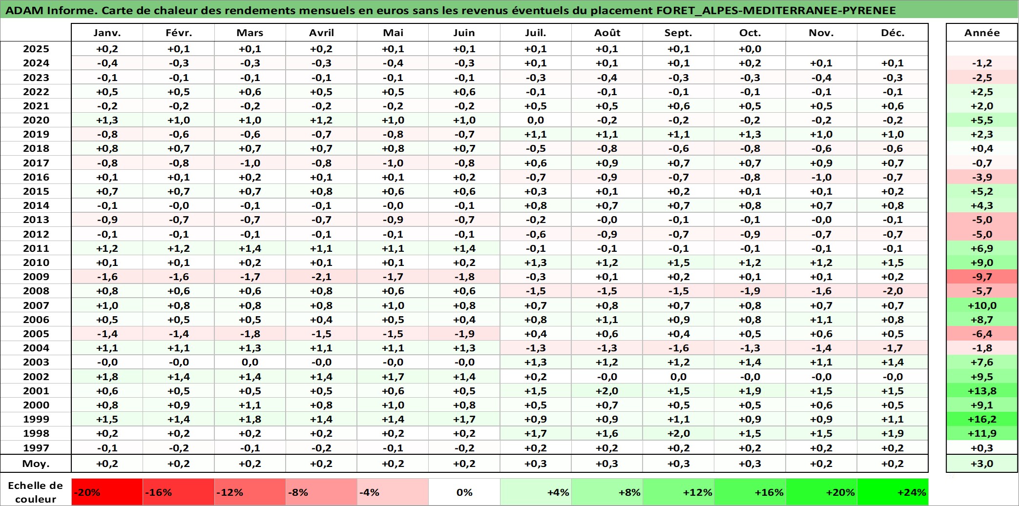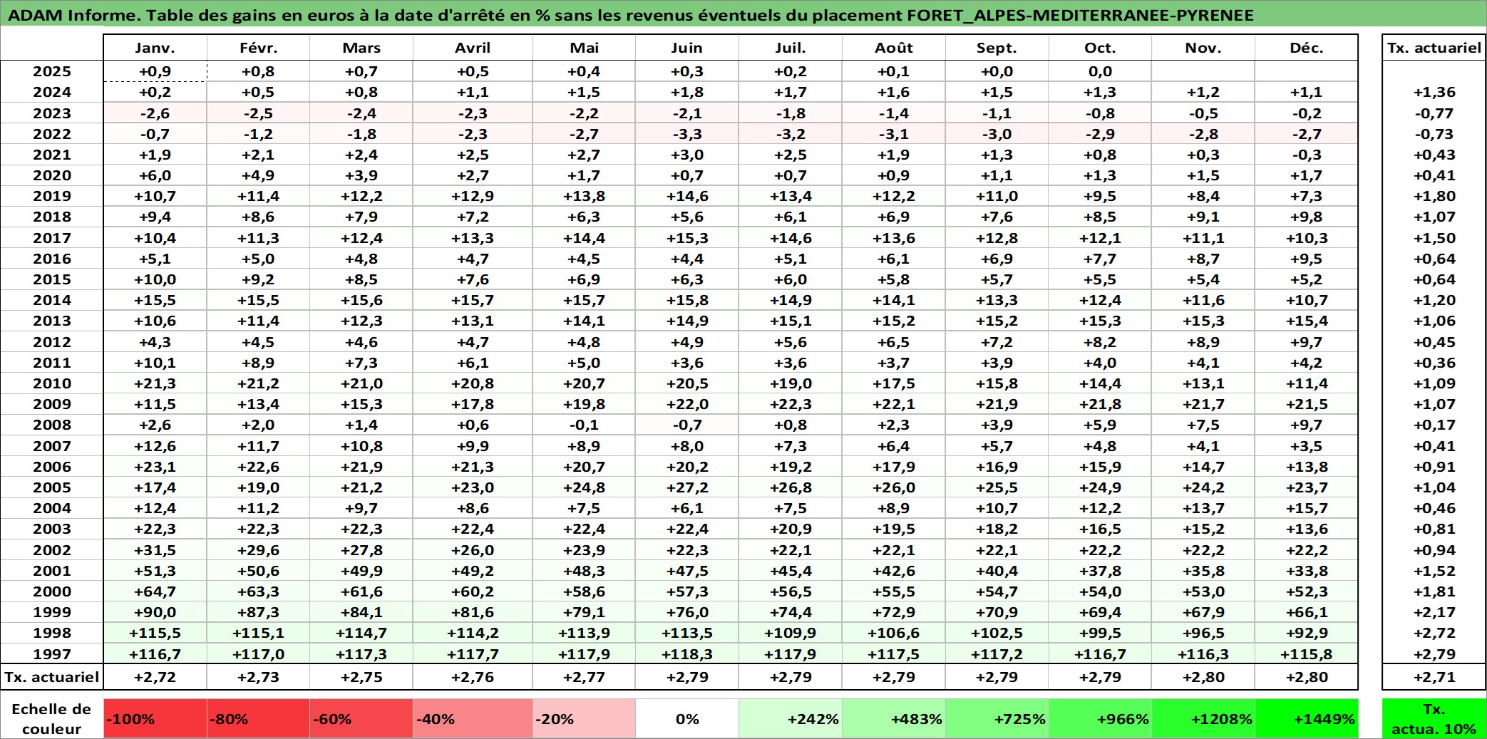 Site dédié aux investisseursPage dédiée sur site financeAnalyse des valorisations hebdomadaires de l'actif FORET_ALPES-MEDITERRANEE-PYRENEE. Cet actif est cote en EUR. Les valorisations couvrent les semaines 1997W01 a 2025W40. Les fermages de ce bien foncier sont pris egaux a 2,5% annuels de la valeur venale du bien.