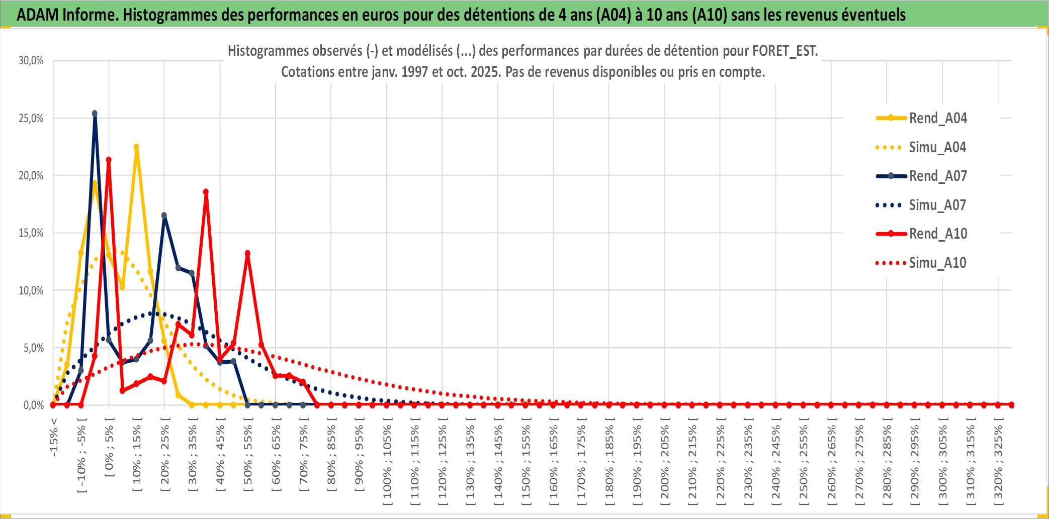 Site dédié aux investisseursPage dédiée sur site financeAnalyse des valorisations hebdomadaires de l'actif FORET_EST. Cet actif est cote en EUR. Les valorisations couvrent les semaines 1997W01 a 2025W40. Les fermages de ce bien foncier sont pris egaux a 2,5% annuels de la valeur venale du bien.