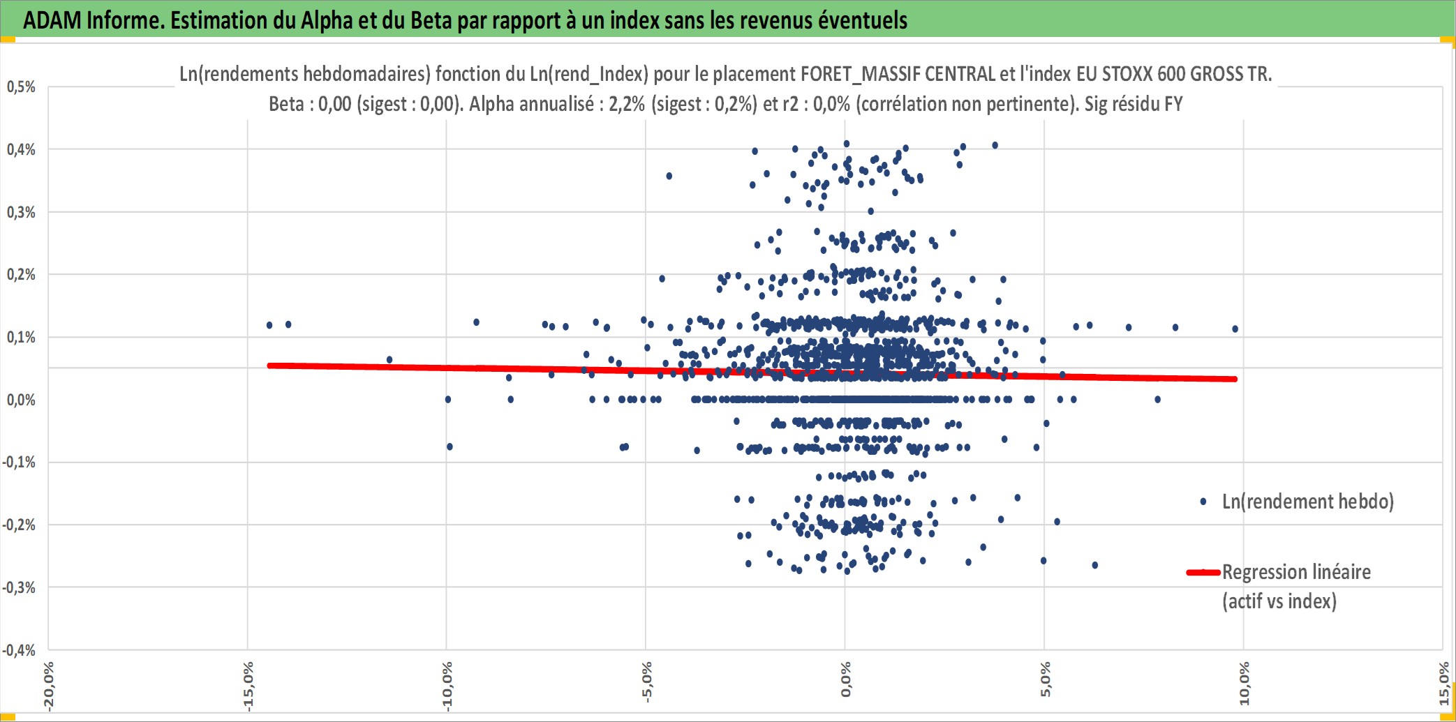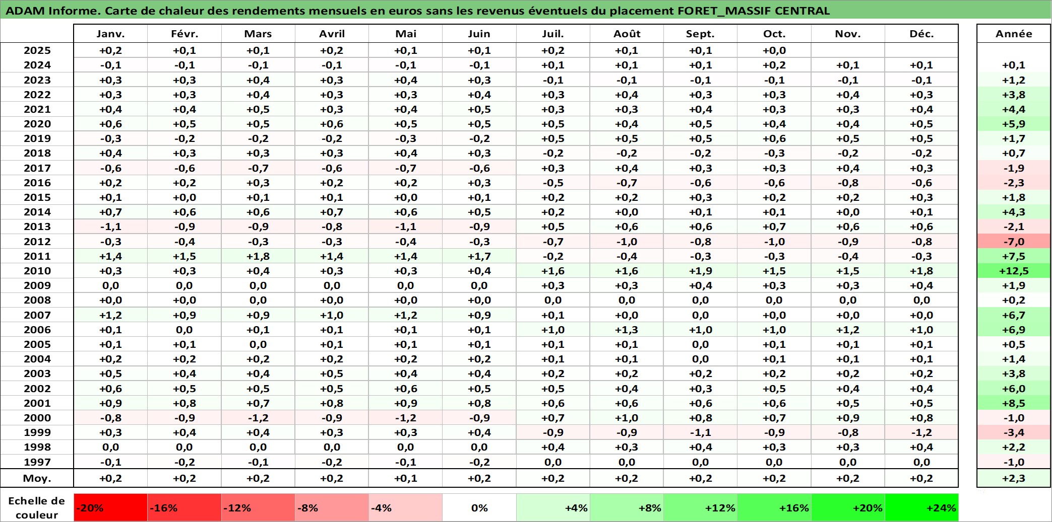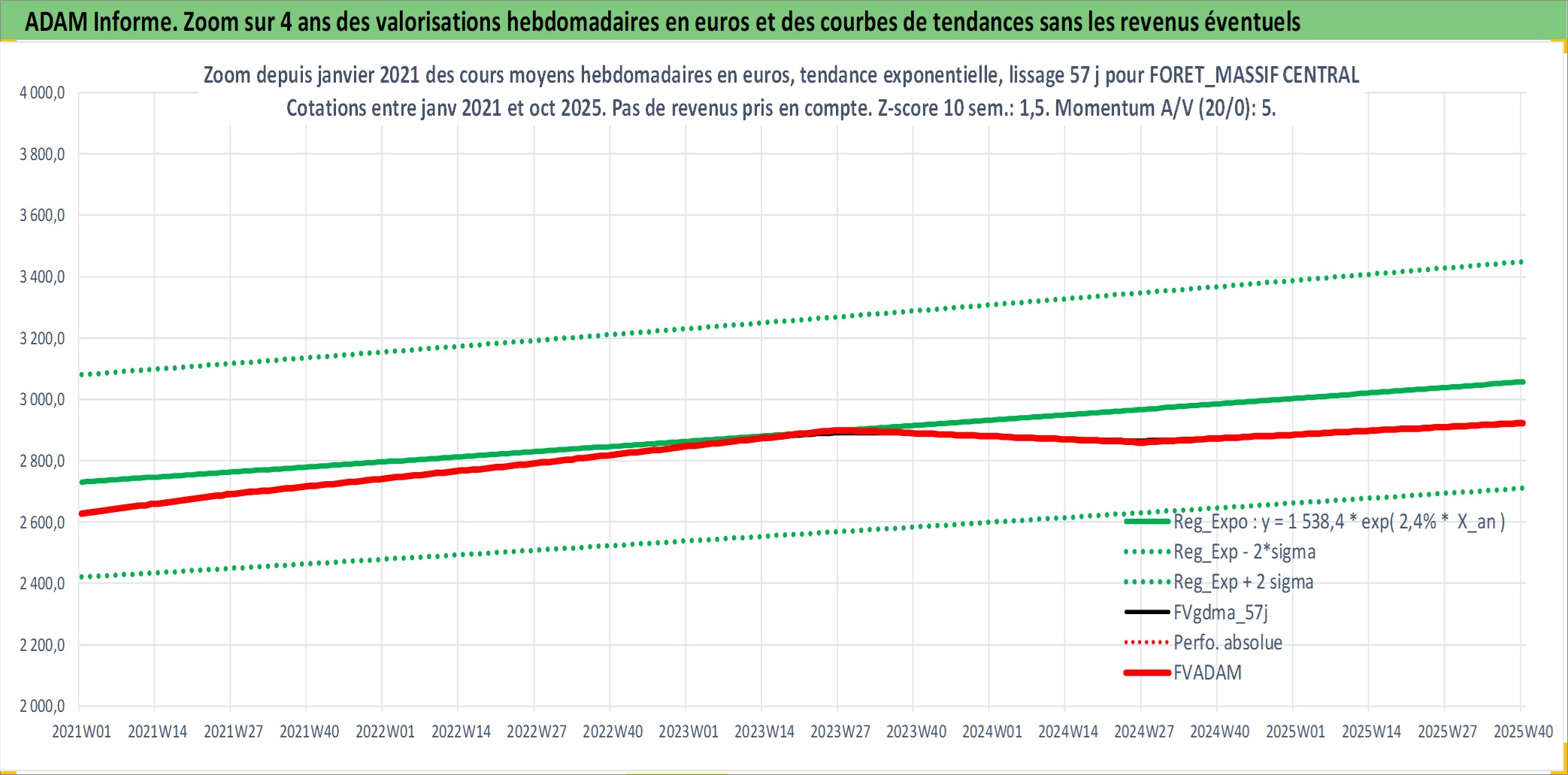 Site dédié aux investisseursPage dédiée sur site financeAnalyse des valorisations hebdomadaires de l'actif FORET_MASSIF CENTRAL. Cet actif est cote en EUR. Les valorisations couvrent les semaines 1997W01 a 2025W40. Les fermages de ce bien foncier sont pris egaux a 2,5% annuels de la valeur venale du bien.
