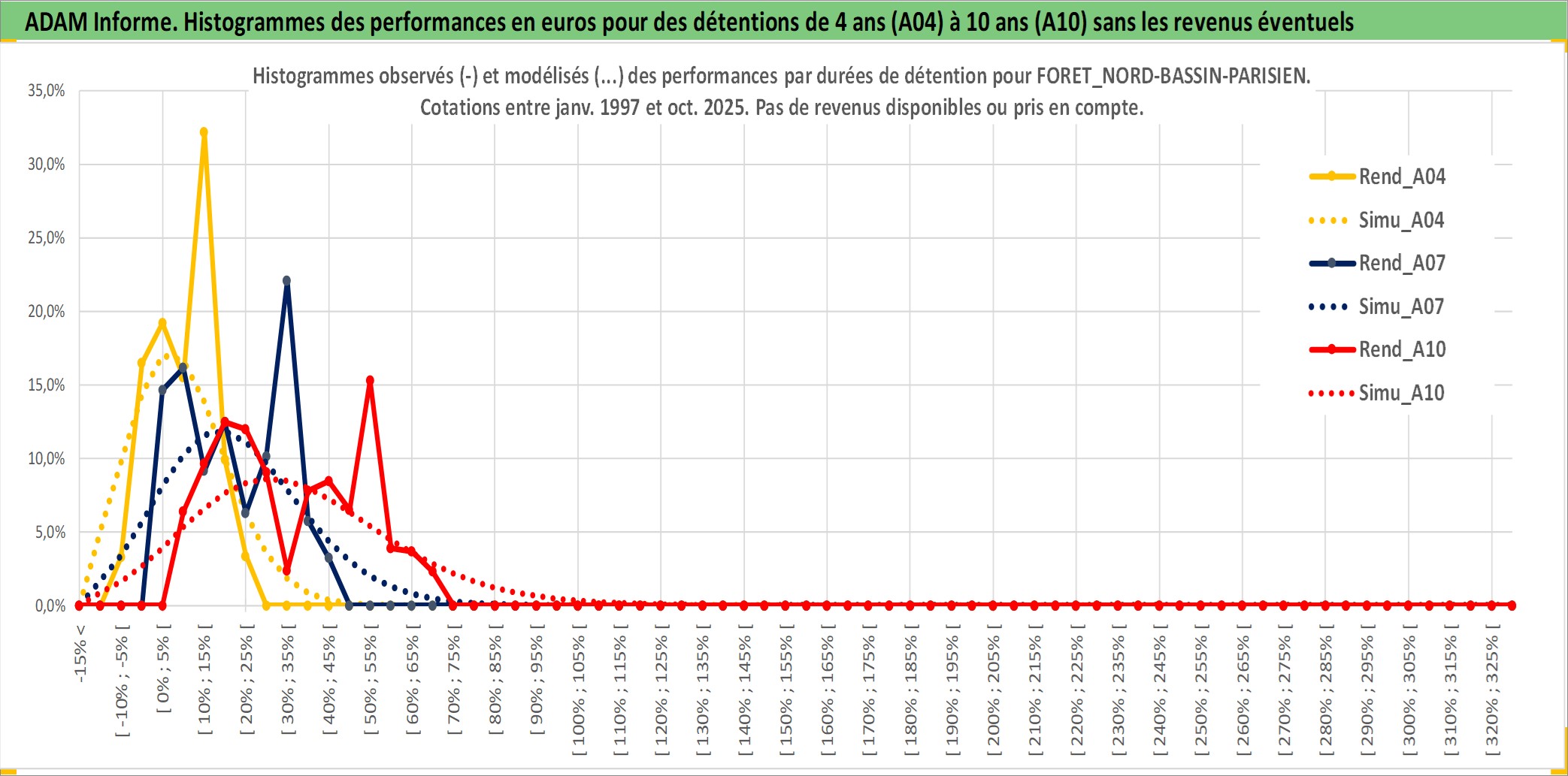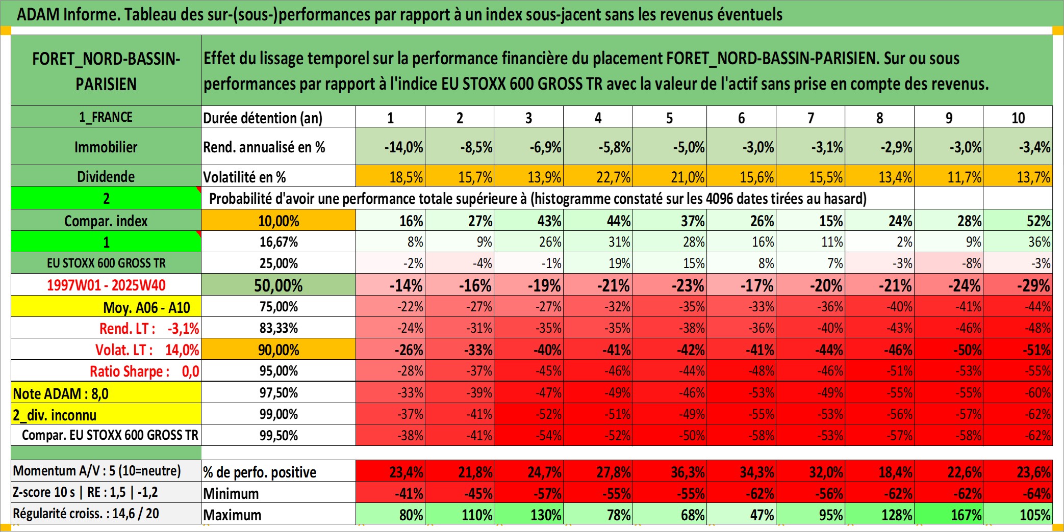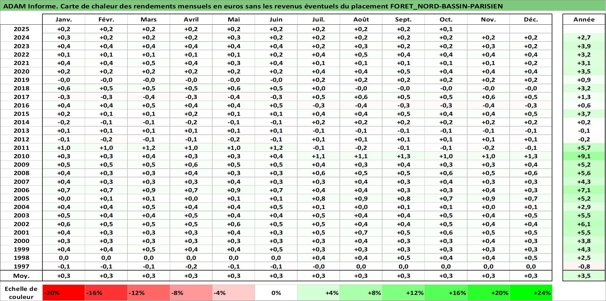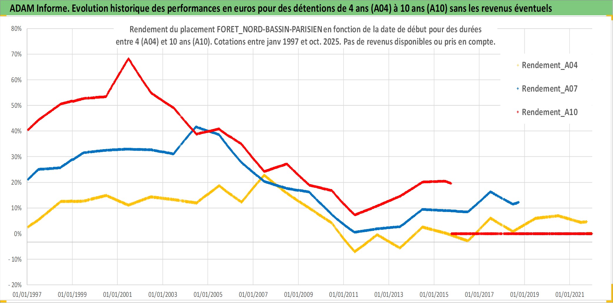 Site dédié aux investisseursPage dédiée sur site financeAnalyse des valorisations hebdomadaires de l'actif FORET_NORD-BASSIN-PARISIEN. Cet actif est cote en EUR. Les valorisations couvrent les semaines 1997W01 a 2025W40. Les fermages de ce bien foncier sont pris egaux a 2,5% annuels de la valeur venale du bien.
