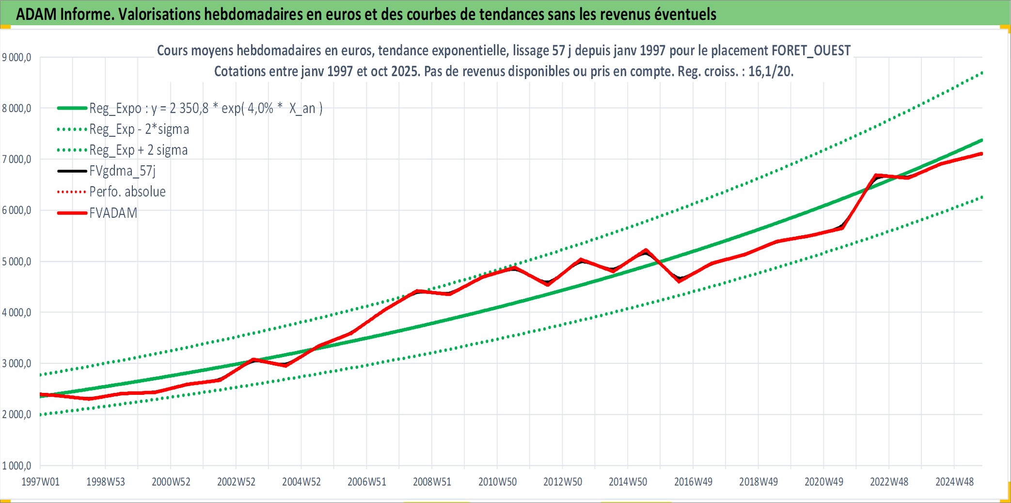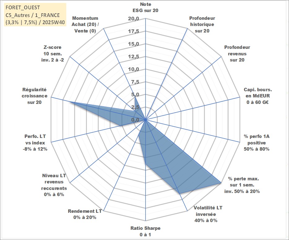 Site dédié aux investisseursPage dédiée sur site financeAnalyse des valorisations hebdomadaires de l'actif FORET_OUEST. Cet actif est cote en EUR. Les valorisations couvrent les semaines 1997W01 a 2025W40. Les fermages de ce bien foncier sont pris egaux a 2,5% annuels de la valeur venale du bien.