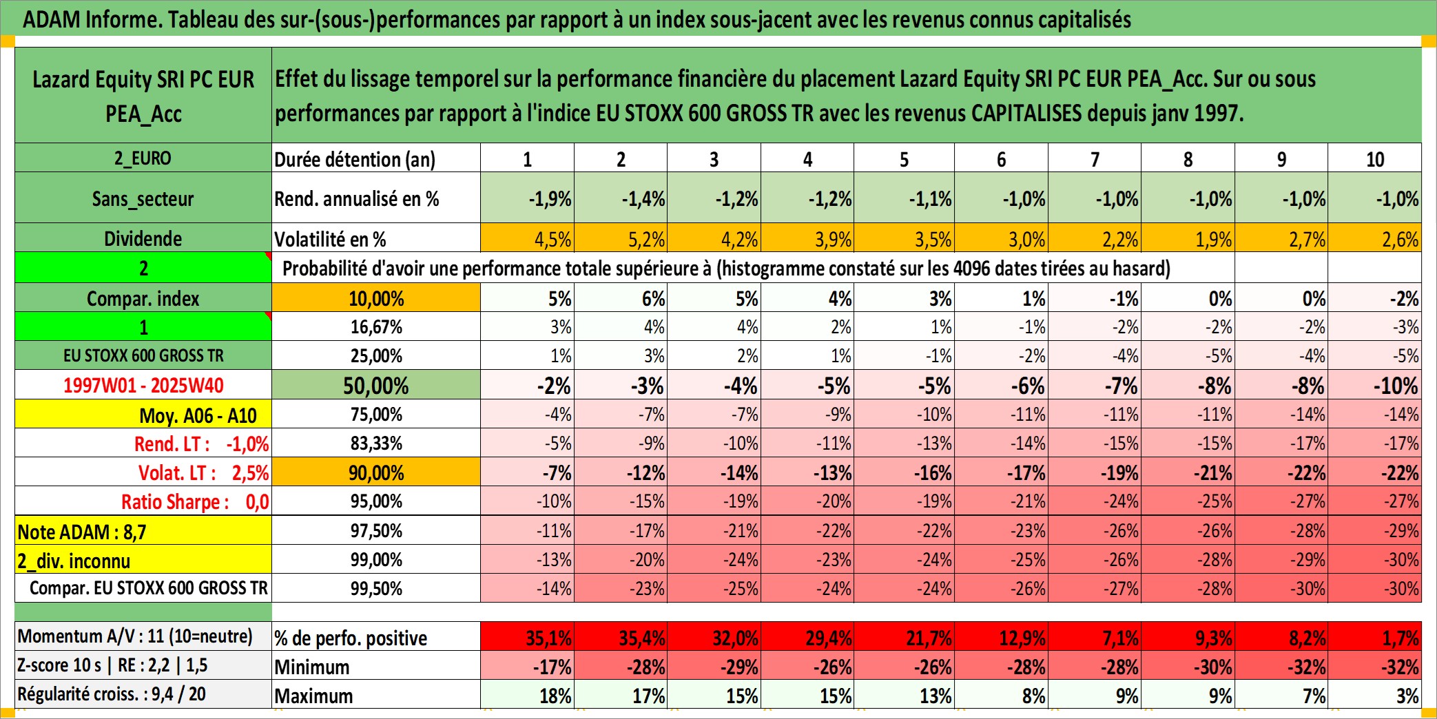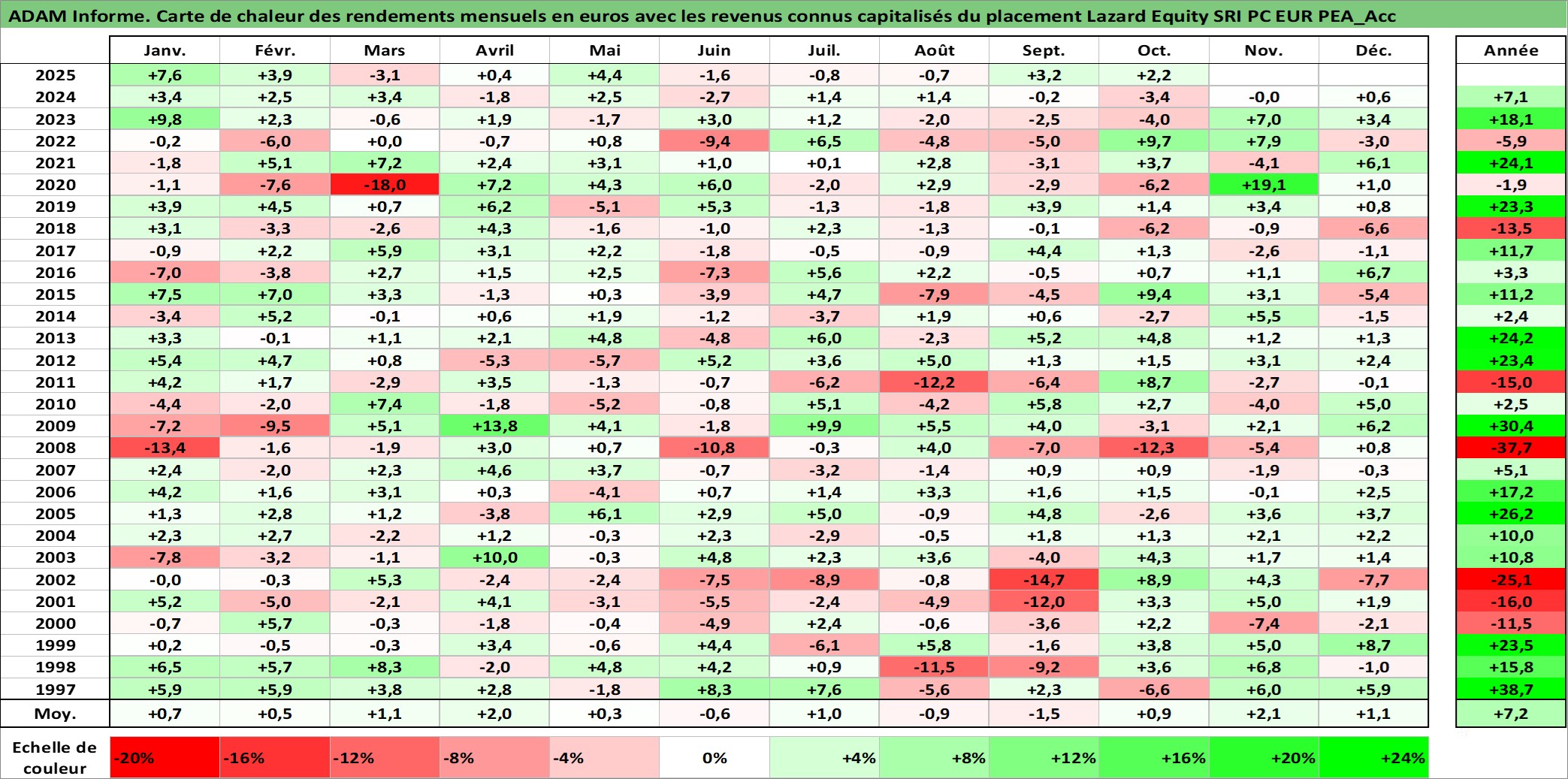 Site dédié aux investisseursPage dédiée sur site financeAnalyse des valorisations hebdomadaires du fonds Lazard Equity SRI PC EUR PEA_Acc. Cet actif est cote en EUR. Les valorisations couvrent les semaines 1997W01 a 2025W40. Les revenus de cet actif financier sont pris en compte depuis la semaine 1997W01. La note ESG de cet actif n'est pas connue.