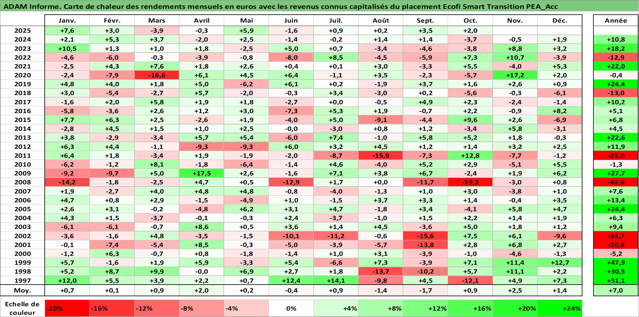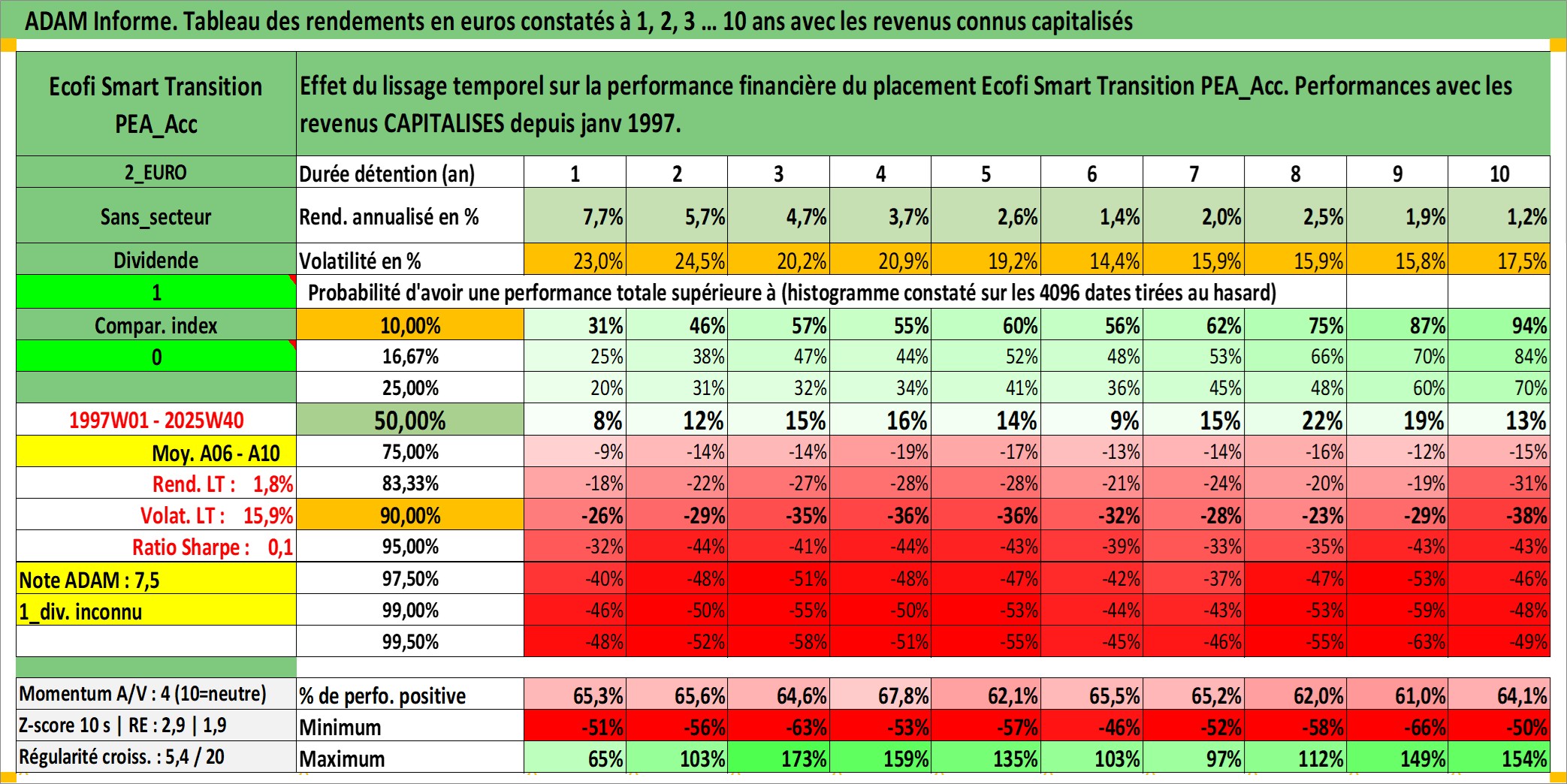 Site dédié aux investisseursPage dédiée sur site financeAnalyse des valorisations hebdomadaires du fonds Ecofi Smart Transition PEA_Acc. Cet actif est cote en EUR. Les valorisations couvrent les semaines 1997W01 a 2025W40. Les revenus de cet actif financier sont pris en compte depuis la semaine 1997W01. La note ESG de cet actif n'est pas connue.