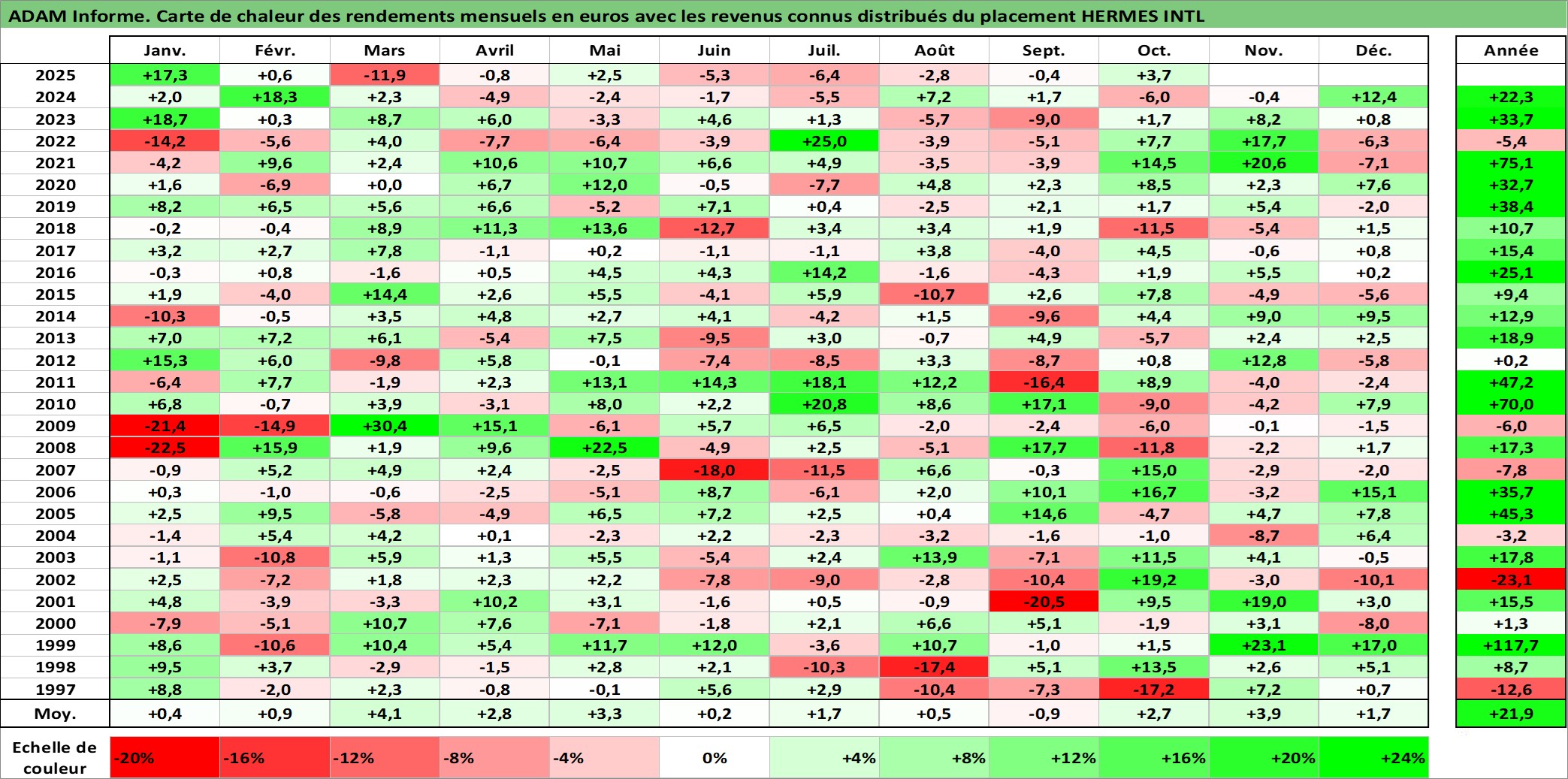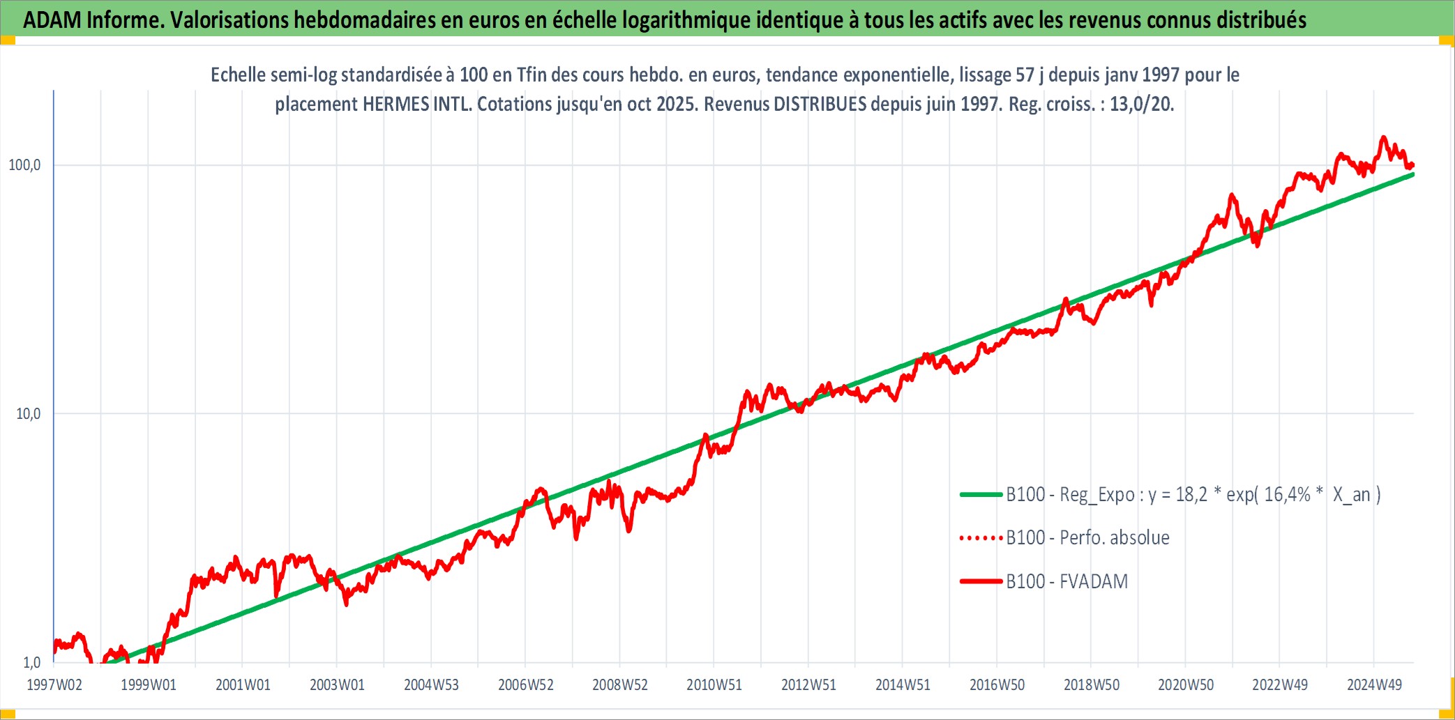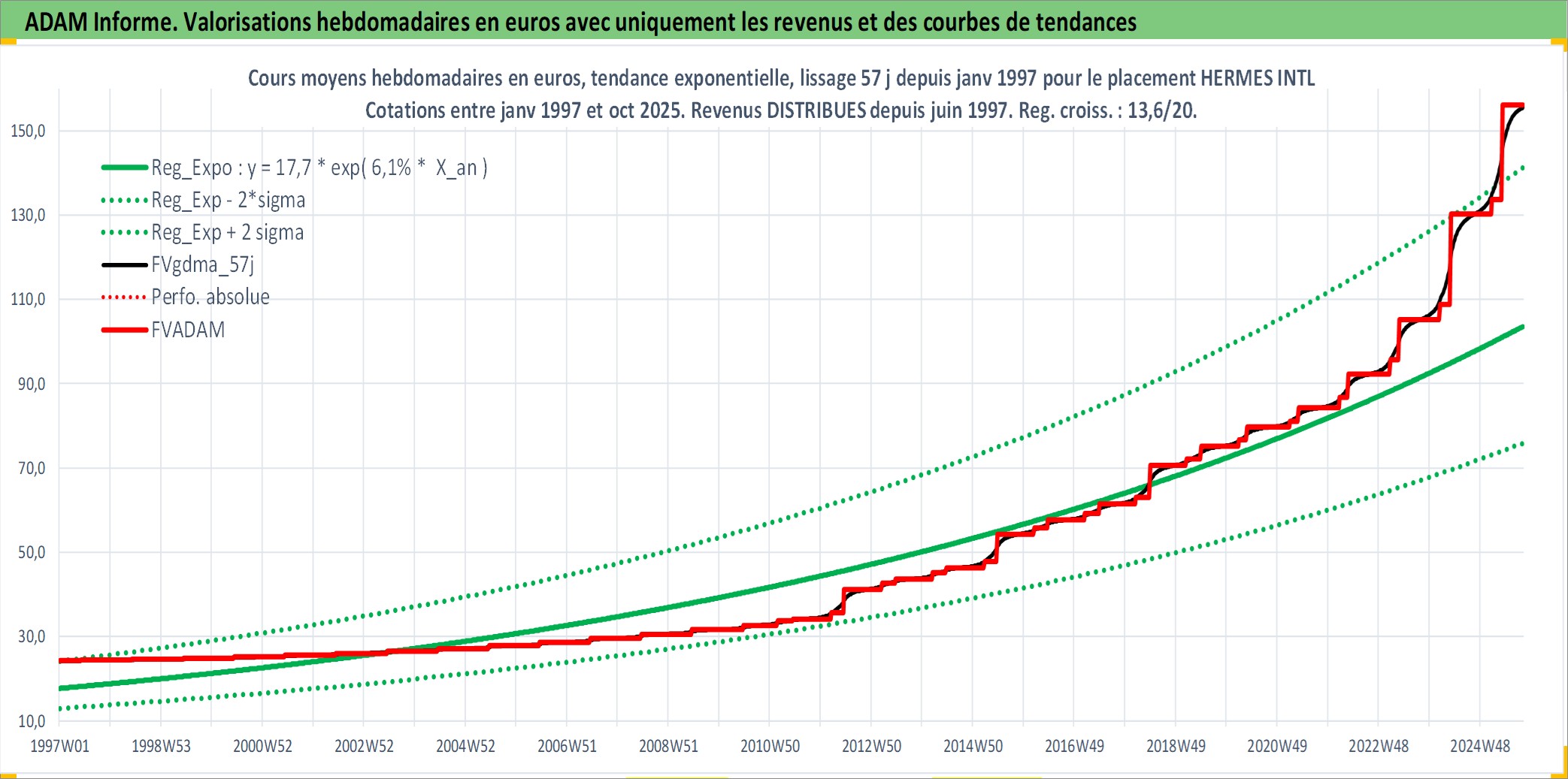 Site dédié aux investisseursPage dédiée sur site financeAnalyse des valorisations hebdomadaires de l'action HERMES INTL. Cet actif est cote en EUR. Les valorisations couvrent les semaines 1997W01 a 2025W40. Les revenus de cet actif financier sont pris en compte depuis la semaine 1997W23. La note globale ESG de cet actif est estimee a 17.0 (apres rebasage entre 0 et 20).