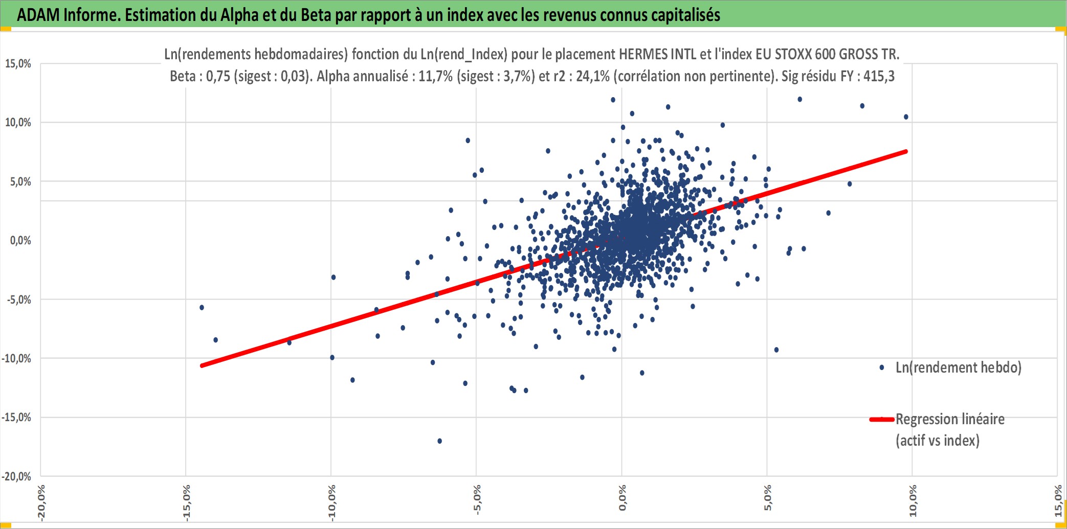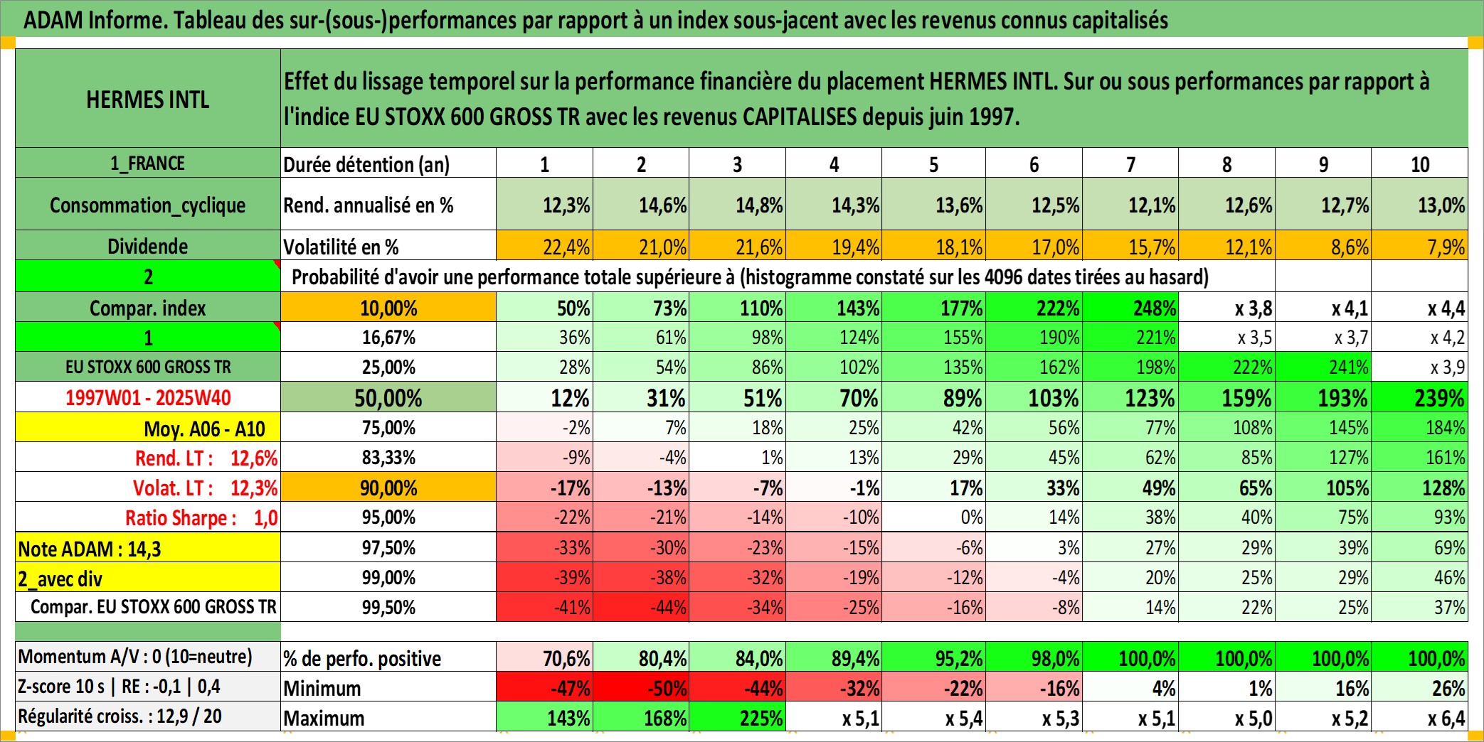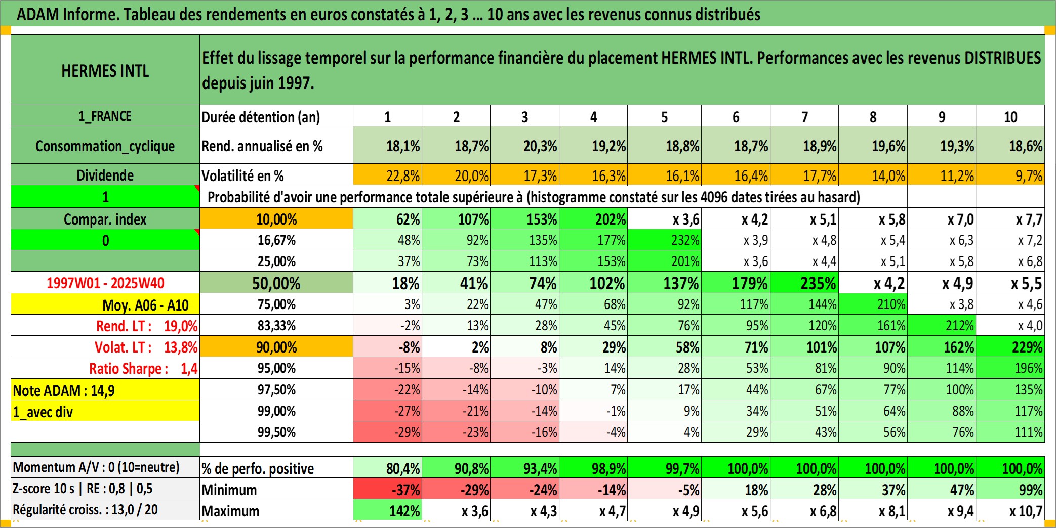 Site dédié aux investisseursPage dédiée sur site financeAnalyse des valorisations hebdomadaires de l'action HERMES INTL. Cet actif est cote en EUR. Les valorisations couvrent les semaines 1997W01 a 2025W40. Les revenus de cet actif financier sont pris en compte depuis la semaine 1997W23. La note globale ESG de cet actif est estimee a 17.0 (apres rebasage entre 0 et 20).