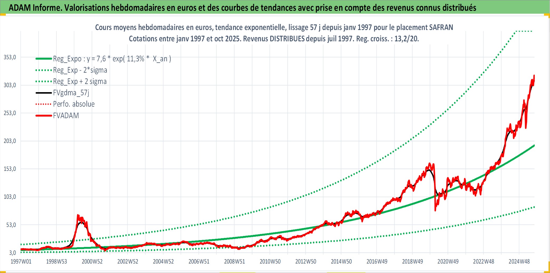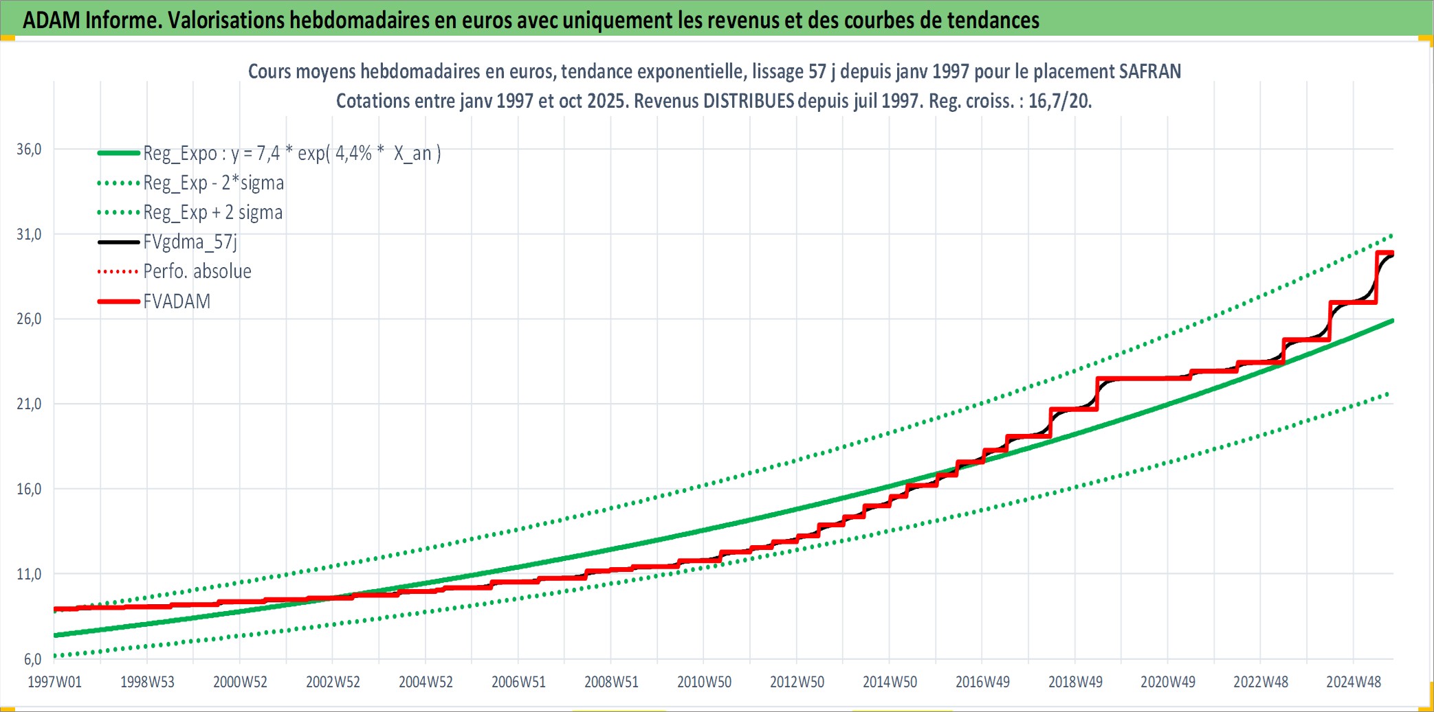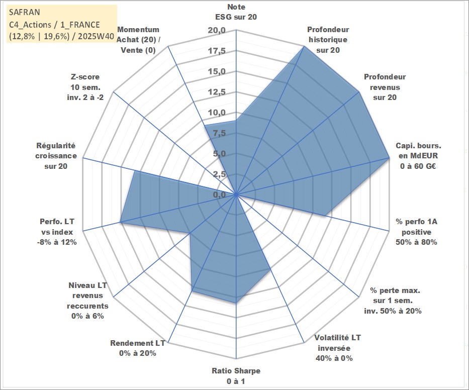 Site dédié aux investisseursPage dédiée sur site financeAnalyse des valorisations hebdomadaires de l'action SAFRAN. Cet actif est cote en EUR. Les valorisations couvrent les semaines 1997W01 a 2025W40. Les revenus de cet actif financier sont pris en compte depuis la semaine 1997W28. La note globale ESG de cet actif est estimee a 9.0 (apres rebasage entre 0 et 20).