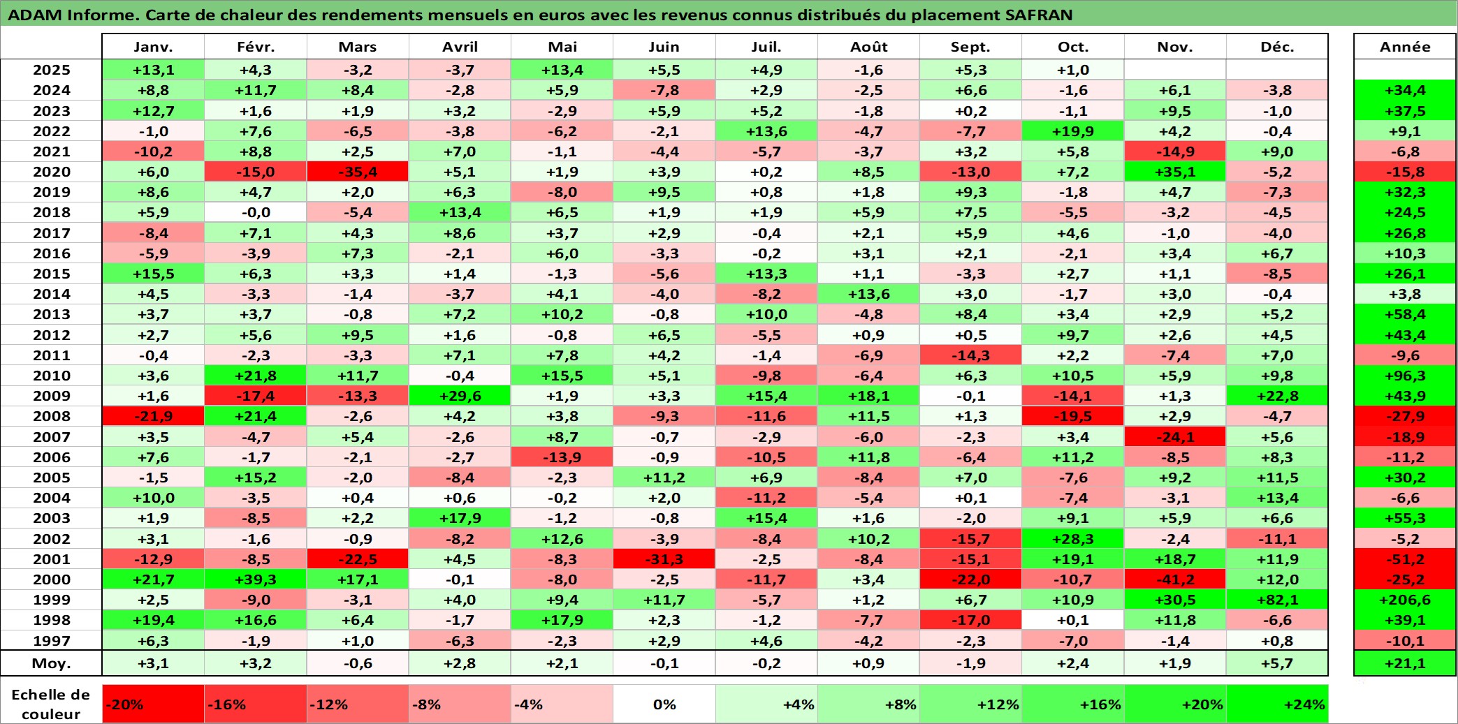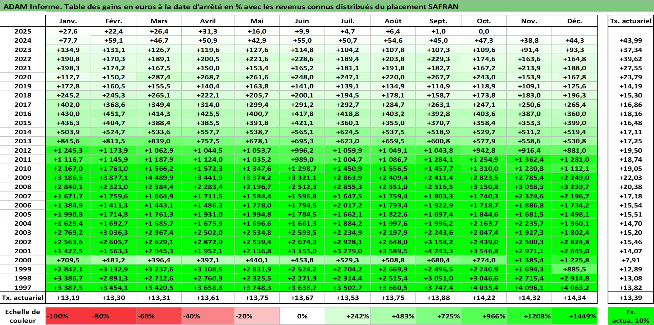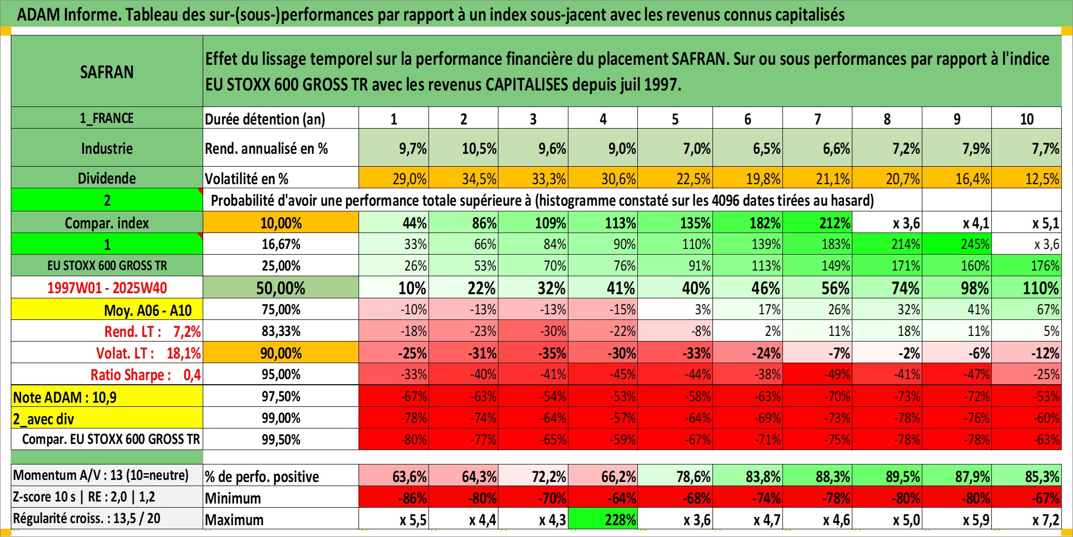 Site dédié aux investisseursPage dédiée sur site financeAnalyse des valorisations hebdomadaires de l'action SAFRAN. Cet actif est cote en EUR. Les valorisations couvrent les semaines 1997W01 a 2025W40. Les revenus de cet actif financier sont pris en compte depuis la semaine 1997W28. La note globale ESG de cet actif est estimee a 9.0 (apres rebasage entre 0 et 20).