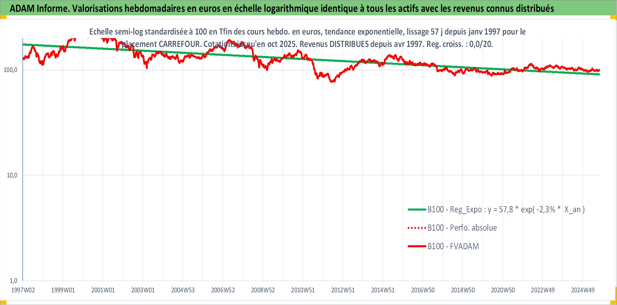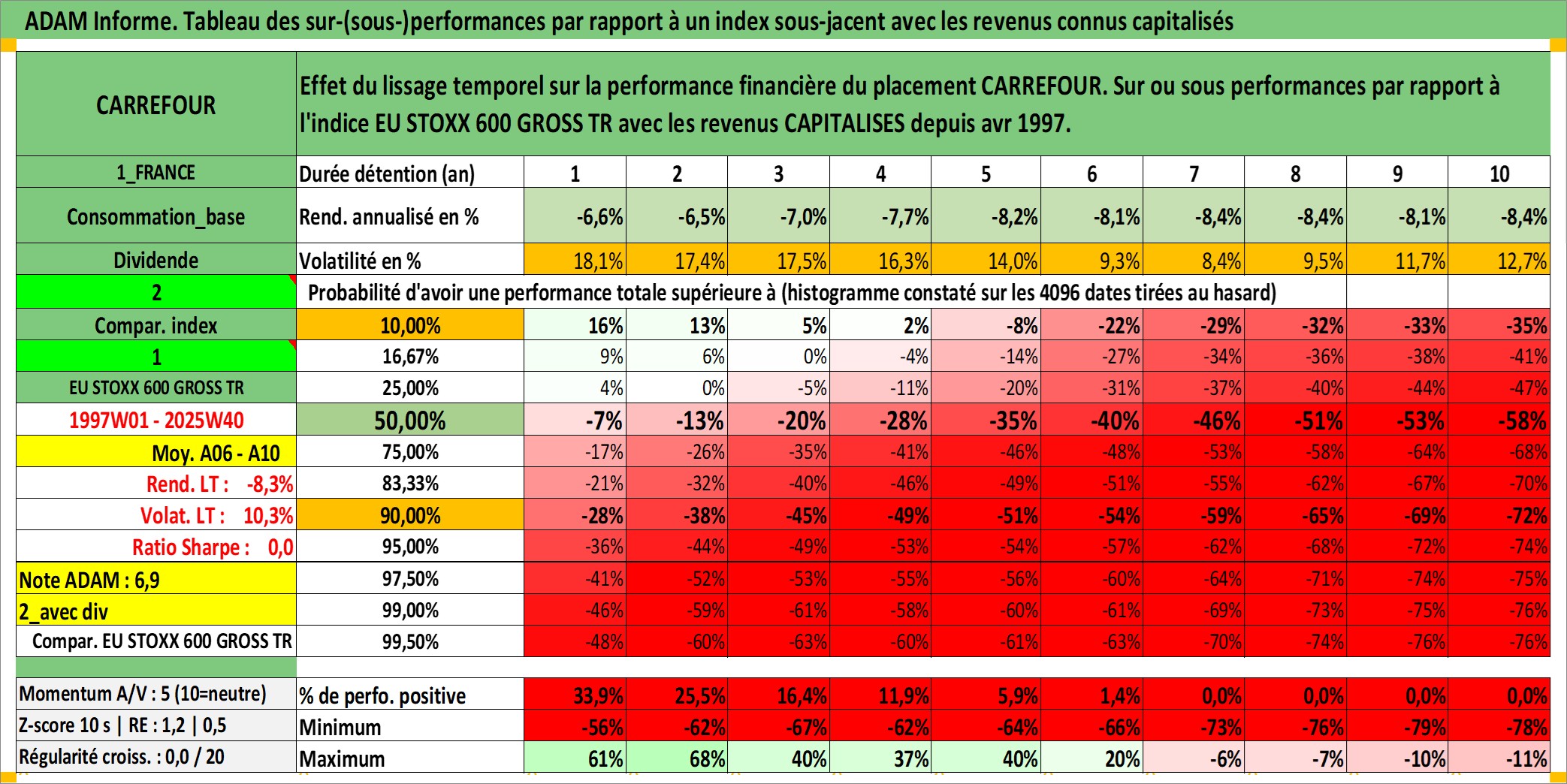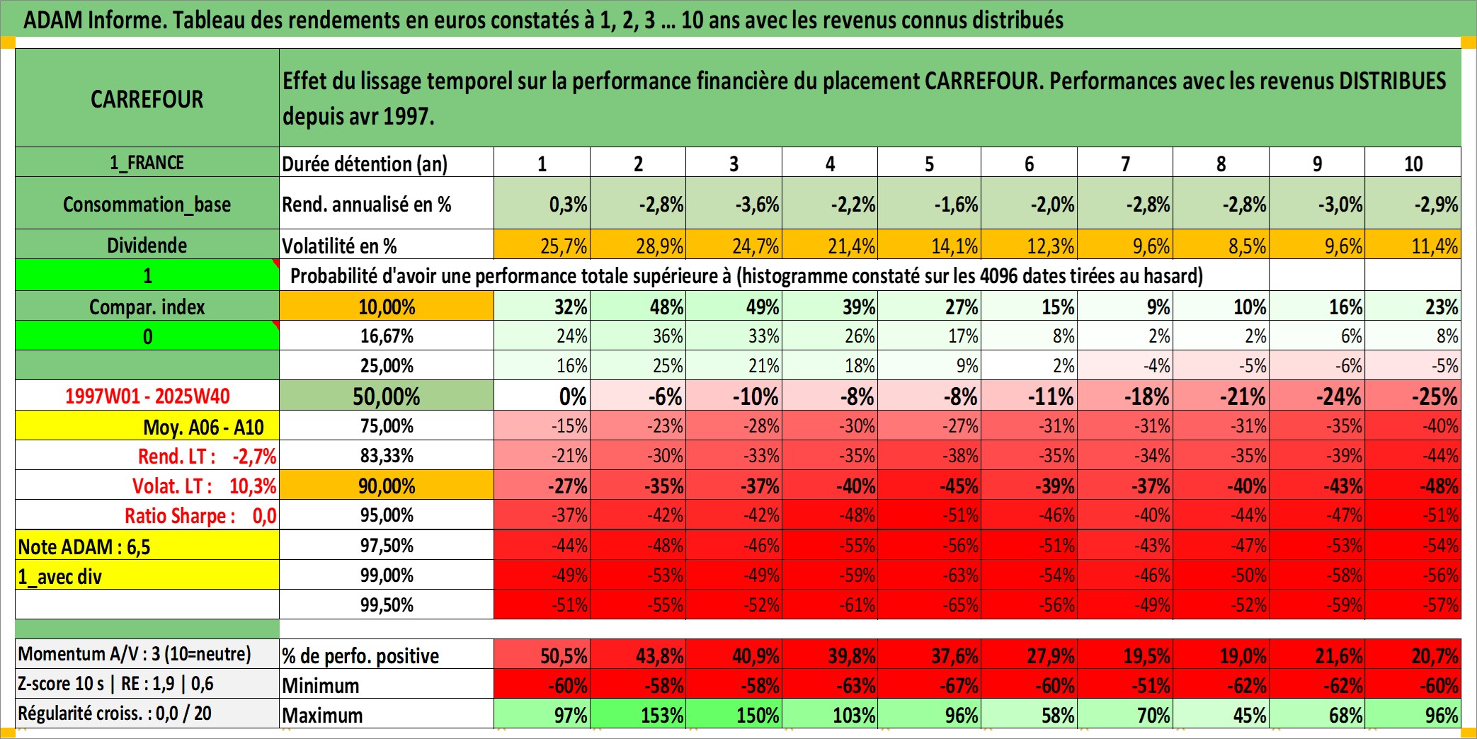 Site dédié aux investisseursPage dédiée sur site financeAnalyse des valorisations hebdomadaires de l'action CARREFOUR. Cet actif est cote en EUR. Les valorisations couvrent les semaines 1997W01 a 2025W40. Les revenus de cet actif financier sont pris en compte depuis la semaine 1997W18. La note globale ESG de cet actif est estimee a 9.0 (apres rebasage entre 0 et 20).