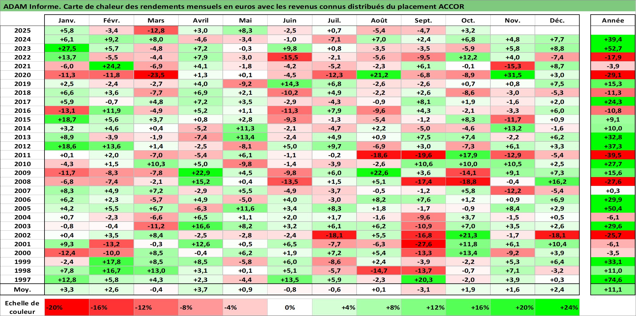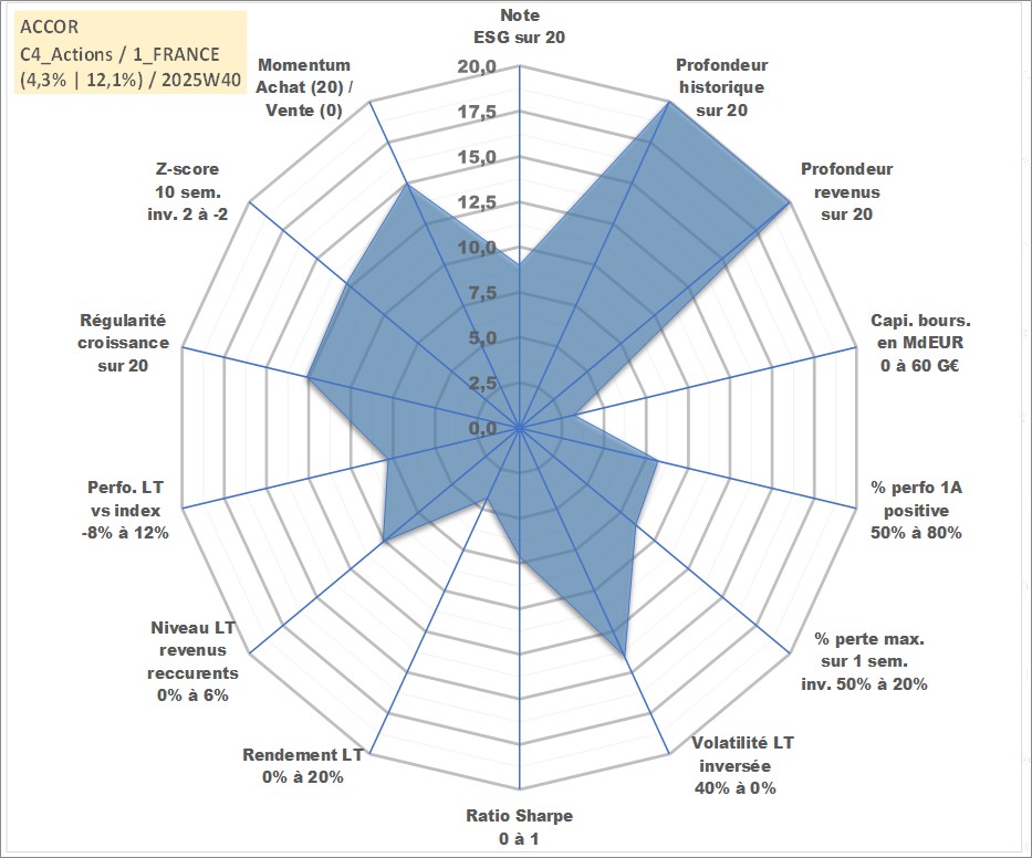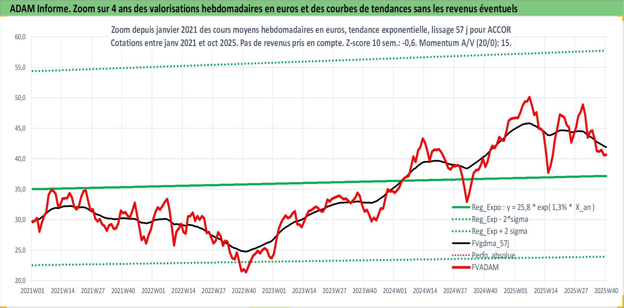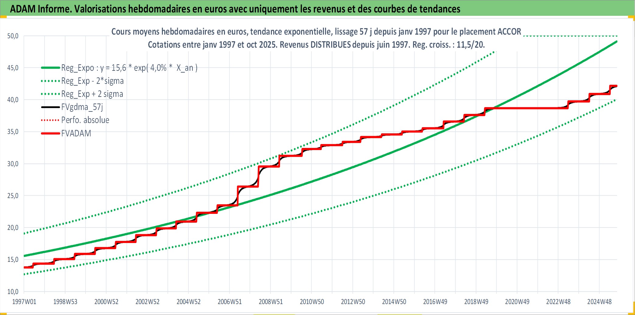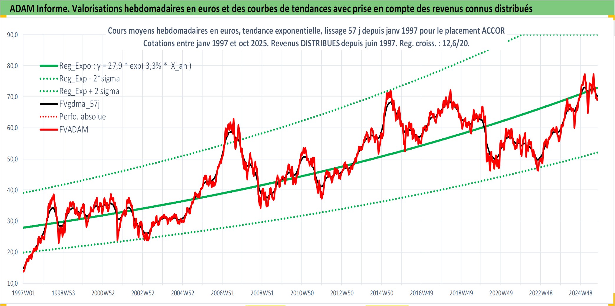 Site dédié aux investisseursPage dédiée sur site financeAnalyse des valorisations hebdomadaires de l'action ACCOR. Cet actif est cote en EUR. Les valorisations couvrent les semaines 1997W01 a 2025W40. Les revenus de cet actif financier sont pris en compte depuis la semaine 1997W24. La note globale ESG de cet actif est estimee a 9.0 (apres rebasage entre 0 et 20).