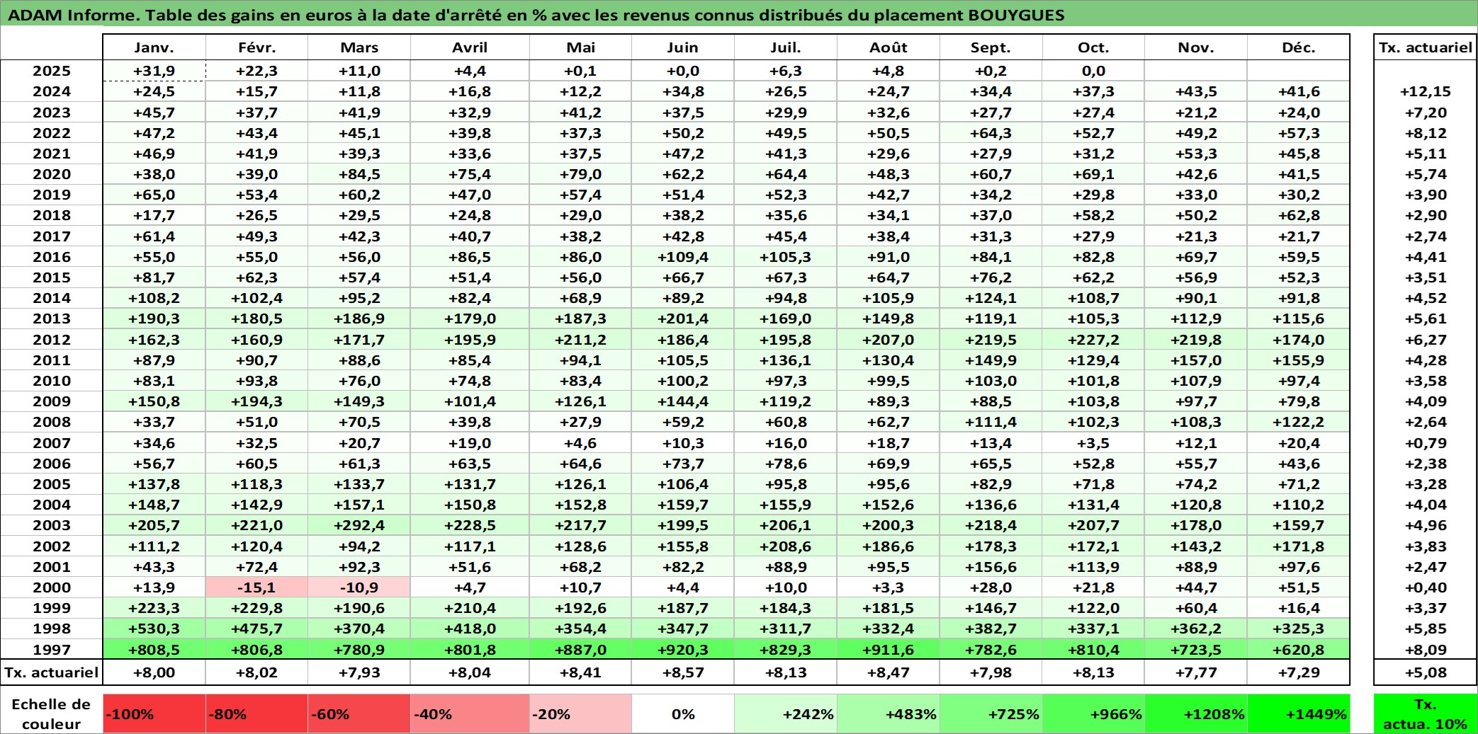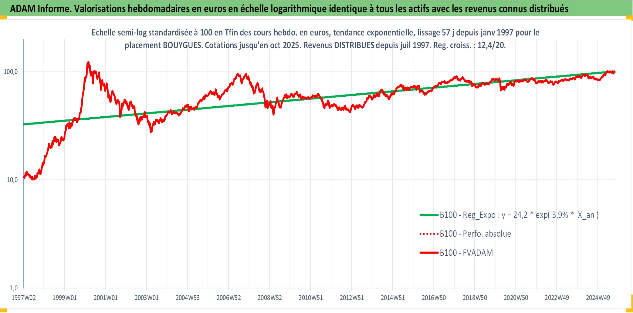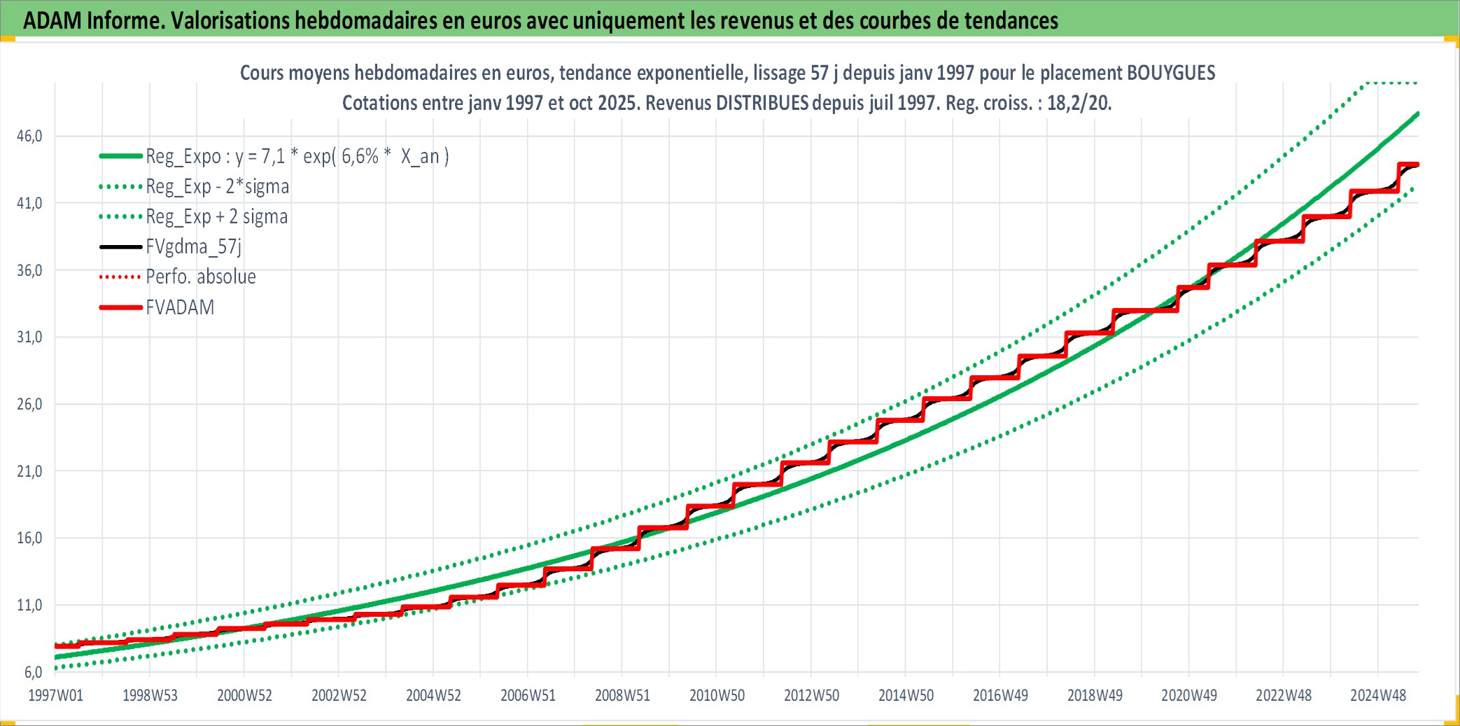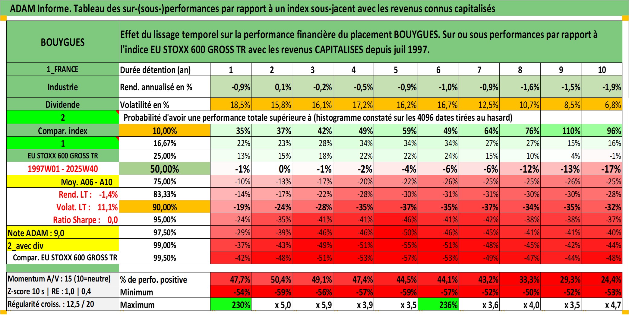 Site dédié aux investisseursPage dédiée sur site financeAnalyse des valorisations hebdomadaires de l'action BOUYGUES. Cet actif est cote en EUR. Les valorisations couvrent les semaines 1997W01 a 2025W40. Les revenus de cet actif financier sont pris en compte depuis la semaine 1997W28. La note globale ESG de cet actif est estimee a 3.0 (apres rebasage entre 0 et 20).