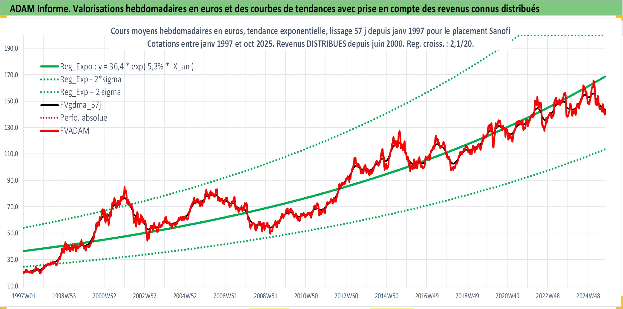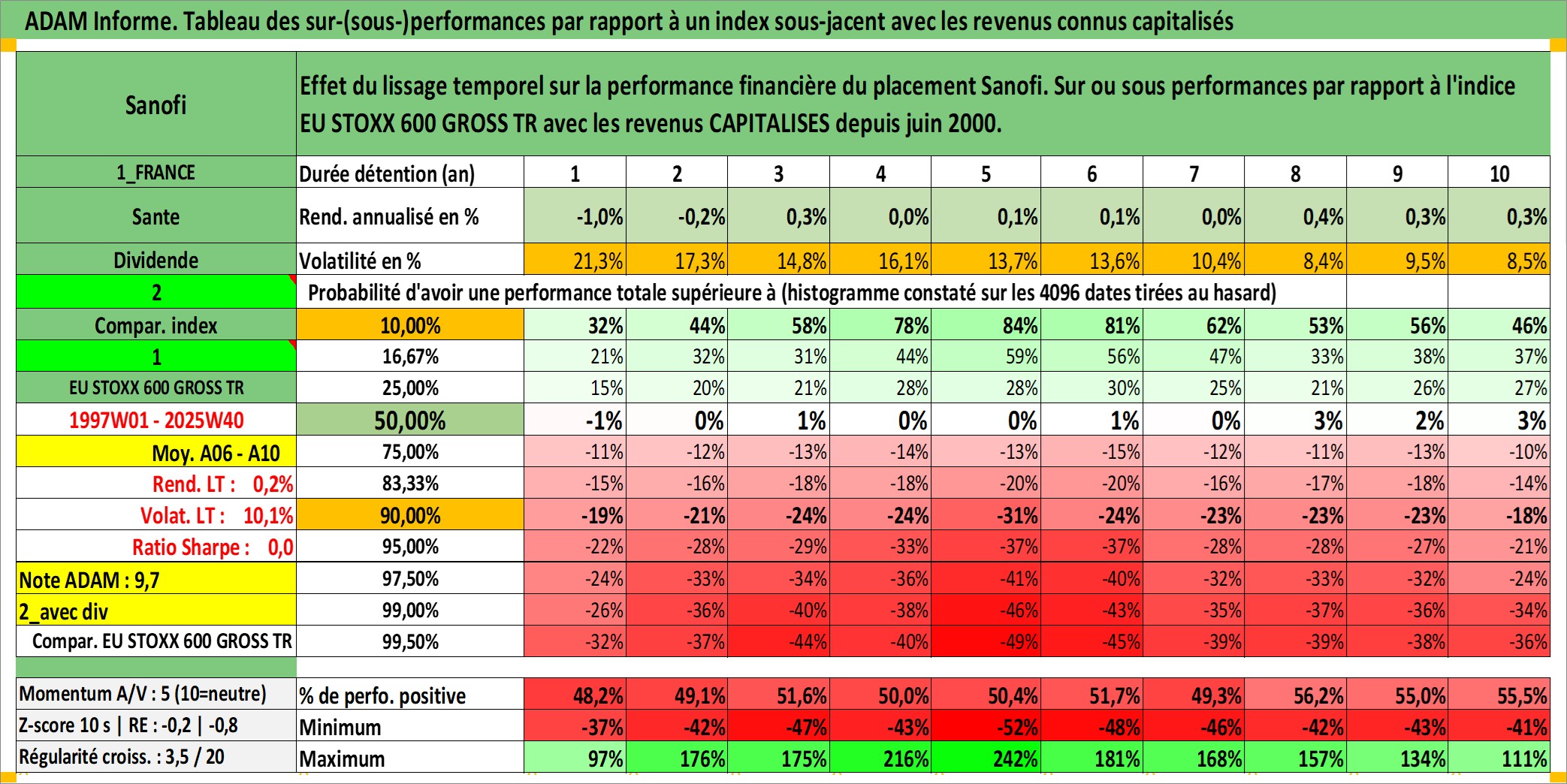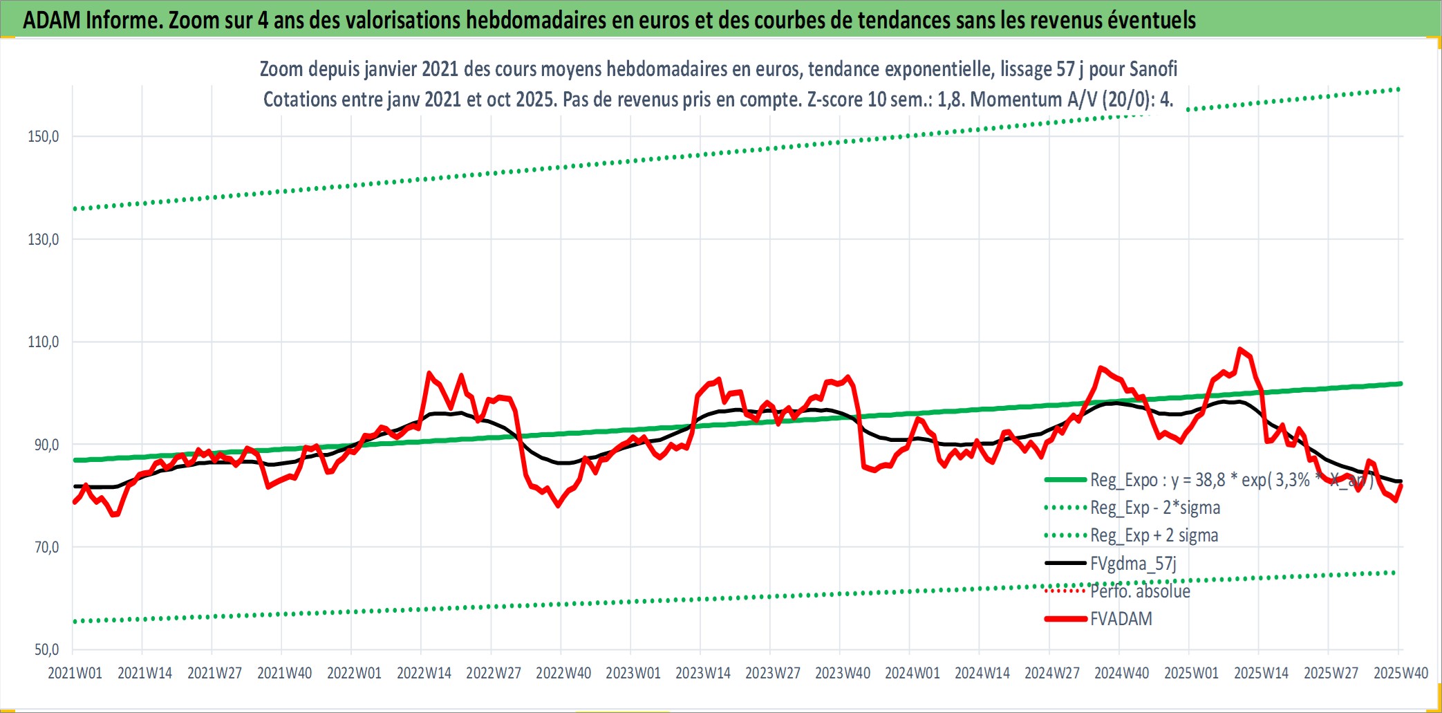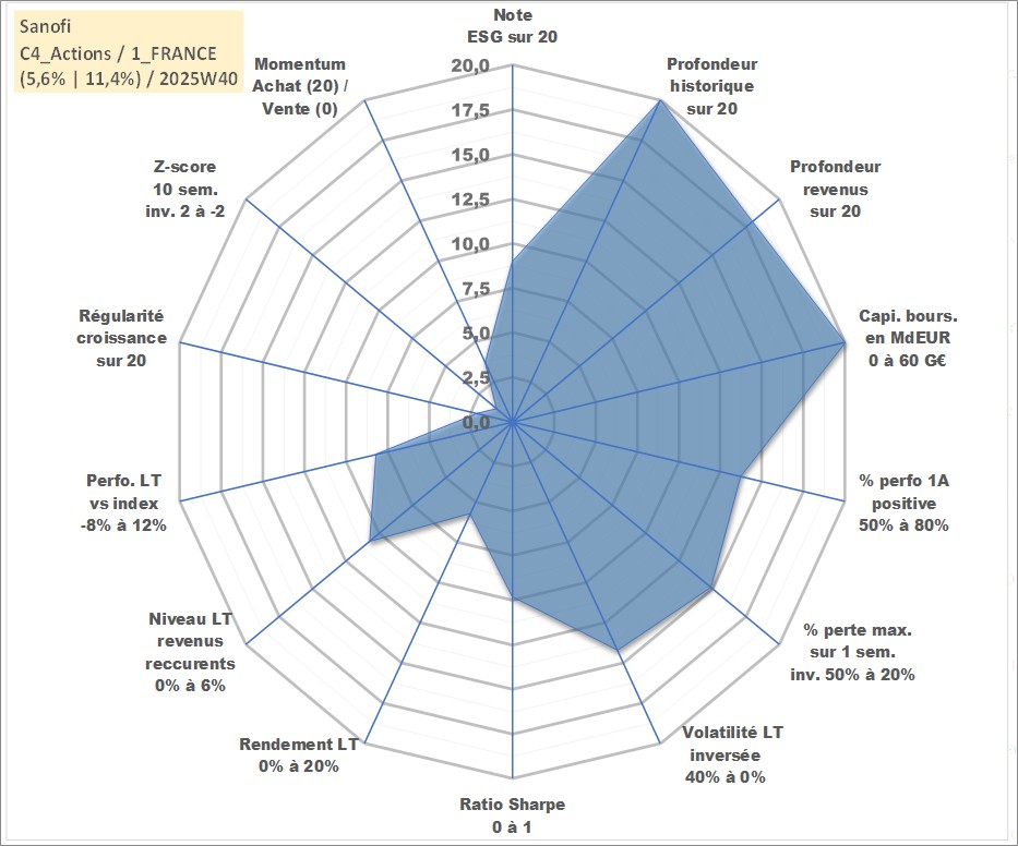 Site dédié aux investisseursPage dédiée sur site financeAnalyse des valorisations hebdomadaires de l'action Sanofi. Cet actif est cote en EUR. Les valorisations couvrent les semaines 1997W01 a 2025W40. Les revenus de cet actif financier sont pris en compte depuis la semaine 2000W23. La note globale ESG de cet actif est estimee a 9.0 (apres rebasage entre 0 et 20).