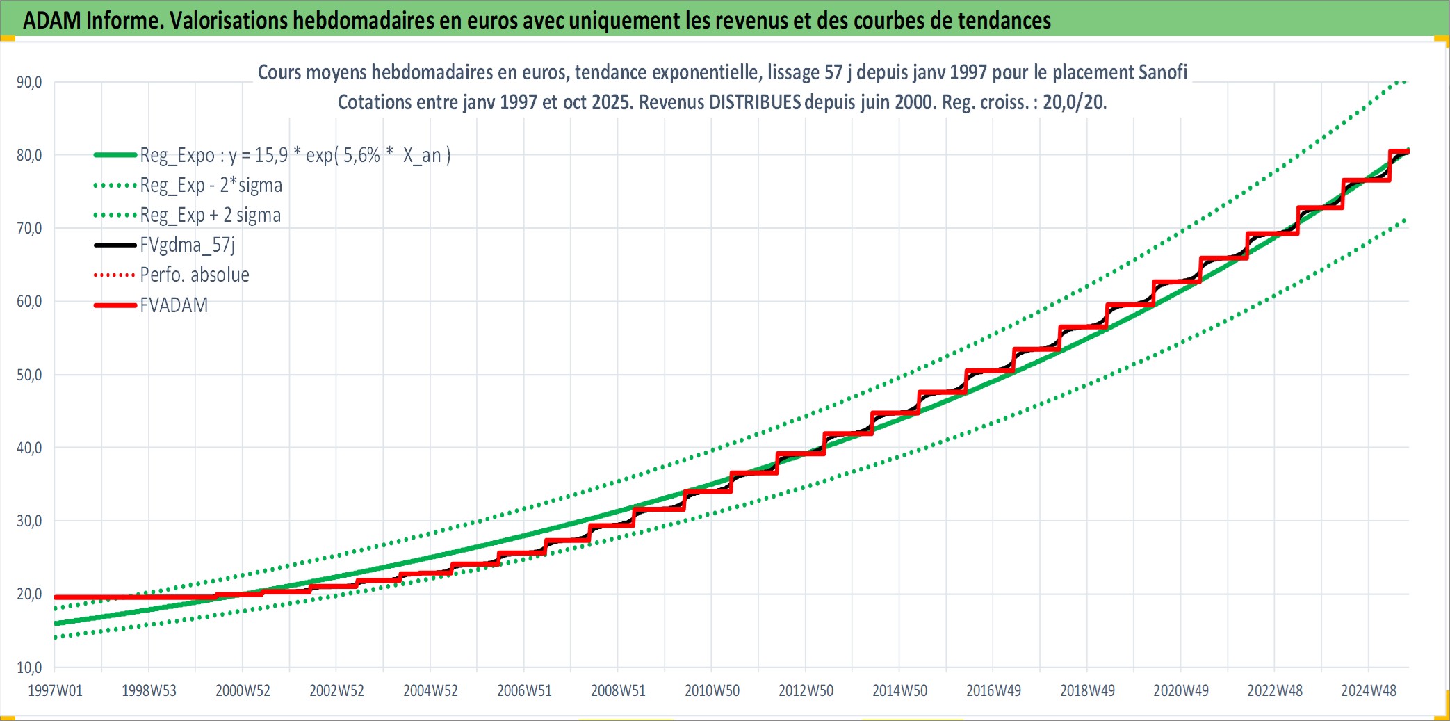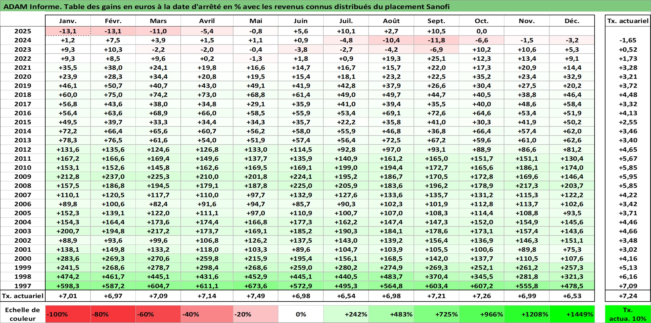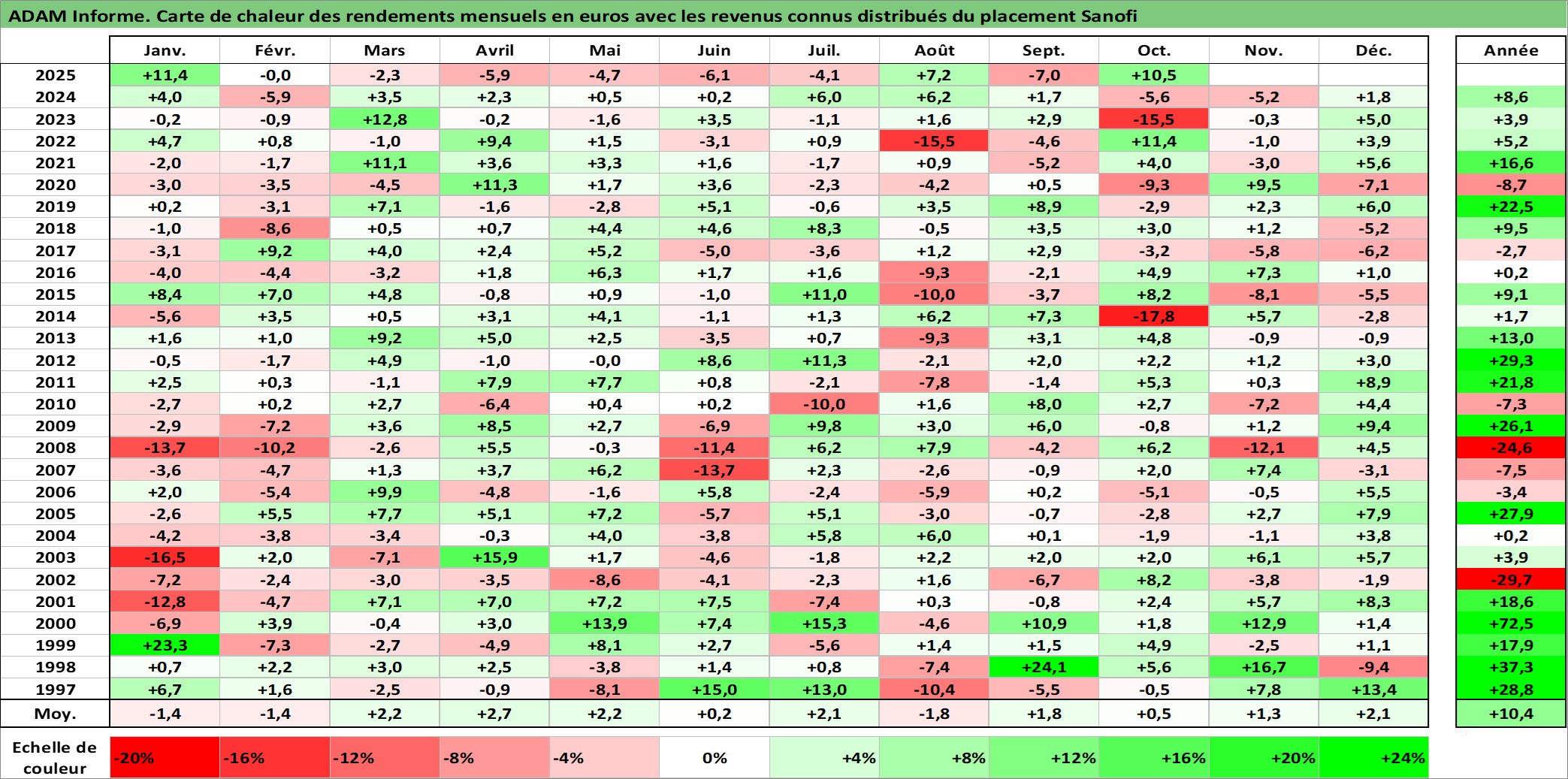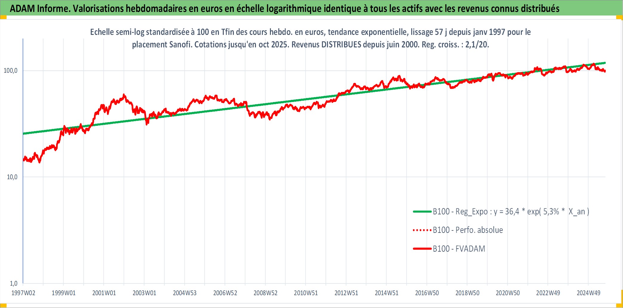 Site dédié aux investisseursPage dédiée sur site financeAnalyse des valorisations hebdomadaires de l'action Sanofi. Cet actif est cote en EUR. Les valorisations couvrent les semaines 1997W01 a 2025W40. Les revenus de cet actif financier sont pris en compte depuis la semaine 2000W23. La note globale ESG de cet actif est estimee a 9.0 (apres rebasage entre 0 et 20).