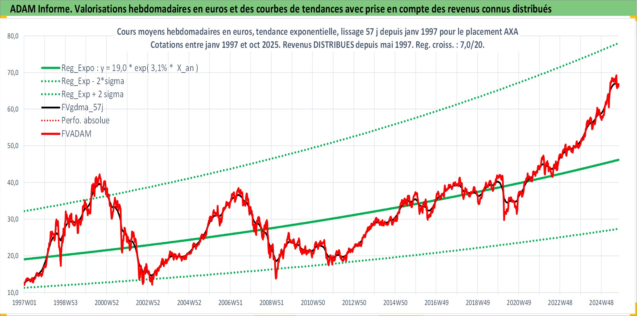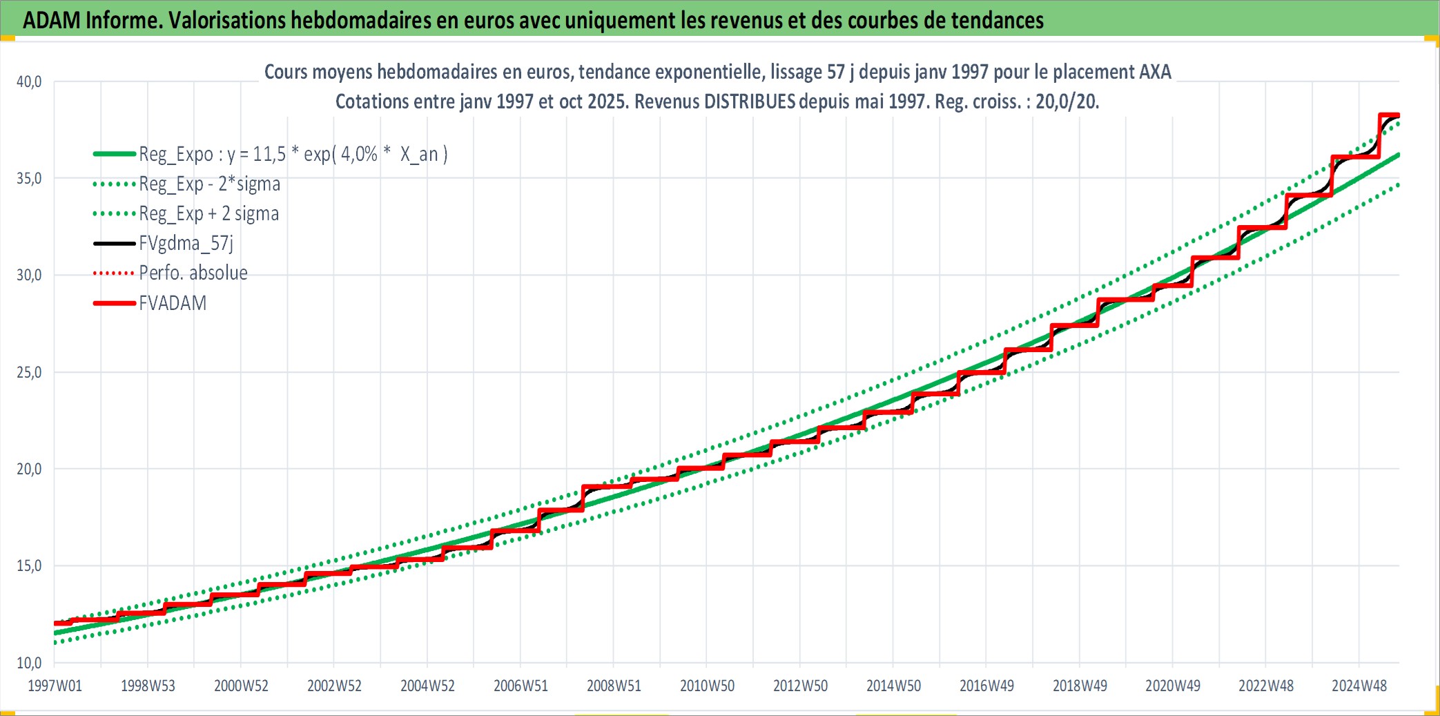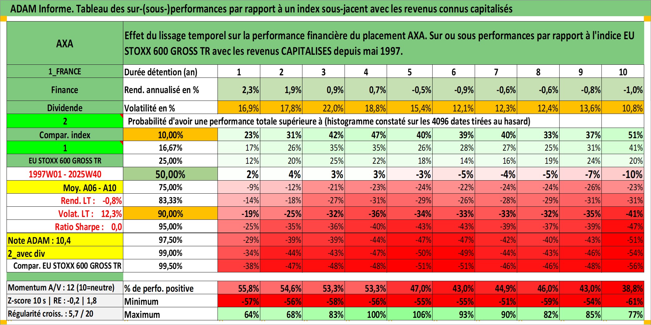 Site dédié aux investisseursPage dédiée sur site financeAnalyse des valorisations hebdomadaires de l'action AXA. Cet actif est cote en EUR. Les valorisations couvrent les semaines 1997W01 a 2025W40. Les revenus de cet actif financier sont pris en compte depuis la semaine 1997W20. La note globale ESG de cet actif est estimee a 12.0 (apres rebasage entre 0 et 20).
