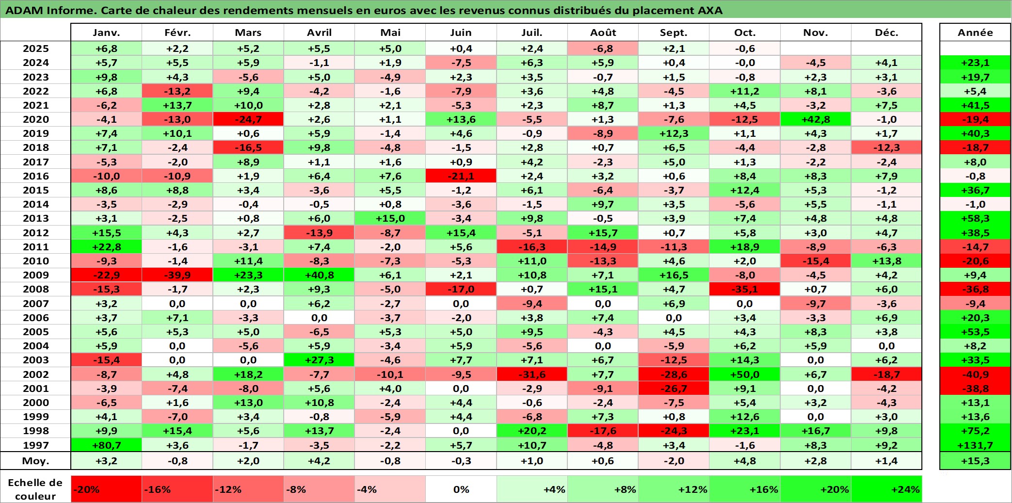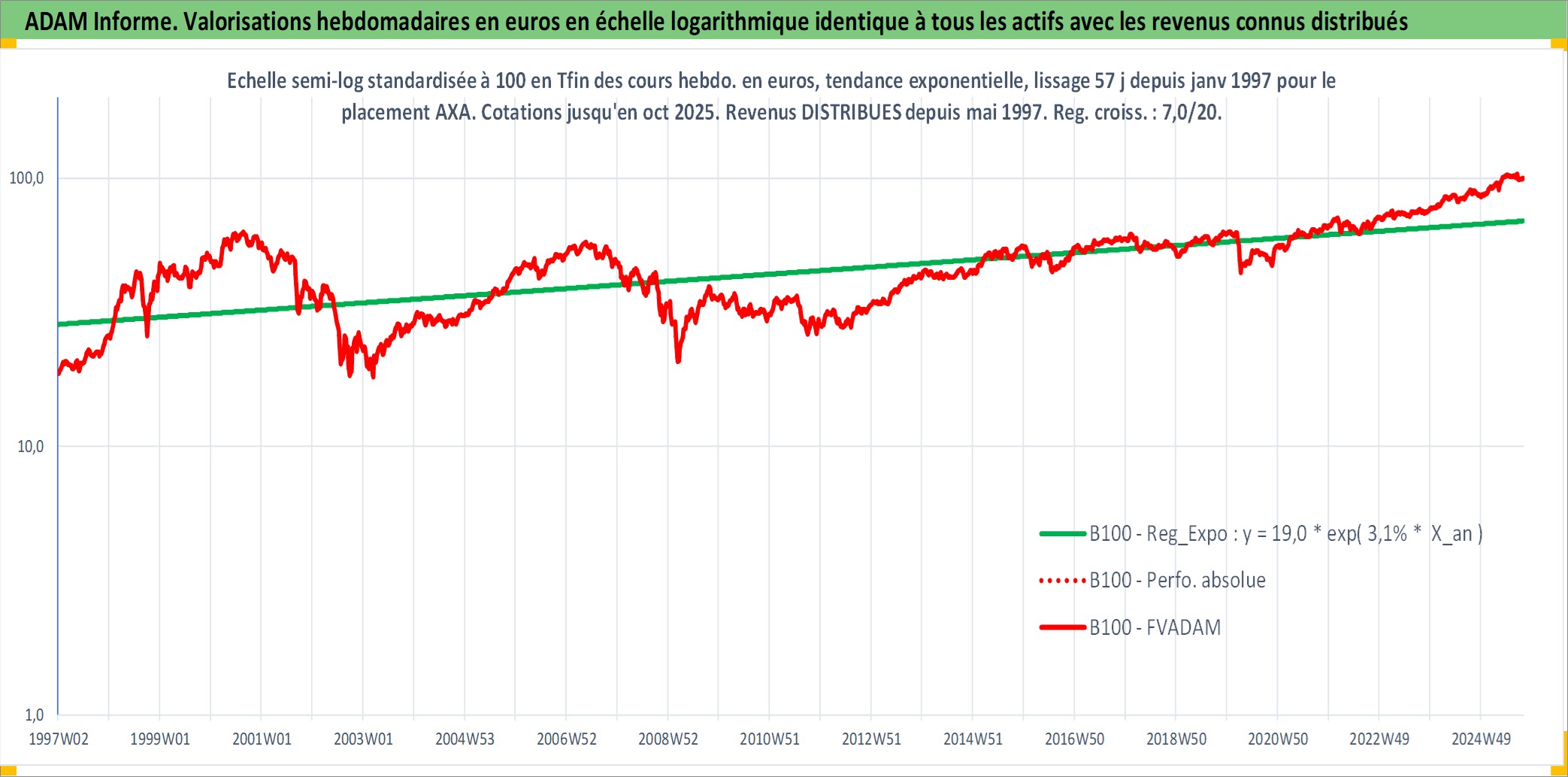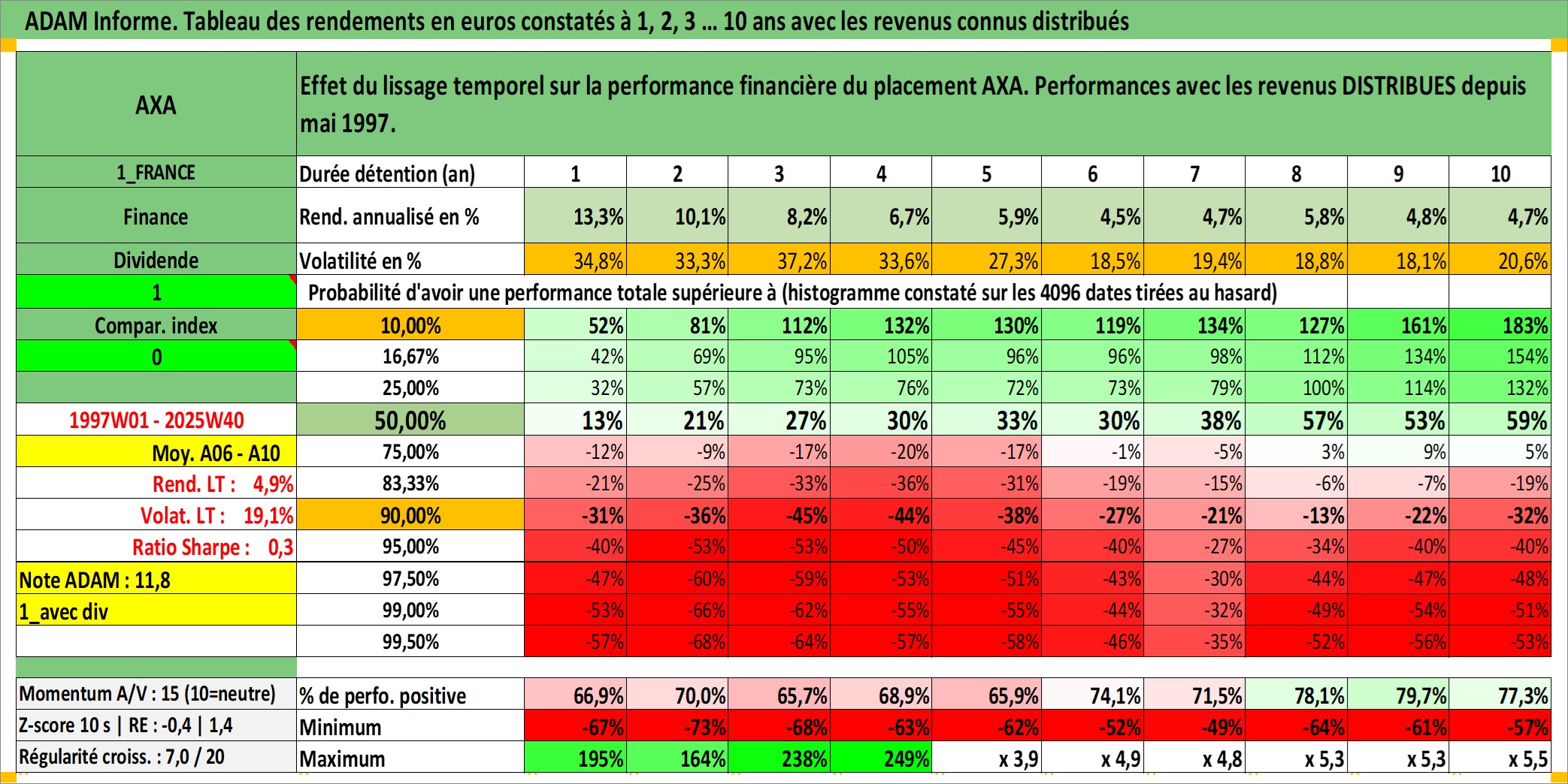 Site dédié aux investisseursPage dédiée sur site financeAnalyse des valorisations hebdomadaires de l'action AXA. Cet actif est cote en EUR. Les valorisations couvrent les semaines 1997W01 a 2025W40. Les revenus de cet actif financier sont pris en compte depuis la semaine 1997W20. La note globale ESG de cet actif est estimee a 12.0 (apres rebasage entre 0 et 20).