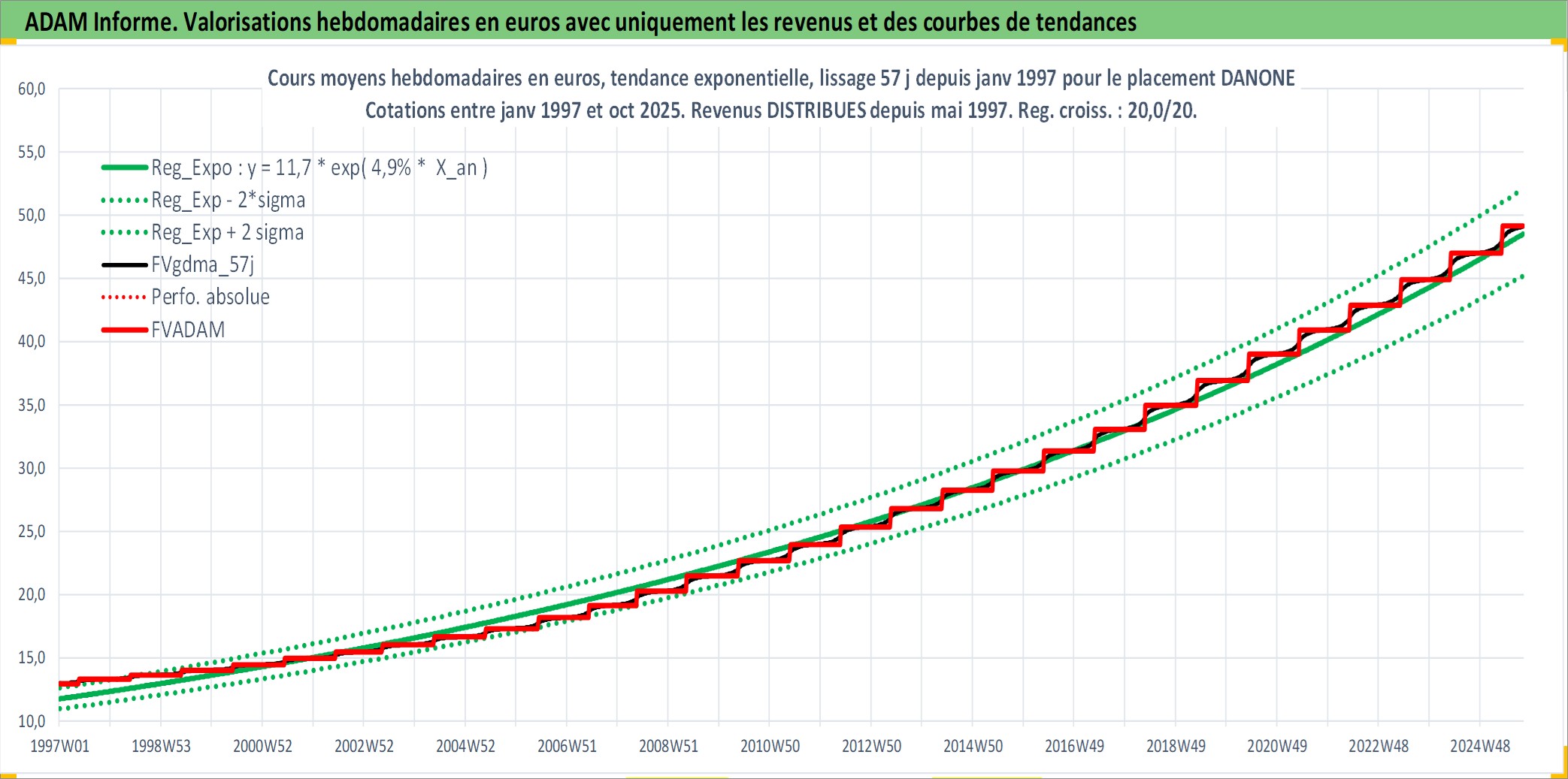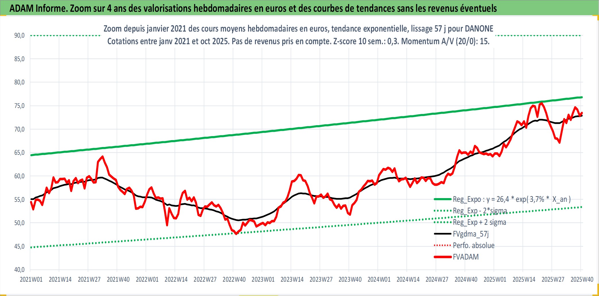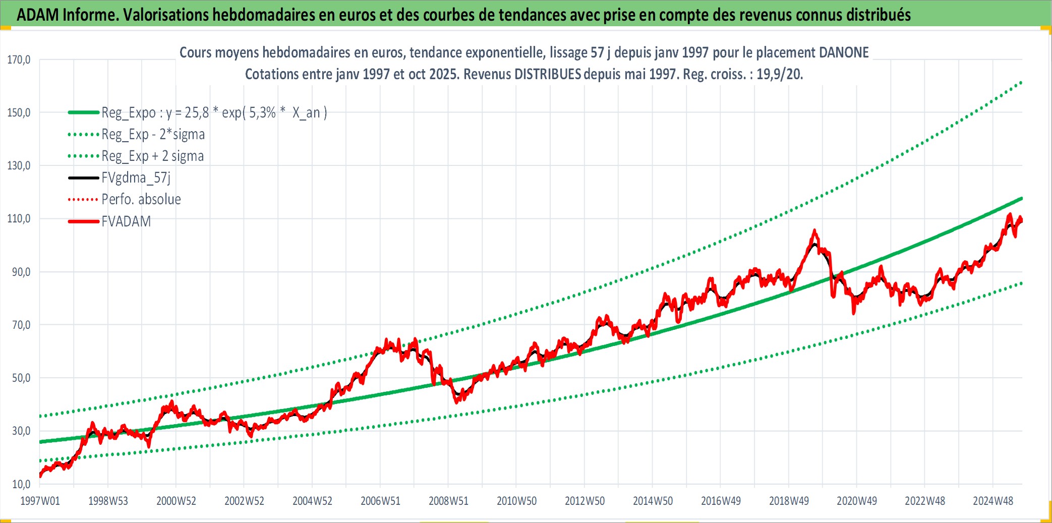 Site dédié aux investisseursPage dédiée sur site financeAnalyse des valorisations hebdomadaires de l'action DANONE. Cet actif est cote en EUR. Les valorisations couvrent les semaines 1997W01 a 2025W40. Les revenus de cet actif financier sont pris en compte depuis la semaine 1997W21. La note globale ESG de cet actif est estimee a 10.0 (apres rebasage entre 0 et 20).