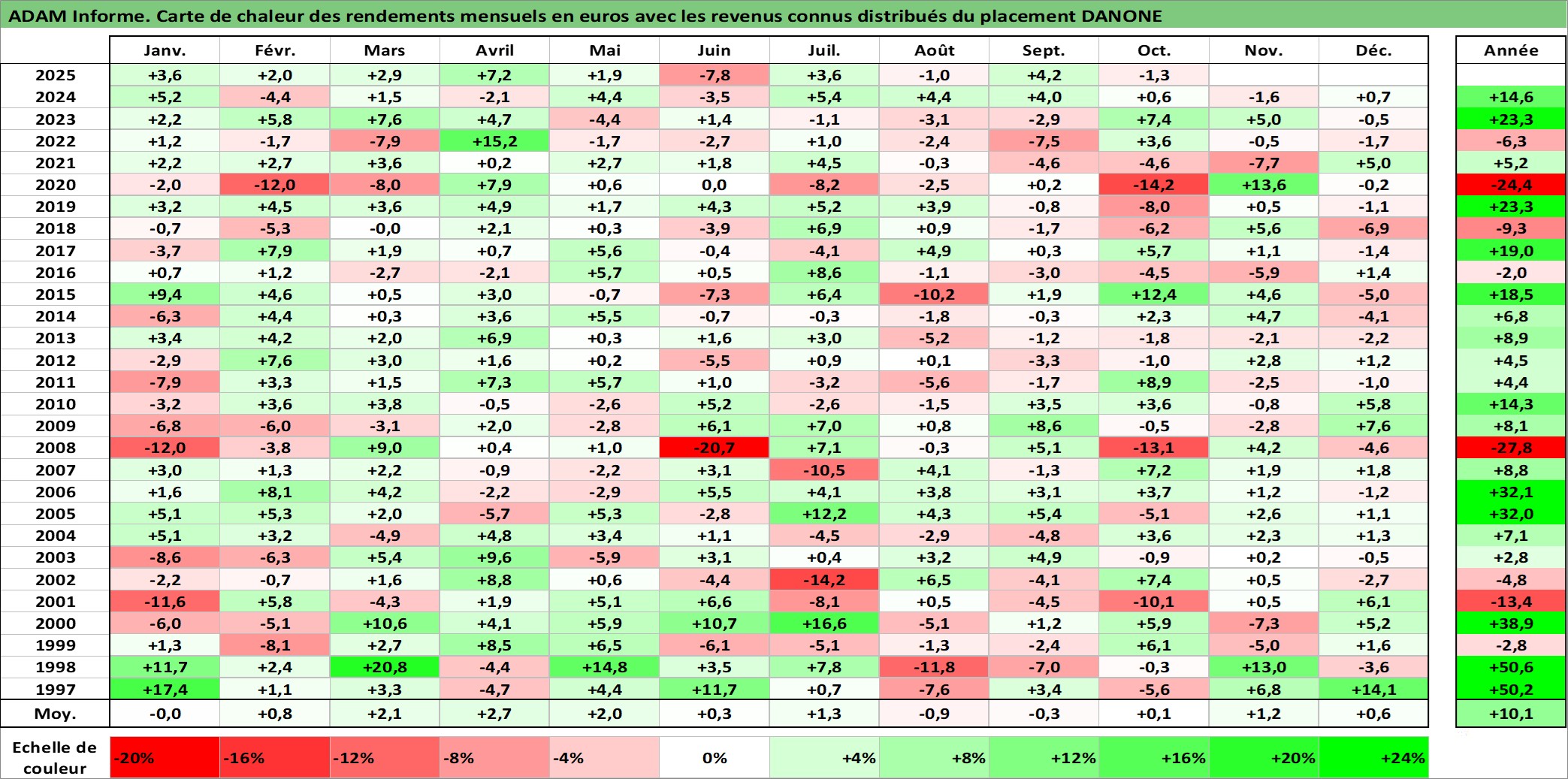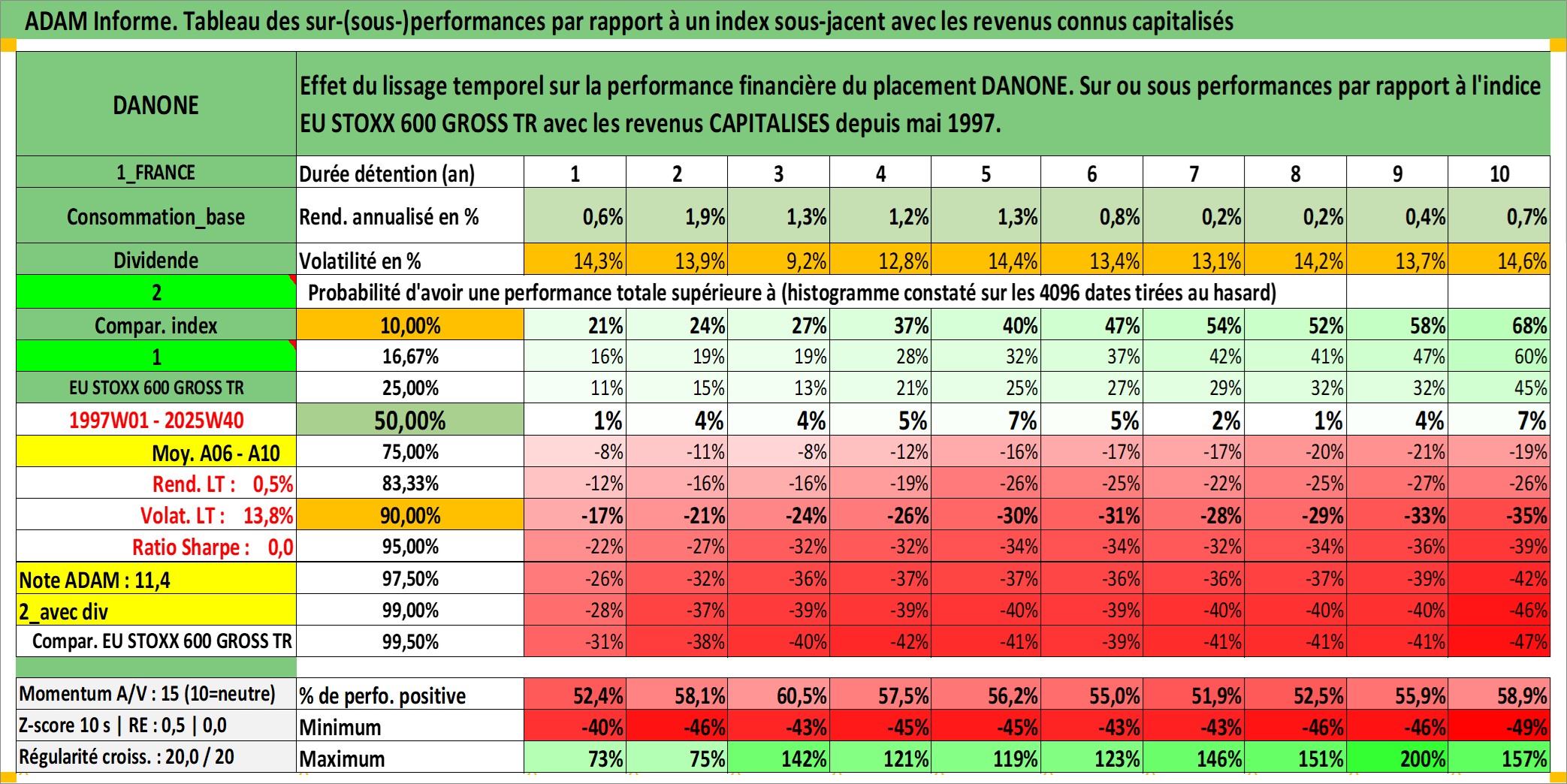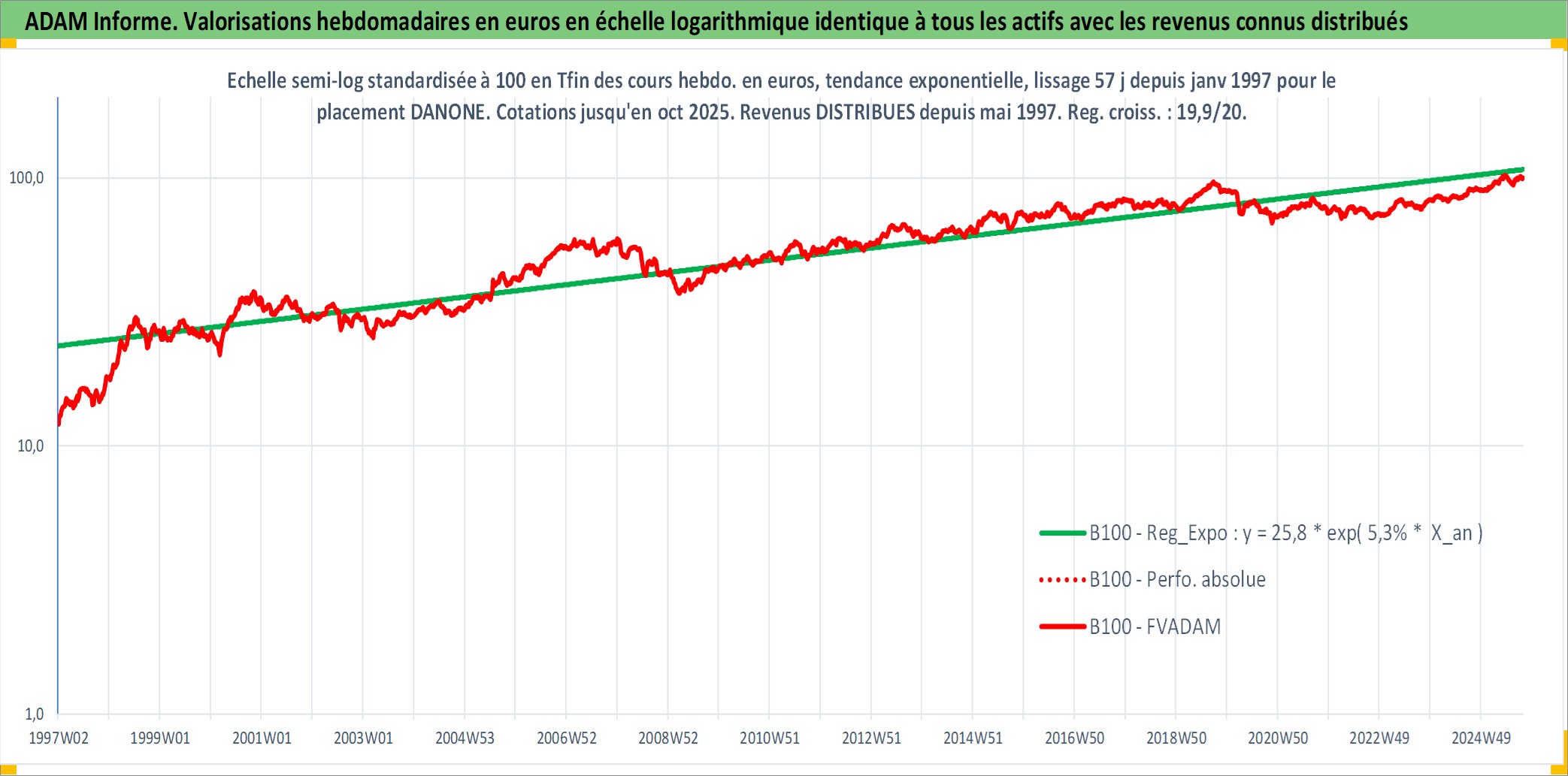 Site dédié aux investisseursPage dédiée sur site financeAnalyse des valorisations hebdomadaires de l'action DANONE. Cet actif est cote en EUR. Les valorisations couvrent les semaines 1997W01 a 2025W40. Les revenus de cet actif financier sont pris en compte depuis la semaine 1997W21. La note globale ESG de cet actif est estimee a 10.0 (apres rebasage entre 0 et 20).