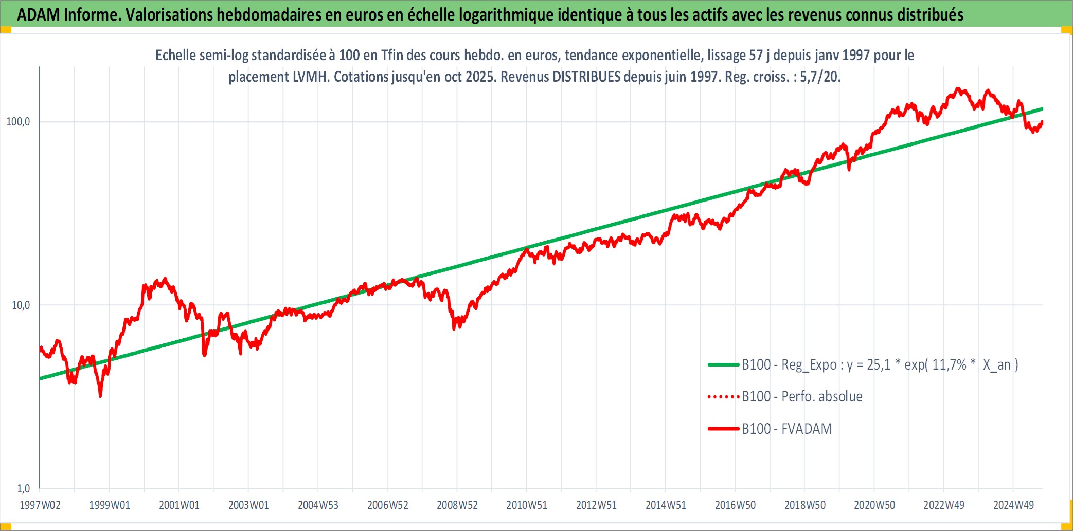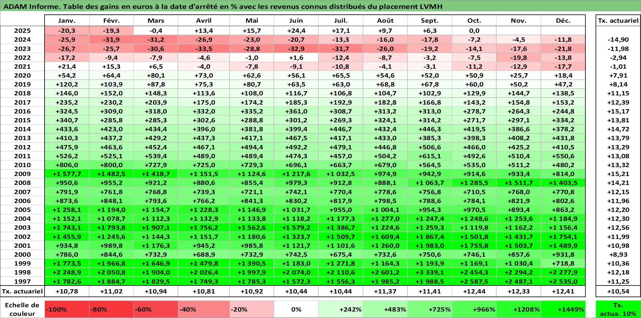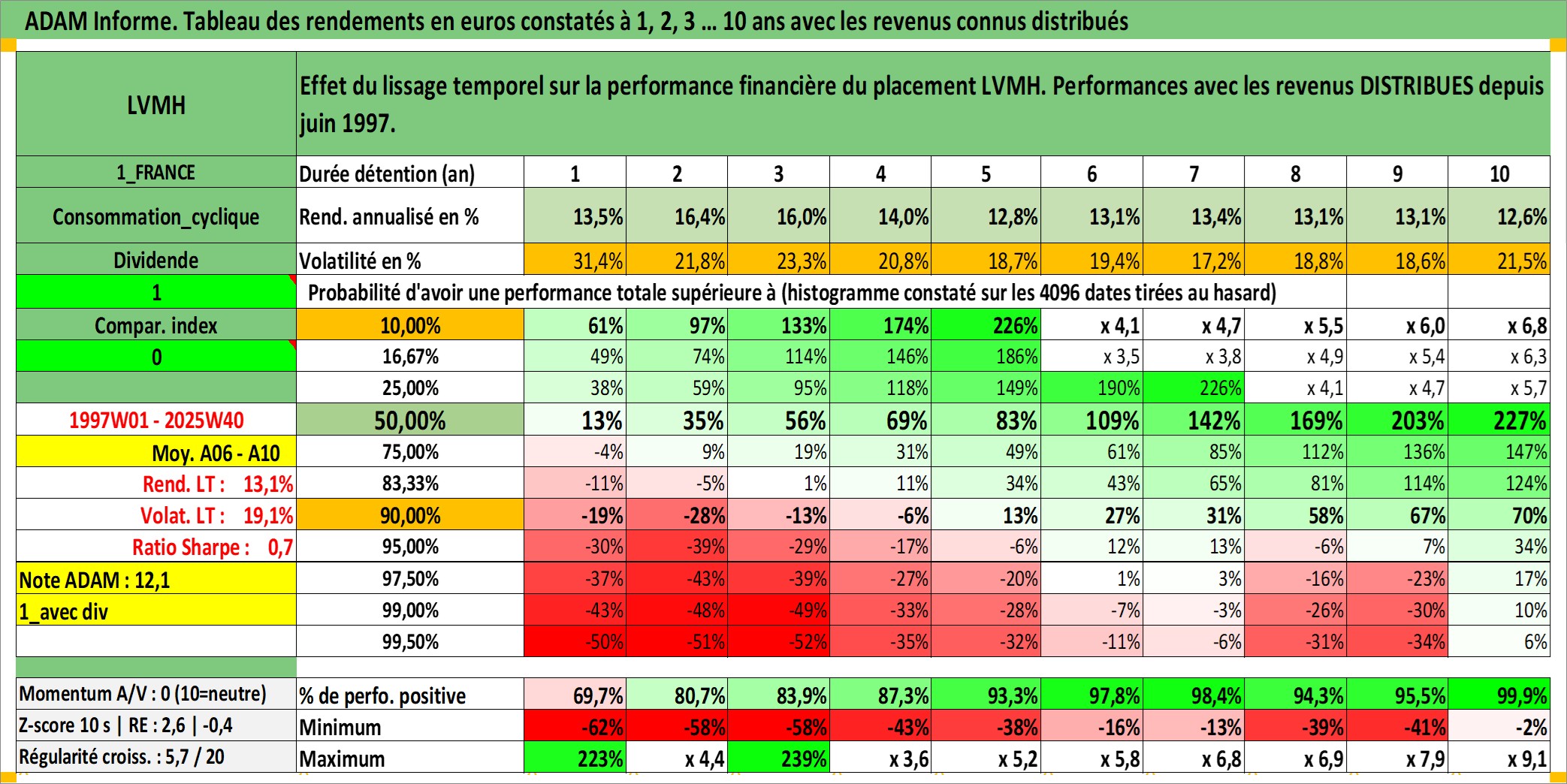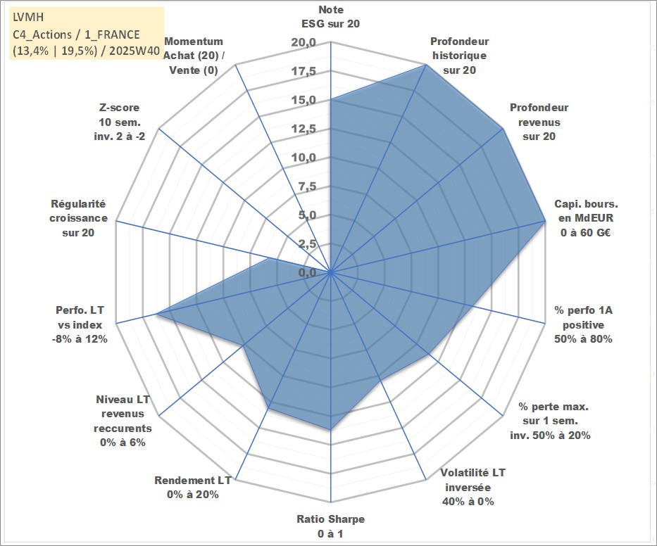Site dédié aux investisseursPage dédiée sur site financeAnalyse des valorisations hebdomadaires de l'action LVMH. Cet actif est cote en EUR. Les valorisations couvrent les semaines 1997W01 a 2025W40. Les revenus de cet actif financier sont pris en compte depuis la semaine 1997W24. La note globale ESG de cet actif est estimee a 15.0 (apres rebasage entre 0 et 20).