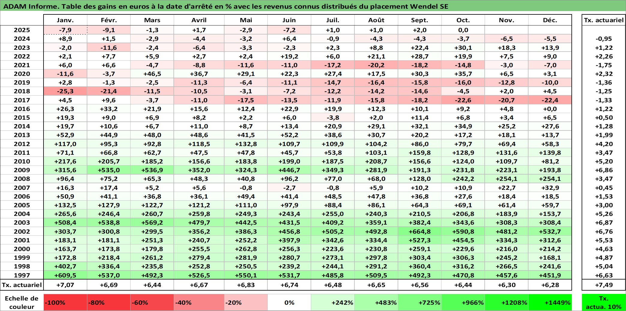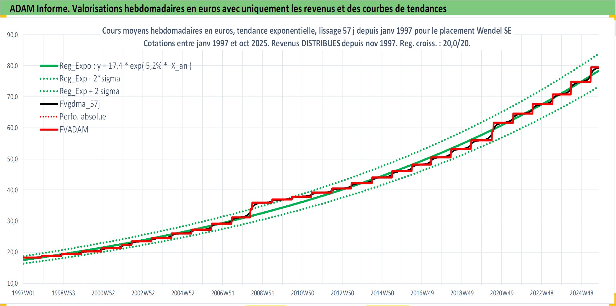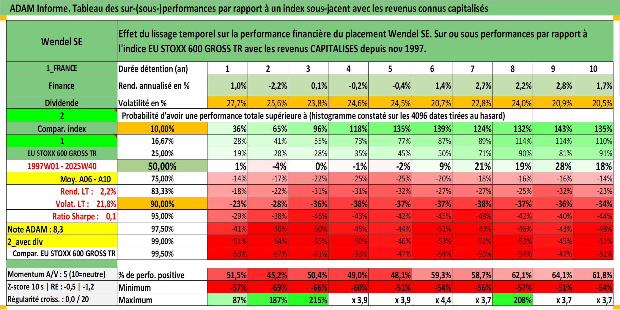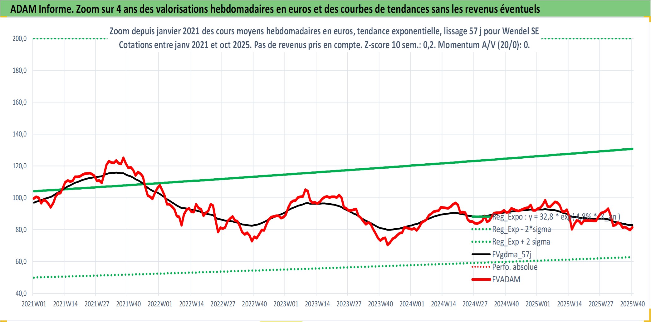 Site dédié aux investisseursPage dédiée sur site financeAnalyse des valorisations hebdomadaires de l'action Wendel SE. Cet actif est cote en EUR. Les valorisations couvrent les semaines 1997W01 a 2025W40. Les revenus de cet actif financier sont pris en compte depuis la semaine 1997W48. La note globale ESG de cet actif est estimee a 18.0 (apres rebasage entre 0 et 20).