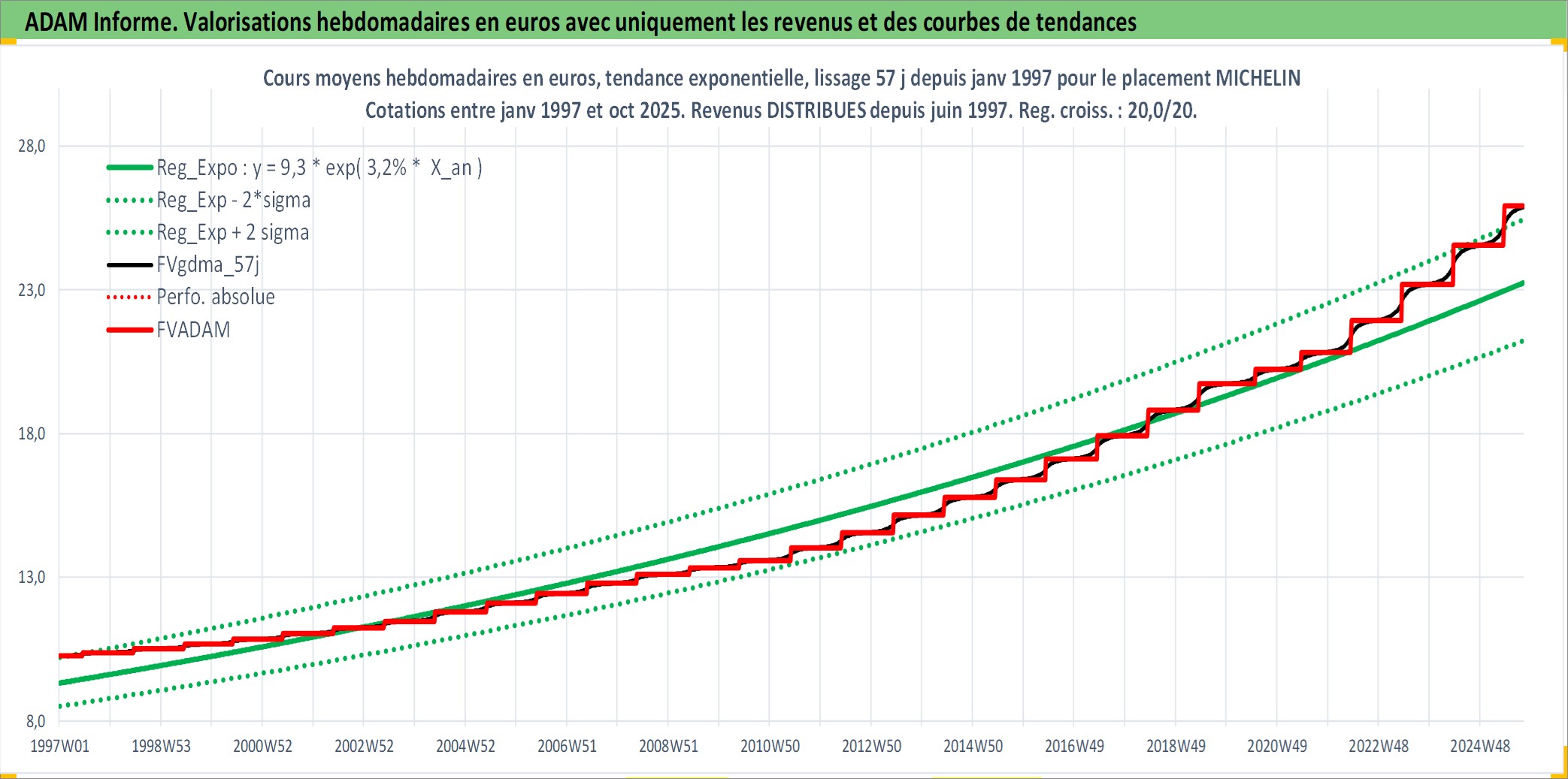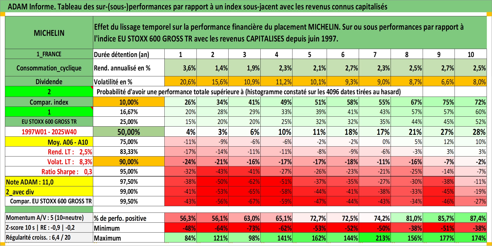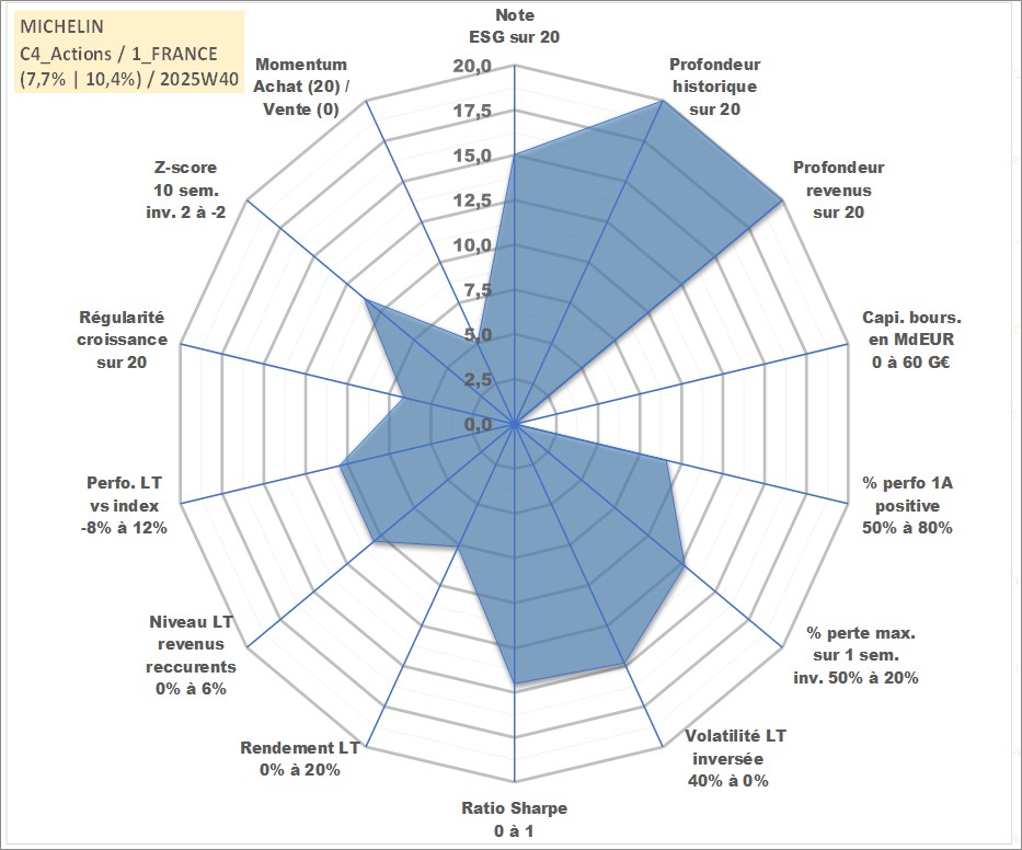 Site dédié aux investisseursPage dédiée sur site financeAnalyse des valorisations hebdomadaires de l'action MICHELIN. Cet actif est cote en EUR. Les valorisations couvrent les semaines 1997W01 a 2025W40. Les revenus de cet actif financier sont pris en compte depuis la semaine 1997W25. La note globale ESG de cet actif est estimee a 15.0 (apres rebasage entre 0 et 20).