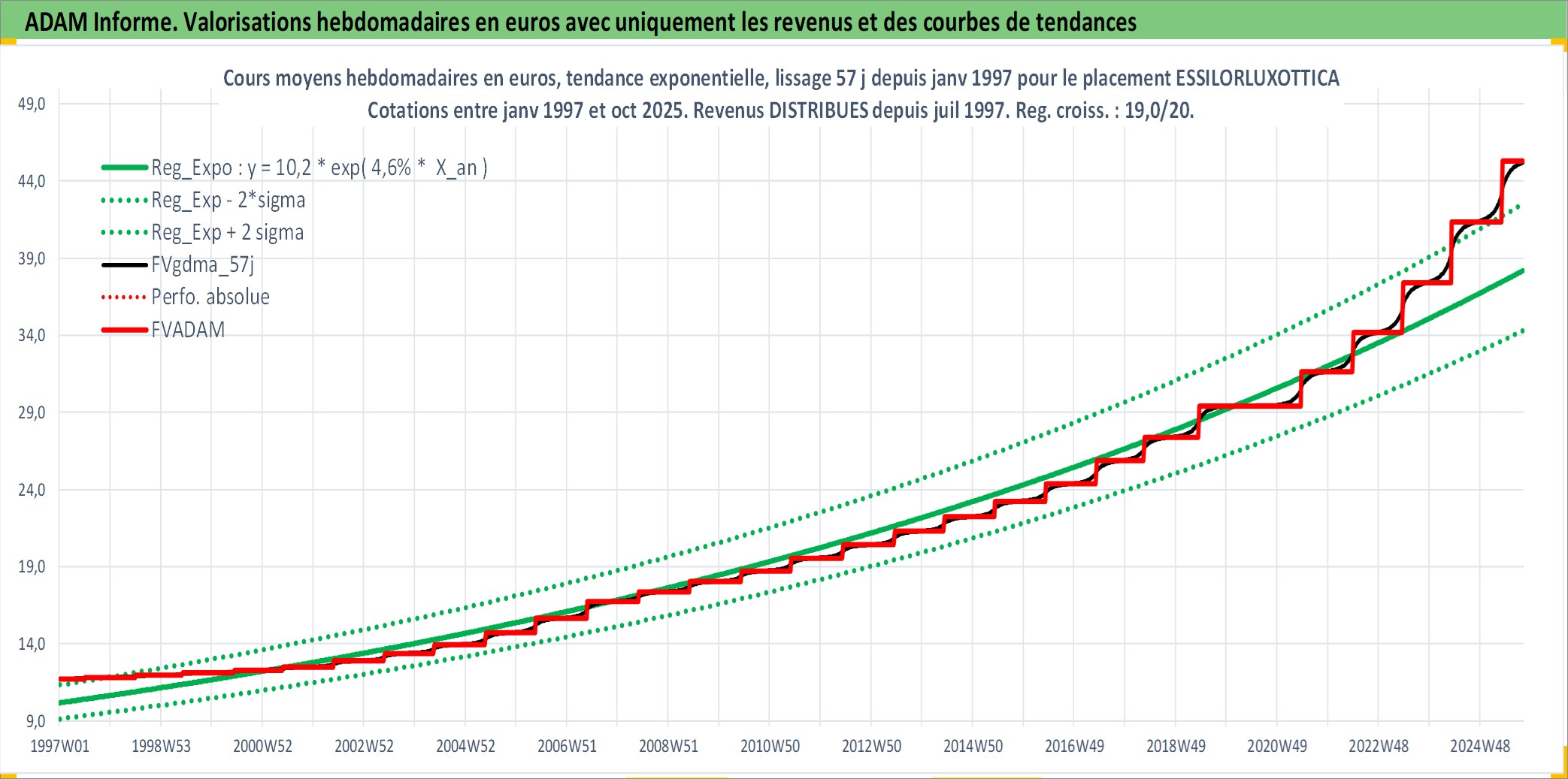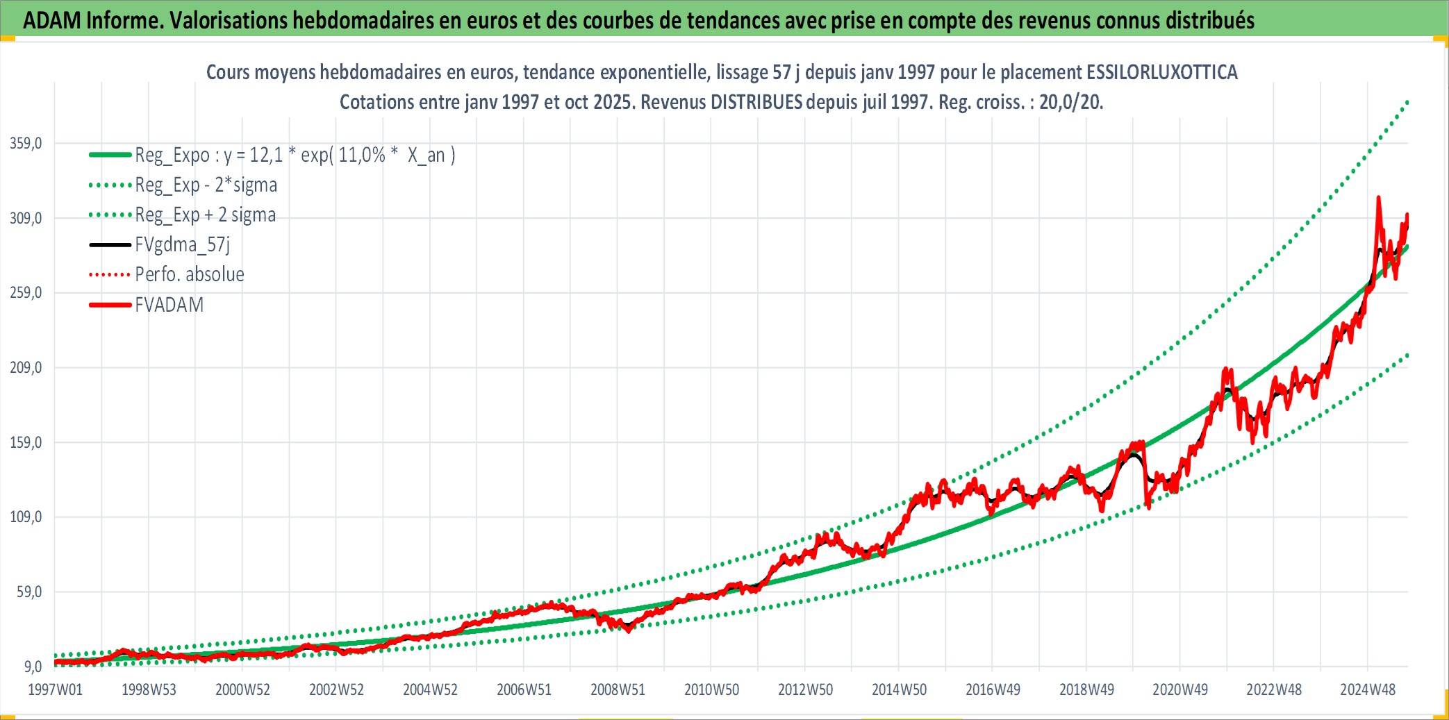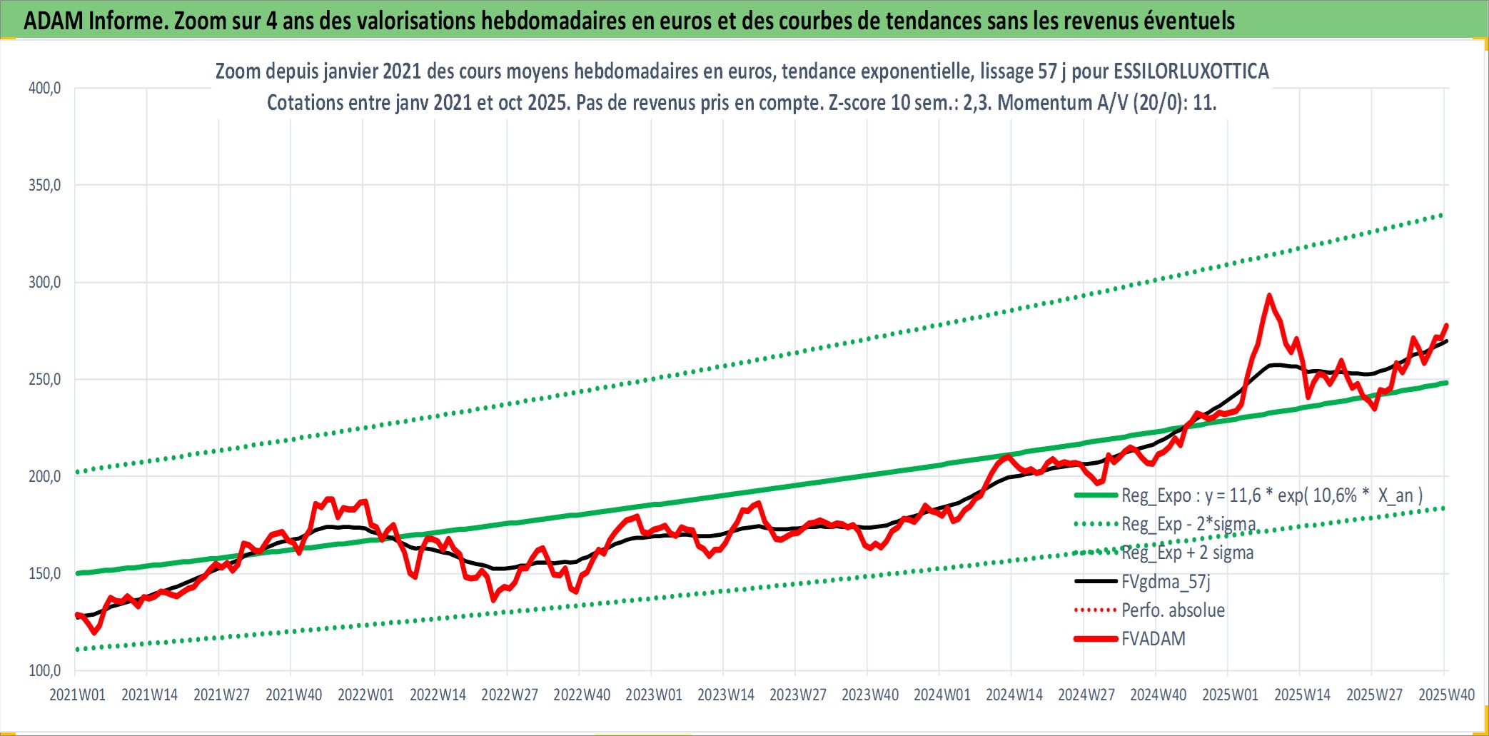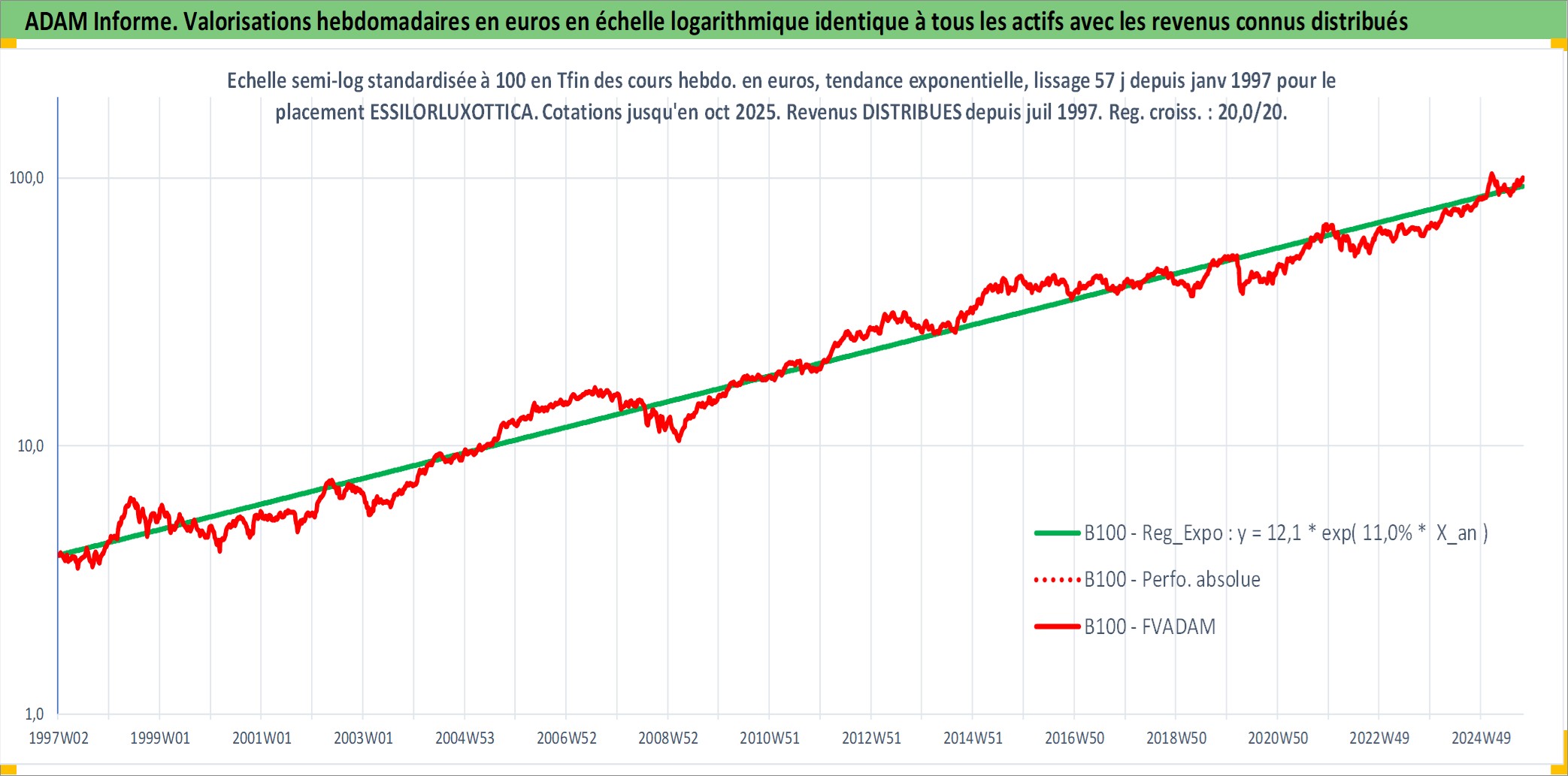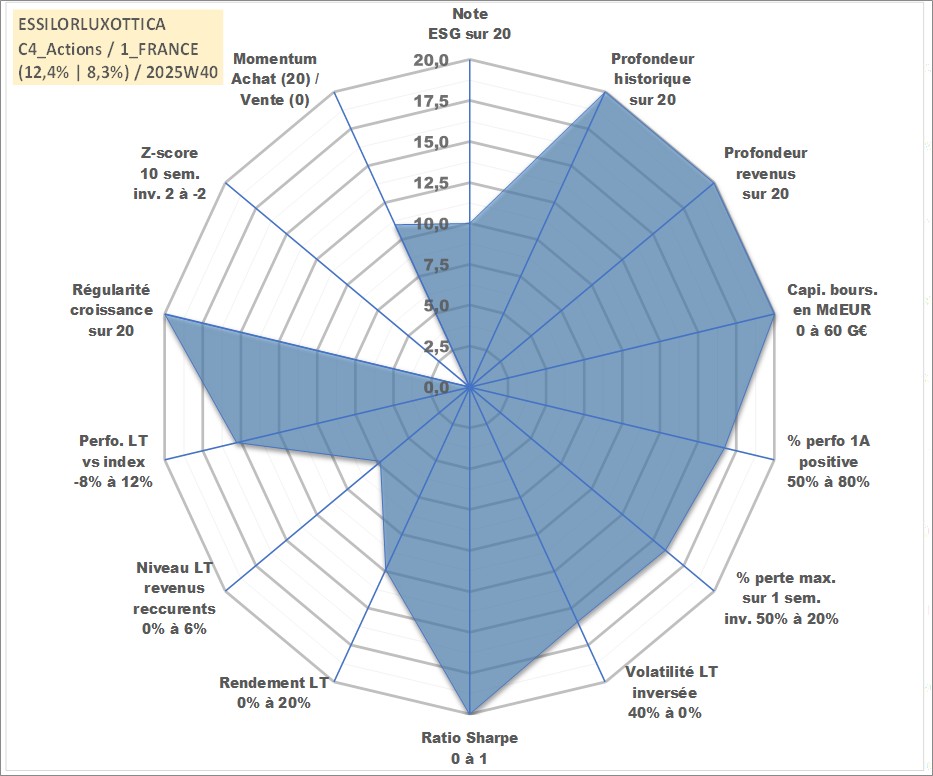 Site dédié aux investisseursPage dédiée sur site financeAnalyse des valorisations hebdomadaires de l'action ESSILORLUXOTTICA. Cet actif est cote en EUR. Les valorisations couvrent les semaines 1997W01 a 2025W40. Les revenus de cet actif financier sont pris en compte depuis la semaine 1997W27. La note globale ESG de cet actif est estimee a 10.0 (apres rebasage entre 0 et 20).