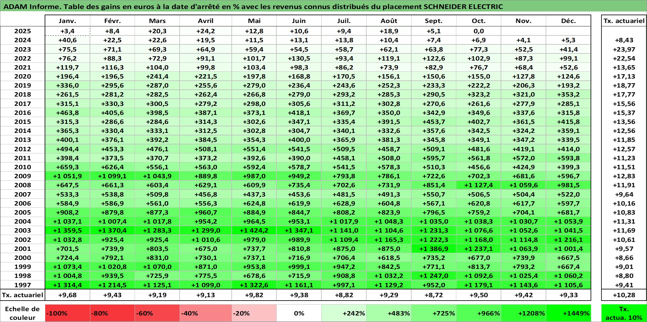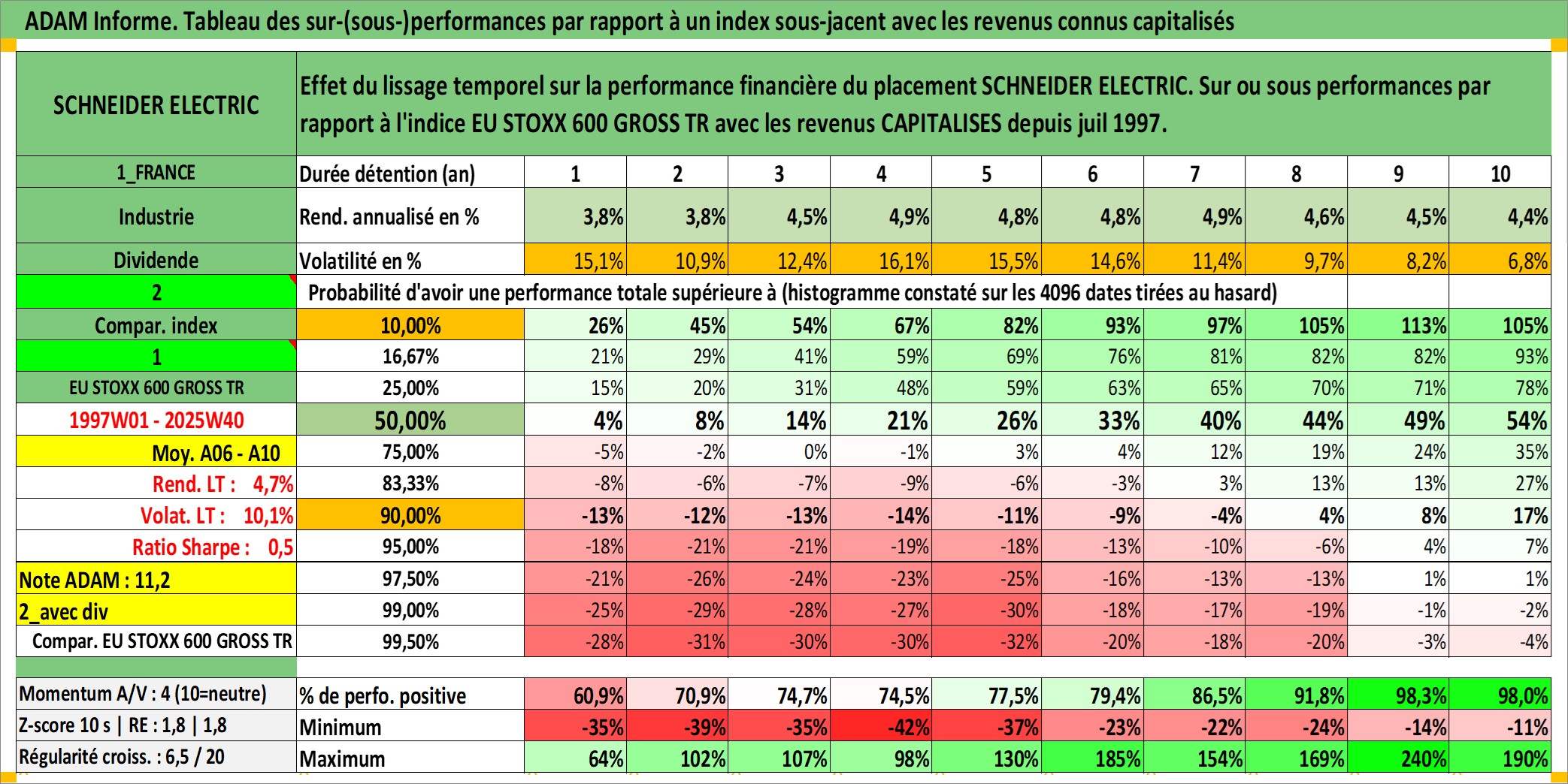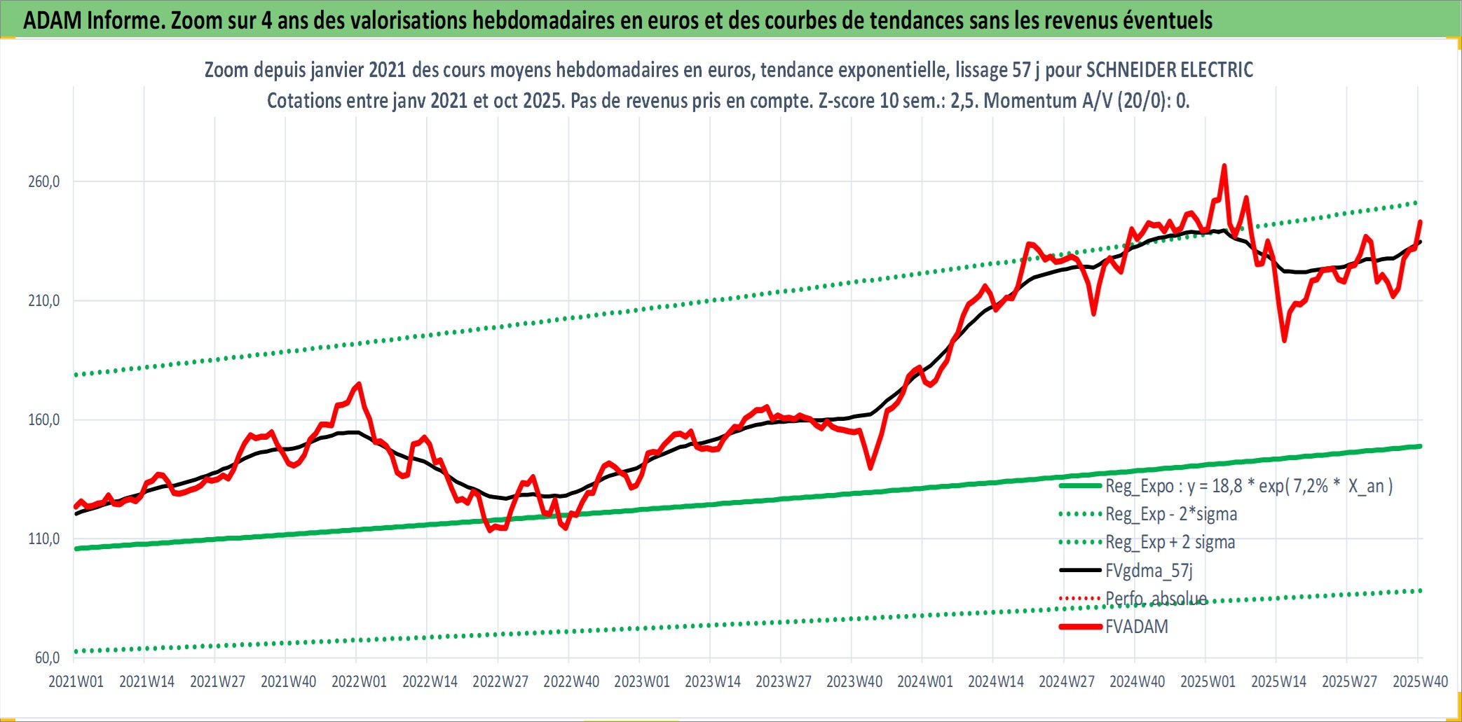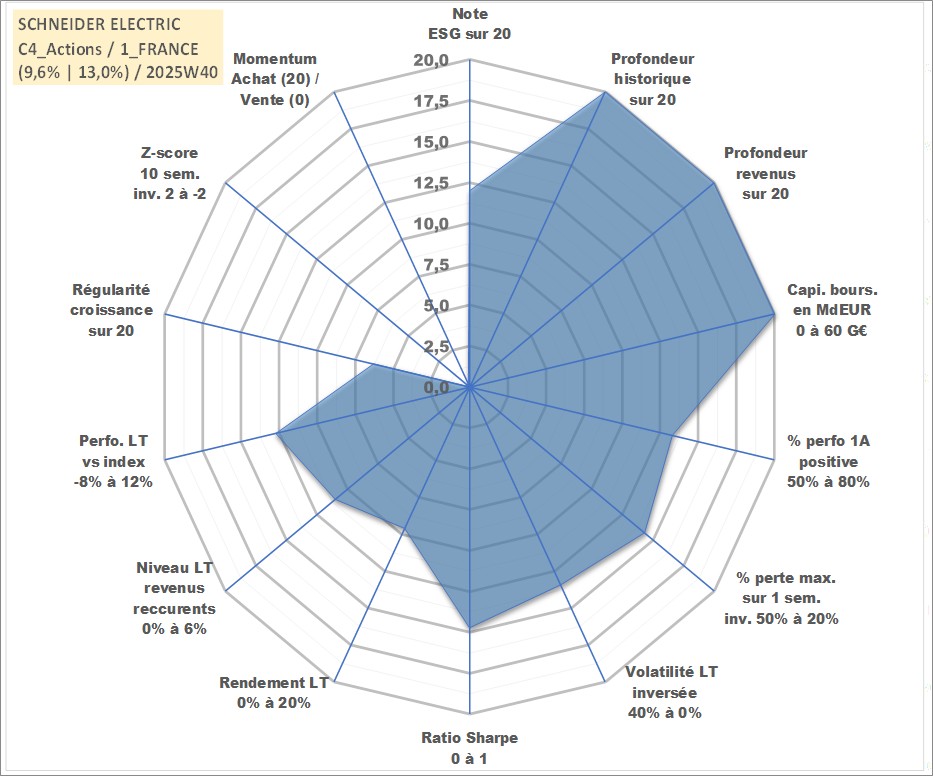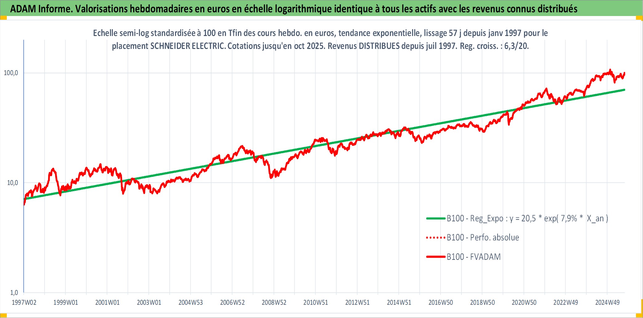 Site dédié aux investisseursPage dédiée sur site financeAnalyse des valorisations hebdomadaires de l'action SCHNEIDER ELECTRIC. Cet actif est cote en EUR. Les valorisations couvrent les semaines 1997W01 a 2025W40. Les revenus de cet actif financier sont pris en compte depuis la semaine 1997W27. La note globale ESG de cet actif est estimee a 12.0 (apres rebasage entre 0 et 20).