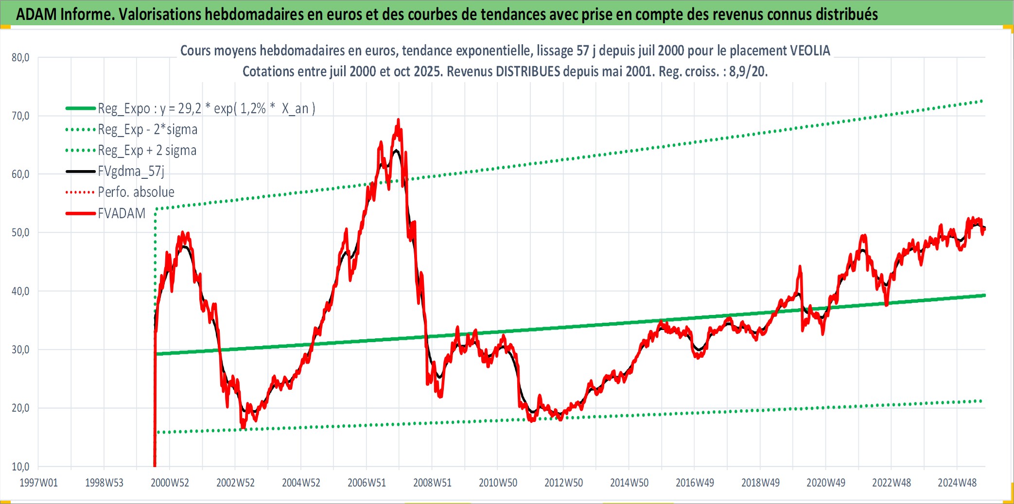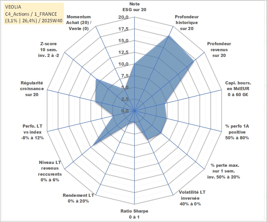 Site dédié aux investisseursPage dédiée sur site financeAnalyse des valorisations hebdomadaires de l'action VEOLIA. Cet actif est cote en EUR. Les valorisations couvrent les semaines 2000W29 a 2025W40. Les revenus de cet actif financier sont pris en compte depuis la semaine 2001W19. La note globale ESG de cet actif est estimee a 10.0 (apres rebasage entre 0 et 20).