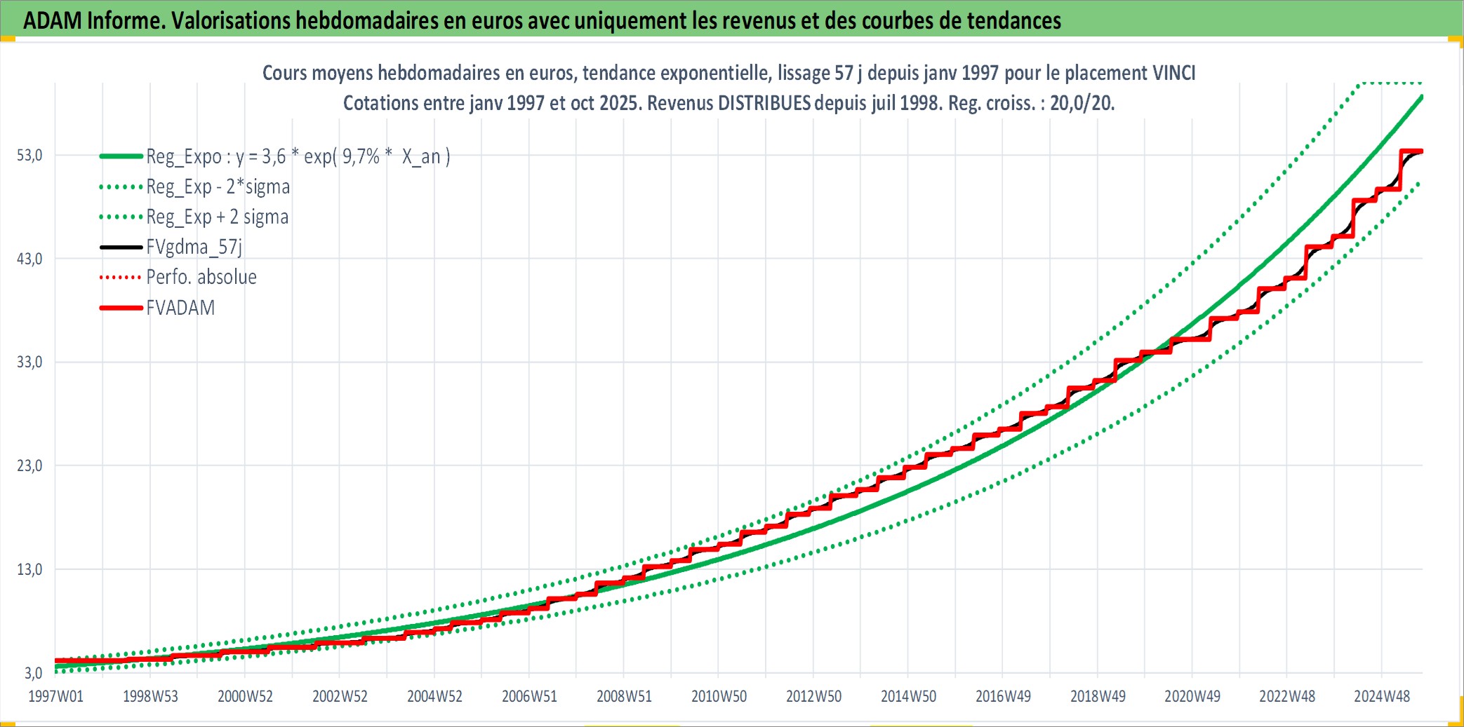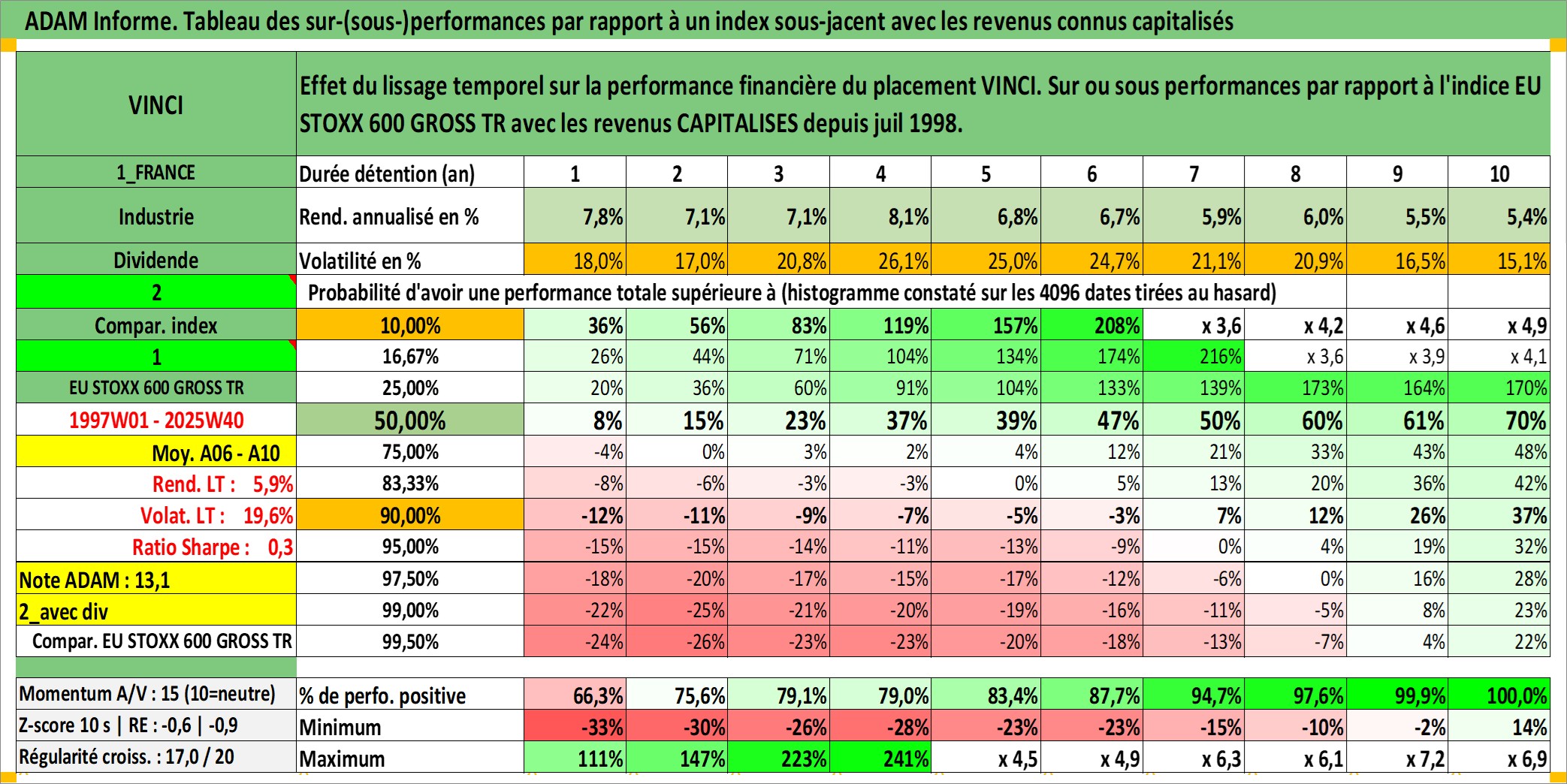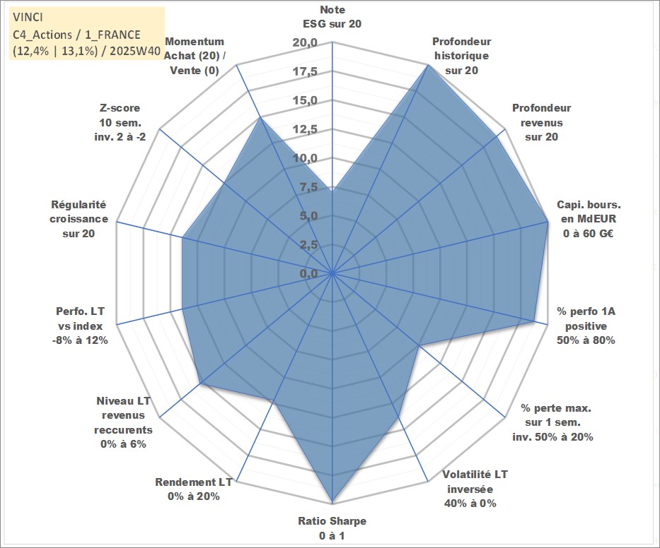 Site dédié aux investisseursPage dédiée sur site financeAnalyse des valorisations hebdomadaires de l'action VINCI. Cet actif est cote en EUR. Les valorisations couvrent les semaines 1997W01 a 2025W40. Les revenus de cet actif financier sont pris en compte depuis la semaine 1998W28. La note globale ESG de cet actif est estimee a 7.0 (apres rebasage entre 0 et 20).