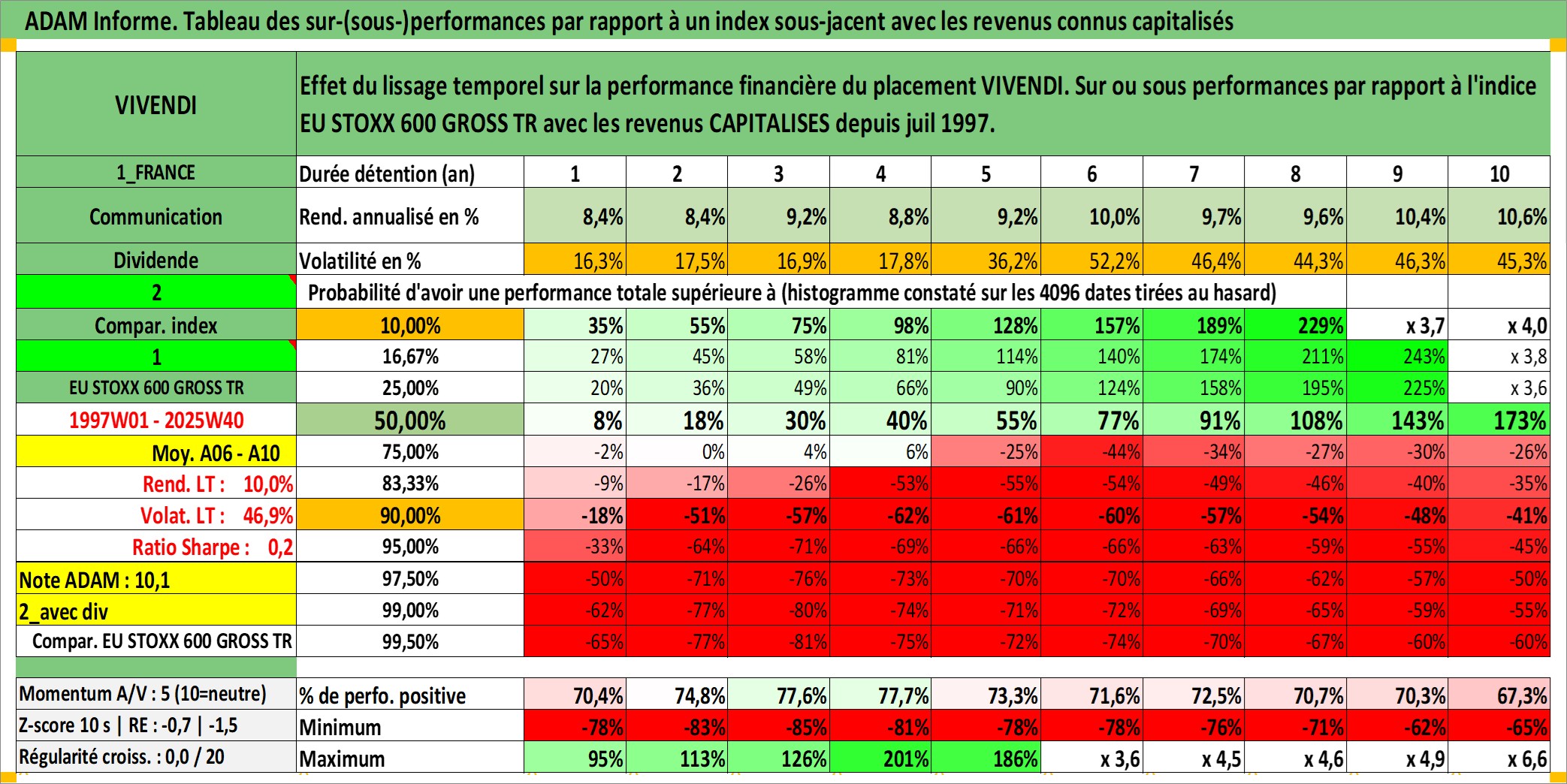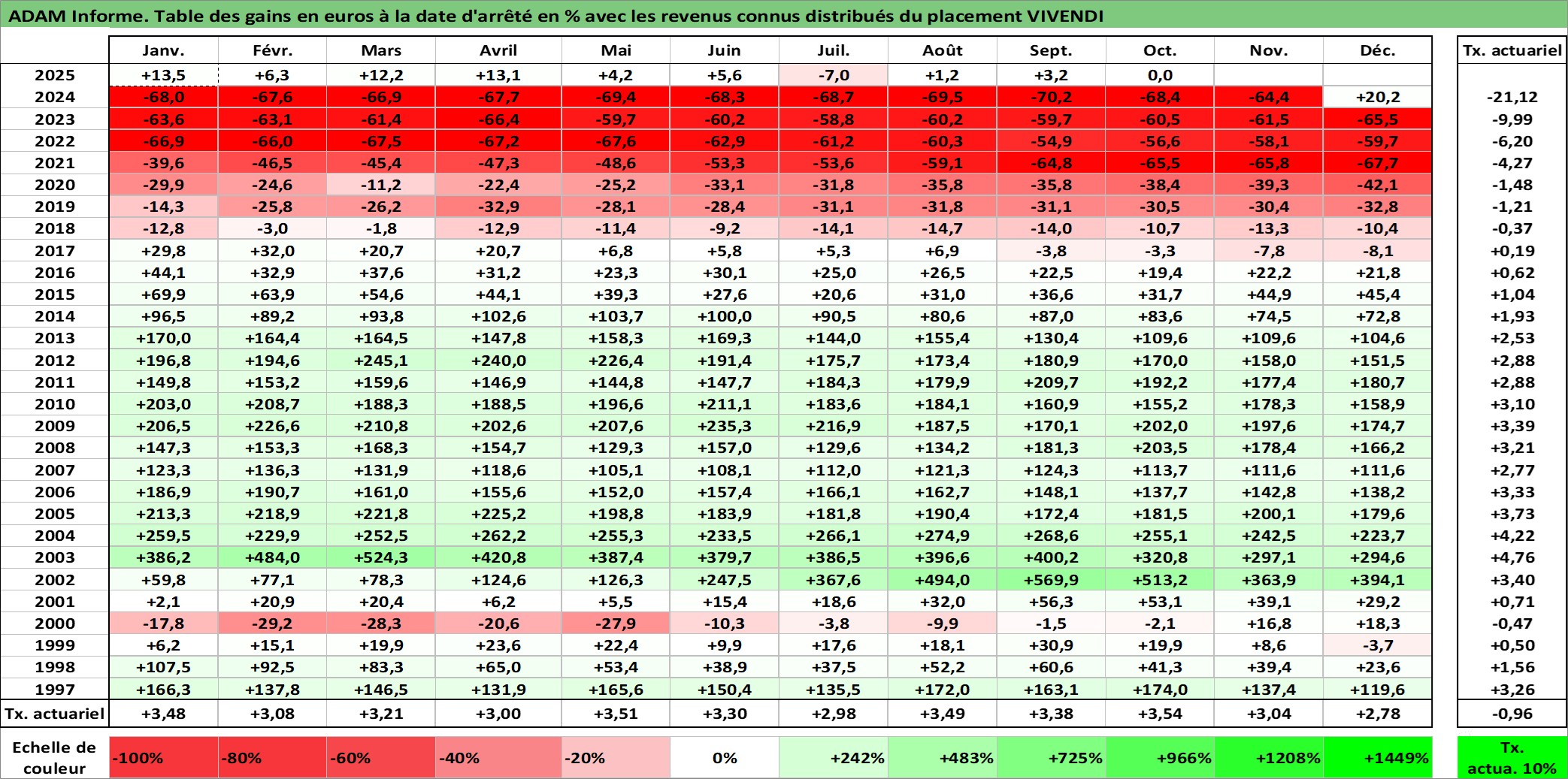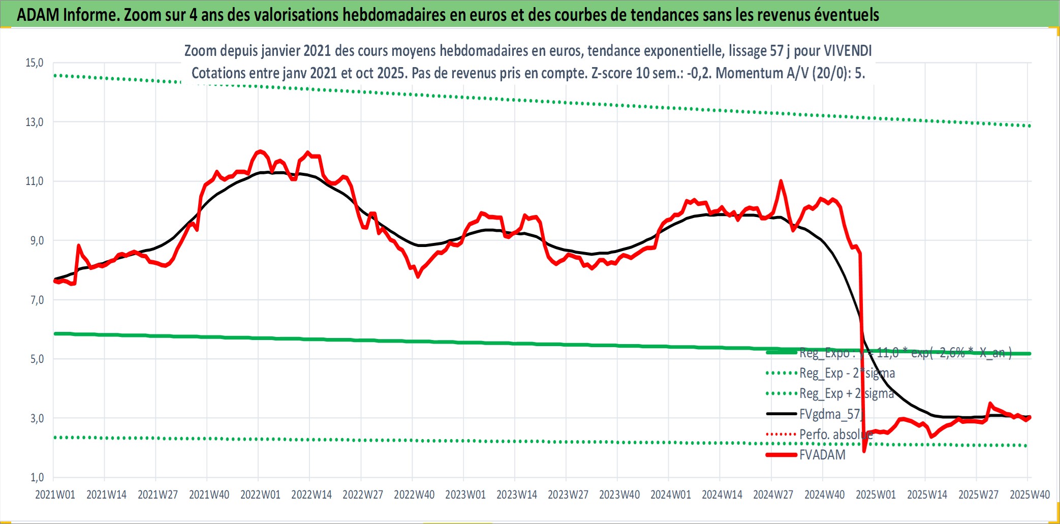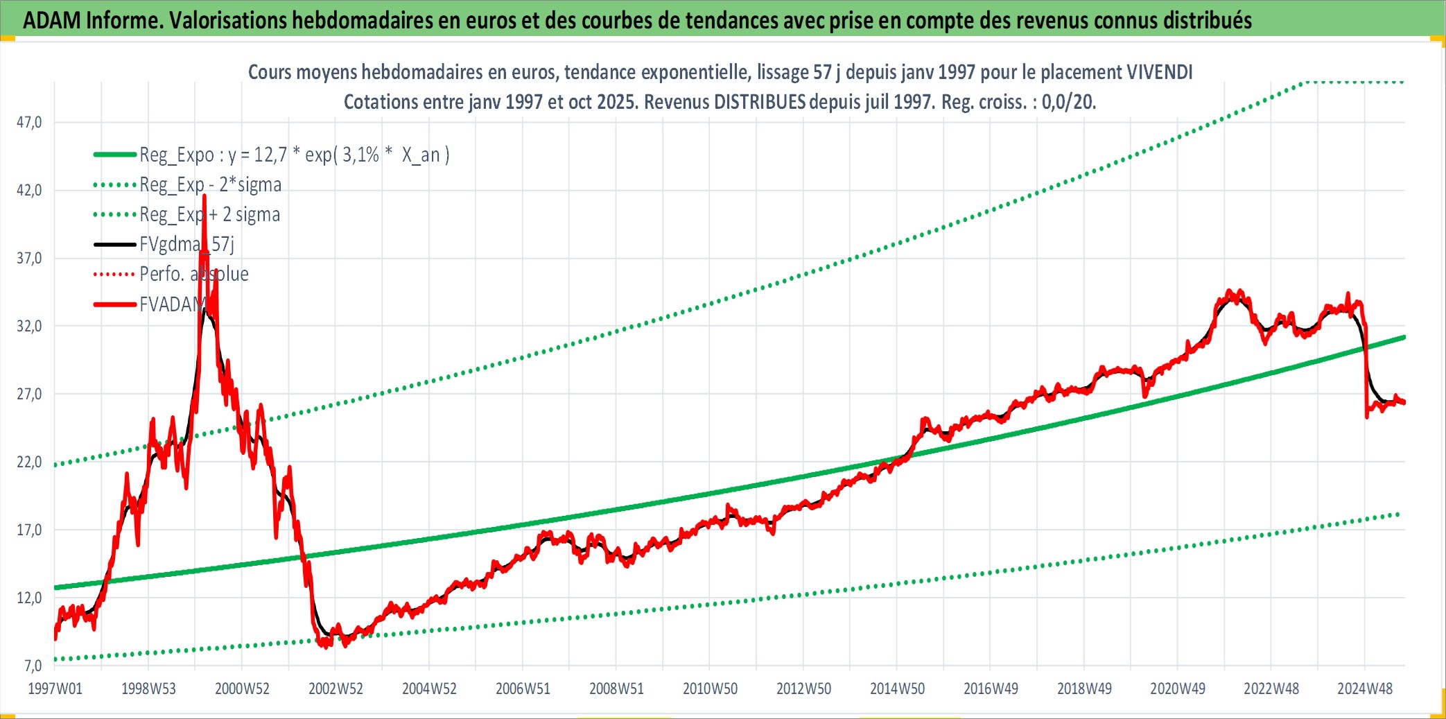 Site dédié aux investisseursPage dédiée sur site financeAnalyse des valorisations hebdomadaires de l'action VIVENDI. Cet actif est cote en EUR. Les valorisations couvrent les semaines 1997W01 a 2025W40. Les revenus de cet actif financier sont pris en compte depuis la semaine 1997W27. La note globale ESG de cet actif est estimee a 16.0 (apres rebasage entre 0 et 20).