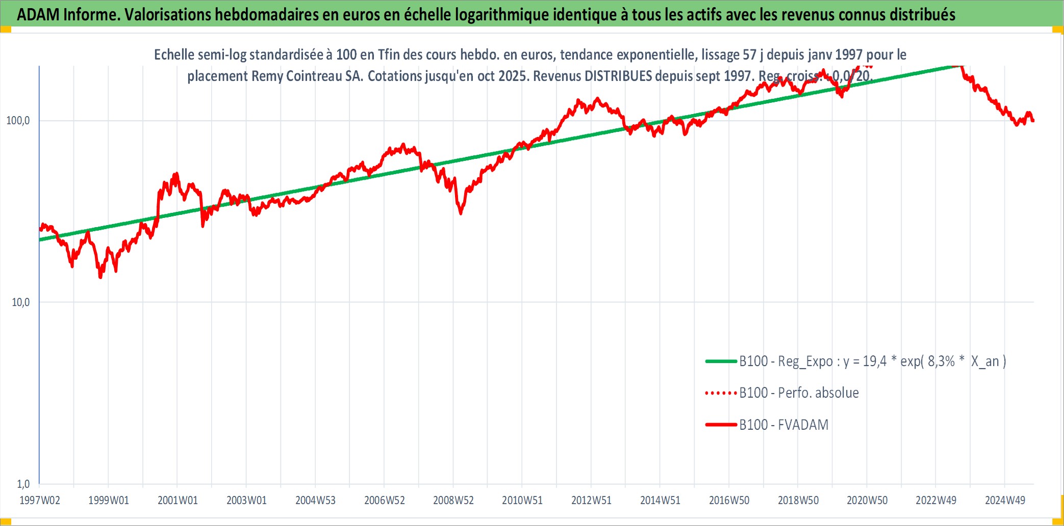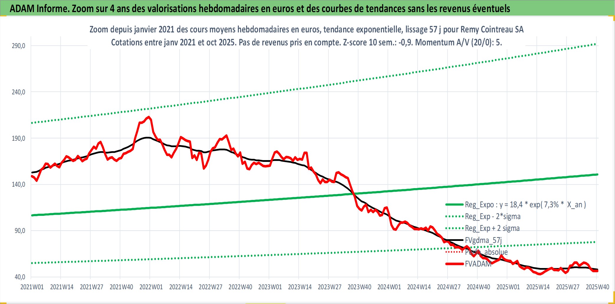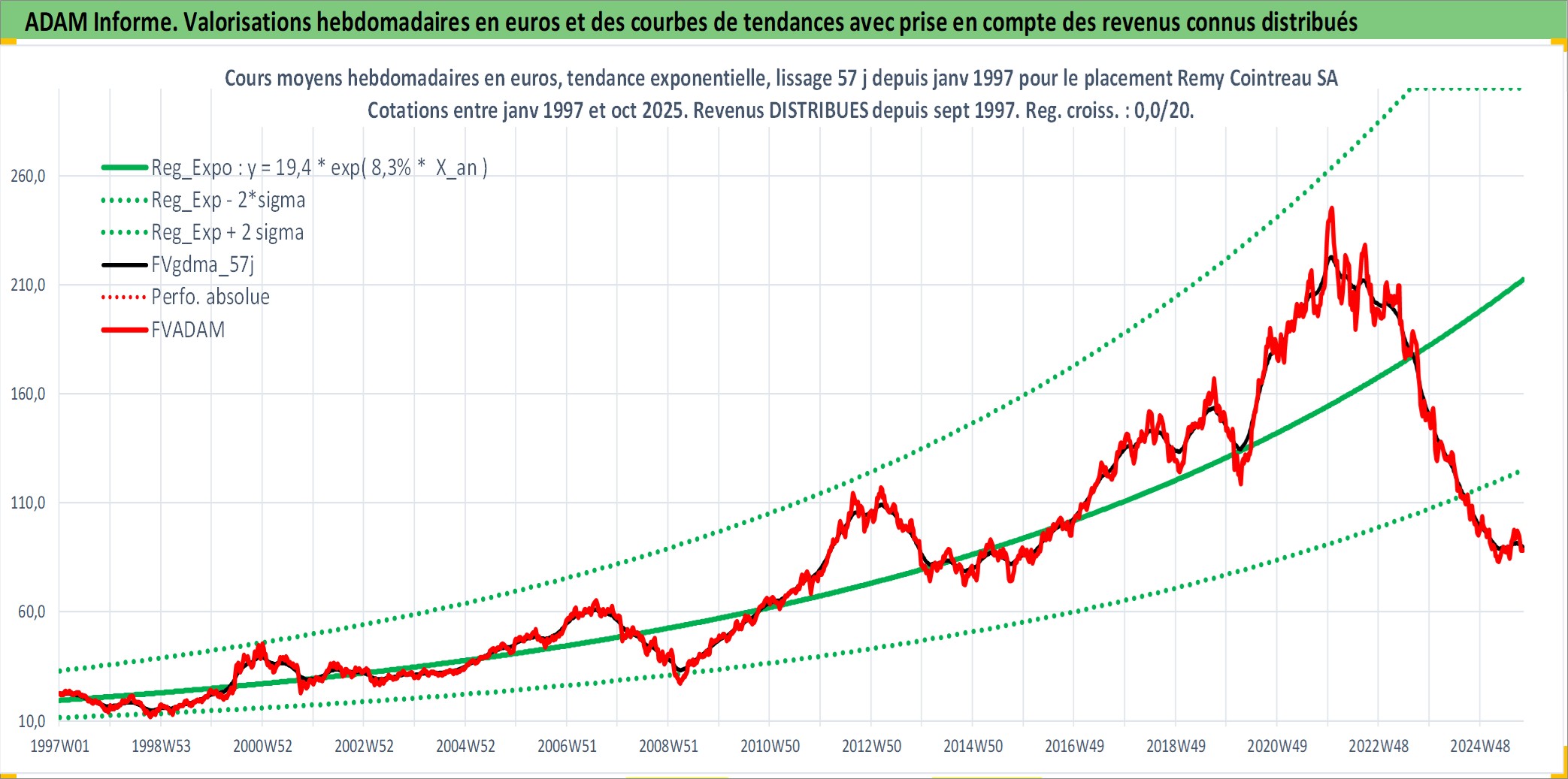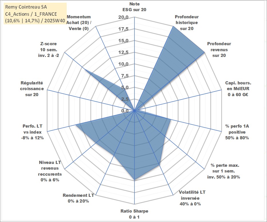 Site dédié aux investisseursPage dédiée sur site financeAnalyse des valorisations hebdomadaires de l'action Remy Cointreau SA. Cet actif est cote en EUR. Les valorisations couvrent les semaines 1997W01 a 2025W40. Les revenus de cet actif financier sont pris en compte depuis la semaine 1997W38. La note ESG de cet actif n'est pas connue.