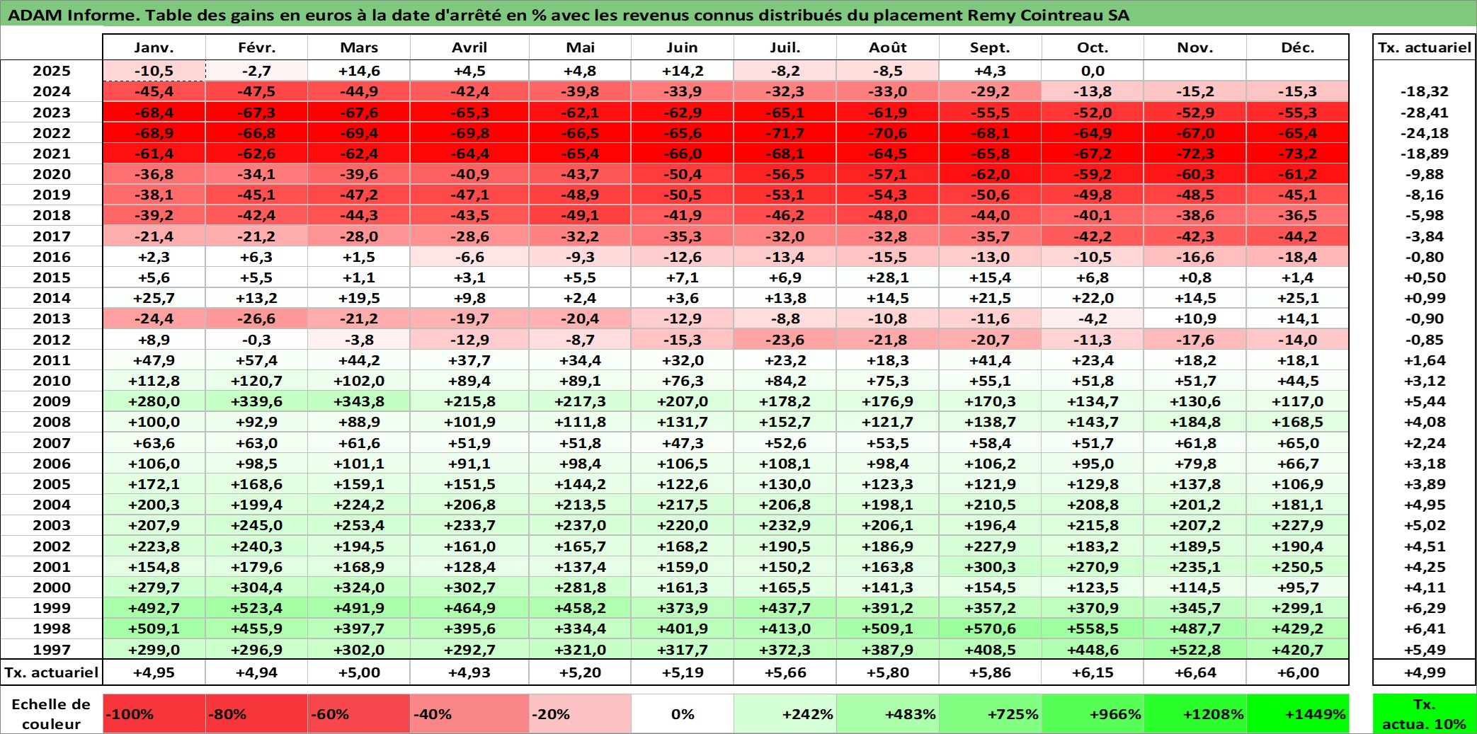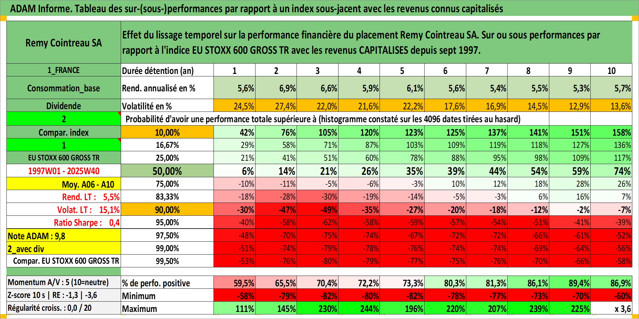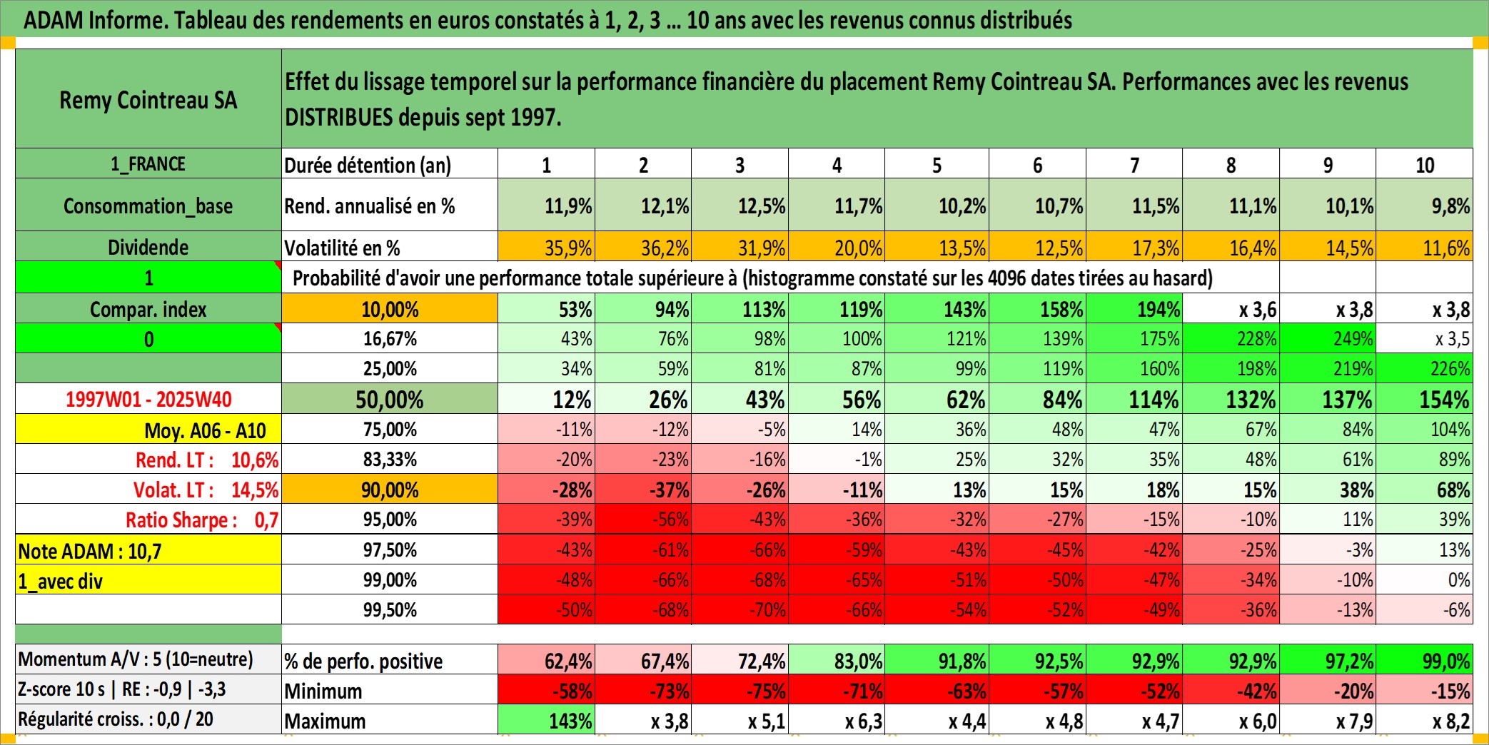 Site dédié aux investisseursPage dédiée sur site financeAnalyse des valorisations hebdomadaires de l'action Remy Cointreau SA. Cet actif est cote en EUR. Les valorisations couvrent les semaines 1997W01 a 2025W40. Les revenus de cet actif financier sont pris en compte depuis la semaine 1997W38. La note ESG de cet actif n'est pas connue.