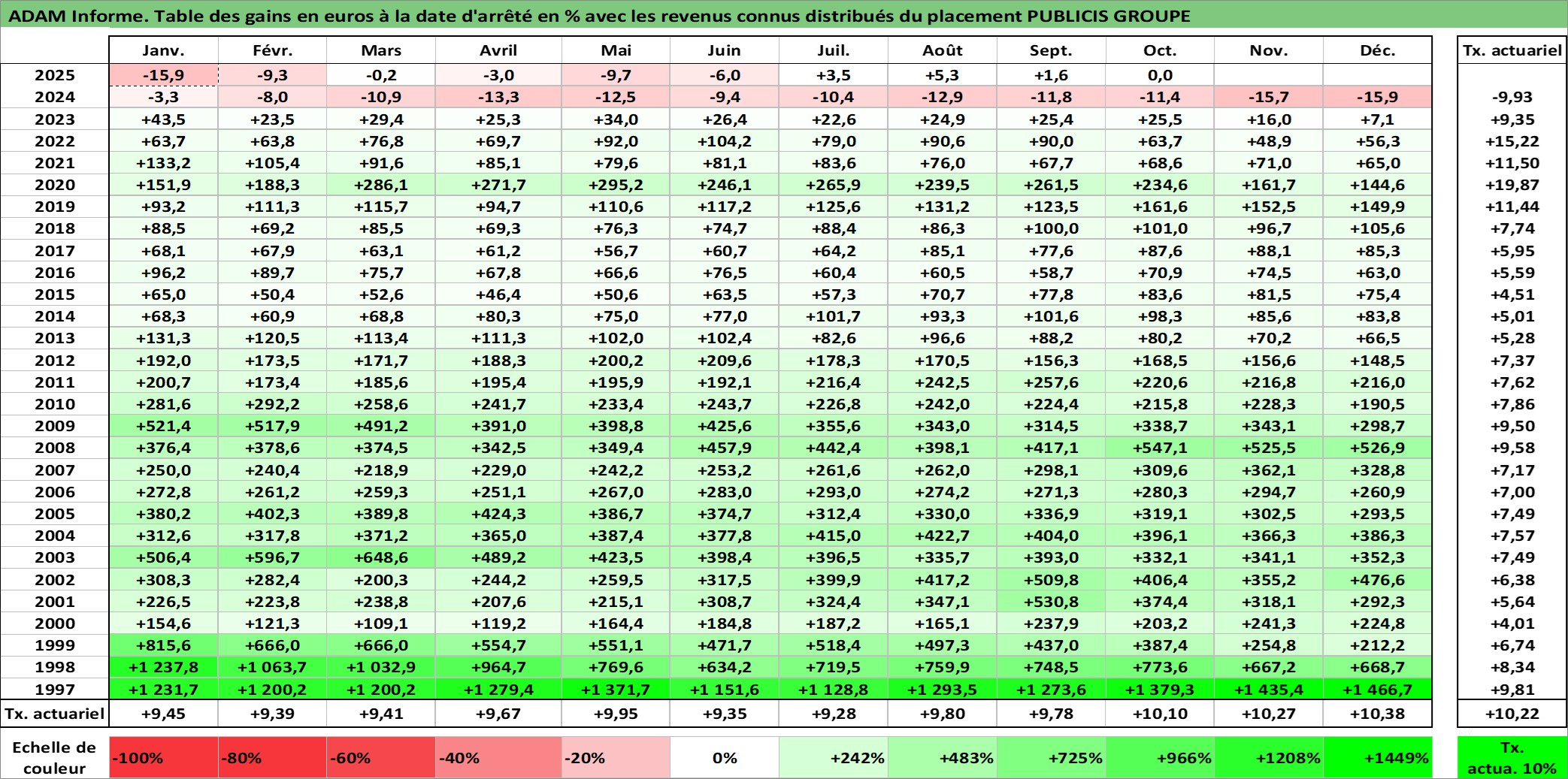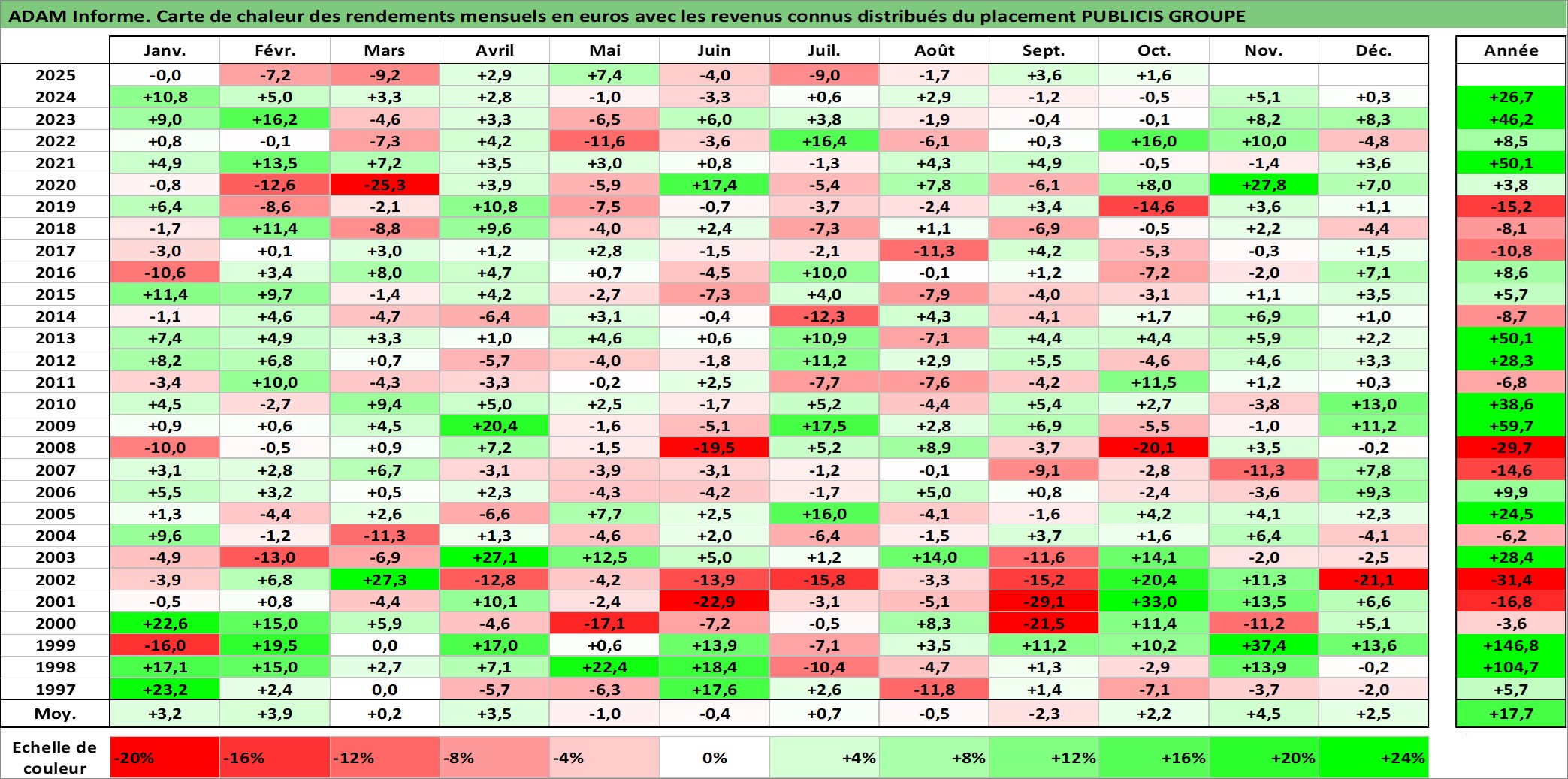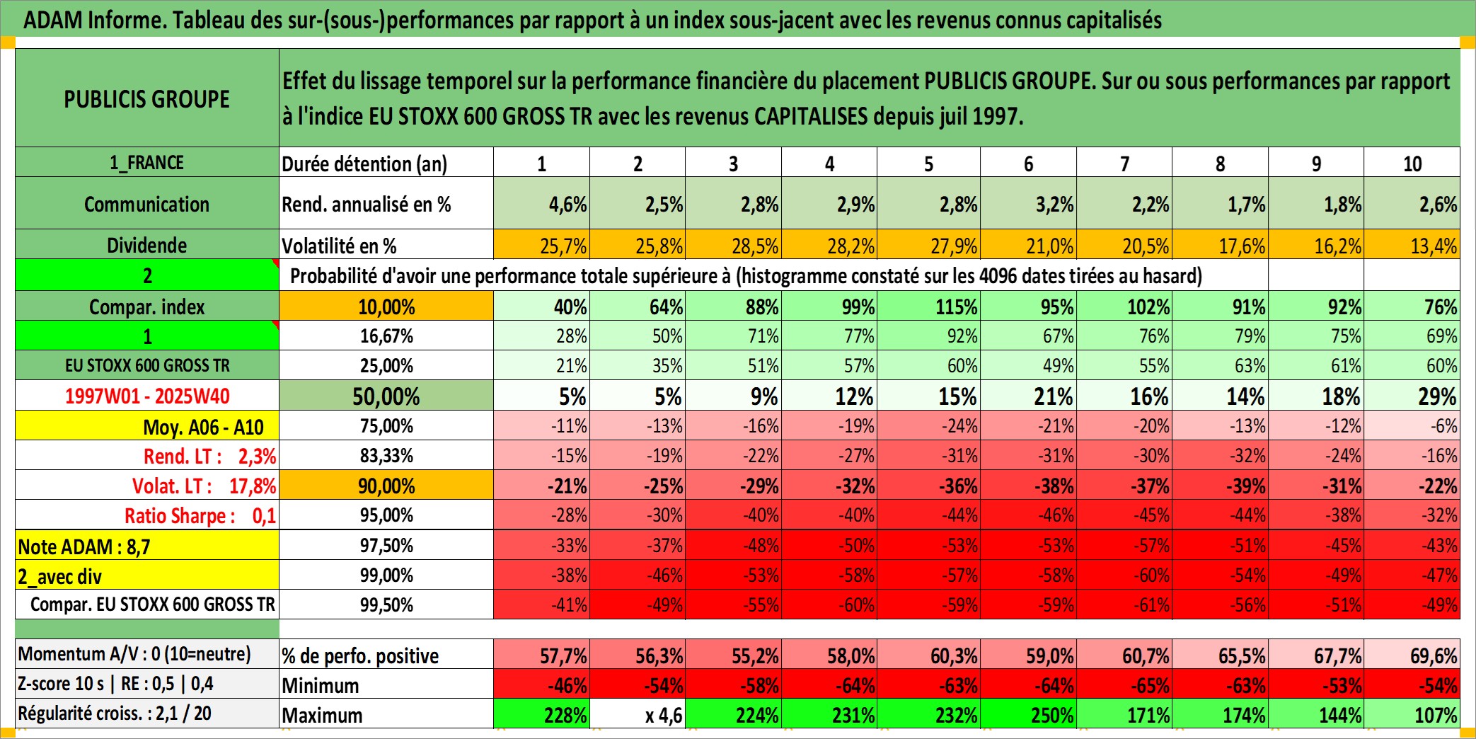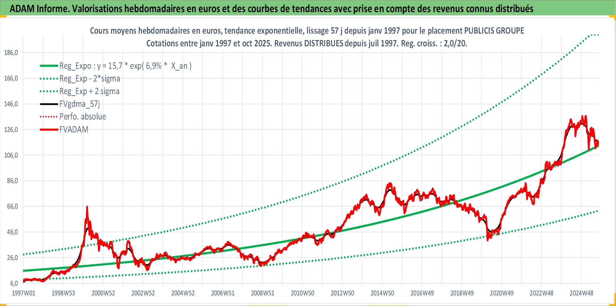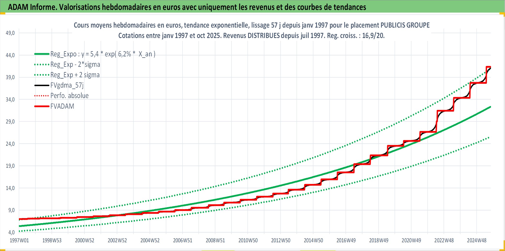 Site dédié aux investisseursPage dédiée sur site financeAnalyse des valorisations hebdomadaires de l'action PUBLICIS GROUPE. Cet actif est cote en EUR. Les valorisations couvrent les semaines 1997W01 a 2025W40. Les revenus de cet actif financier sont pris en compte depuis la semaine 1997W28. La note globale ESG de cet actif est estimee a 16.0 (apres rebasage entre 0 et 20).