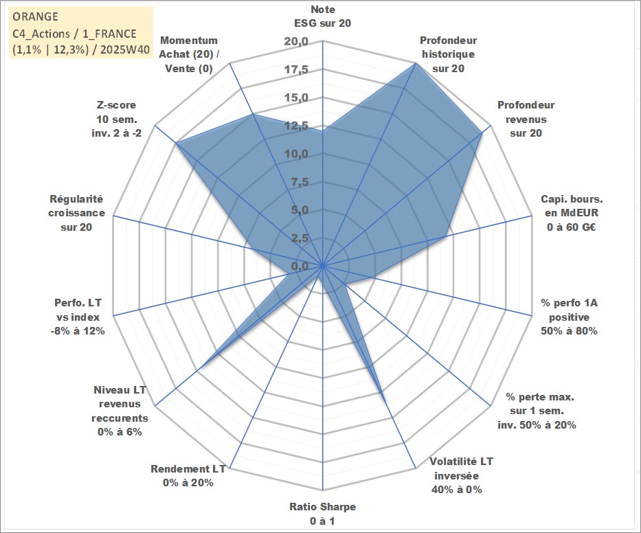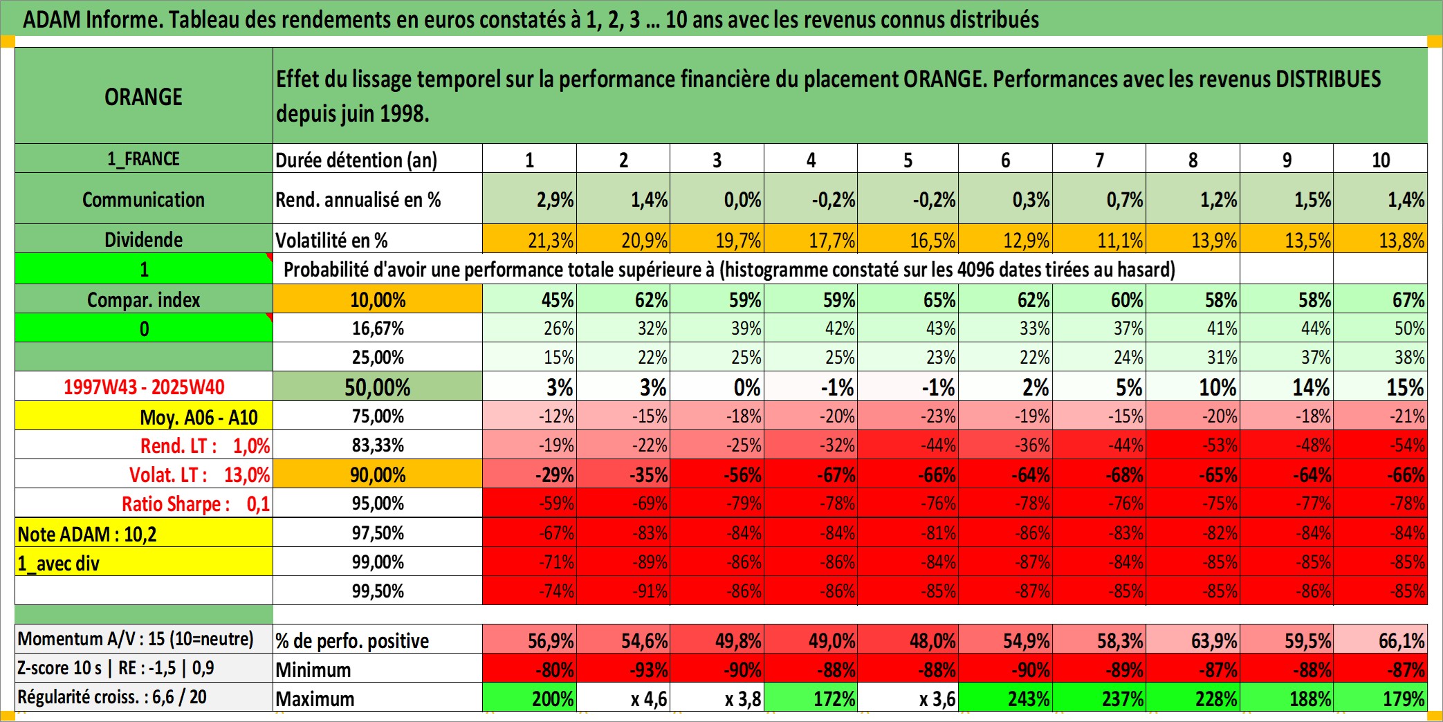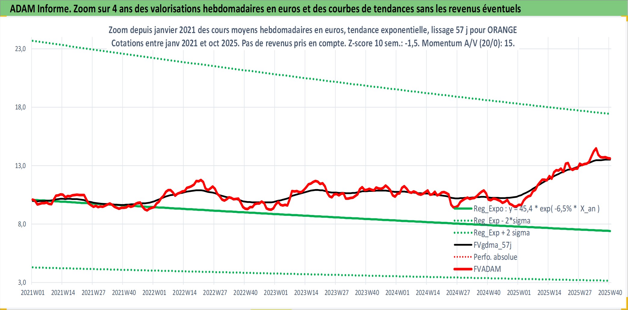 Site dédié aux investisseursPage dédiée sur site financeAnalyse des valorisations hebdomadaires de l'action ORANGE. Cet actif est cote en EUR. Les valorisations couvrent les semaines 1997W43 a 2025W40. Les revenus de cet actif financier sont pris en compte depuis la semaine 1998W25. La note globale ESG de cet actif est estimee a 12.0 (apres rebasage entre 0 et 20).