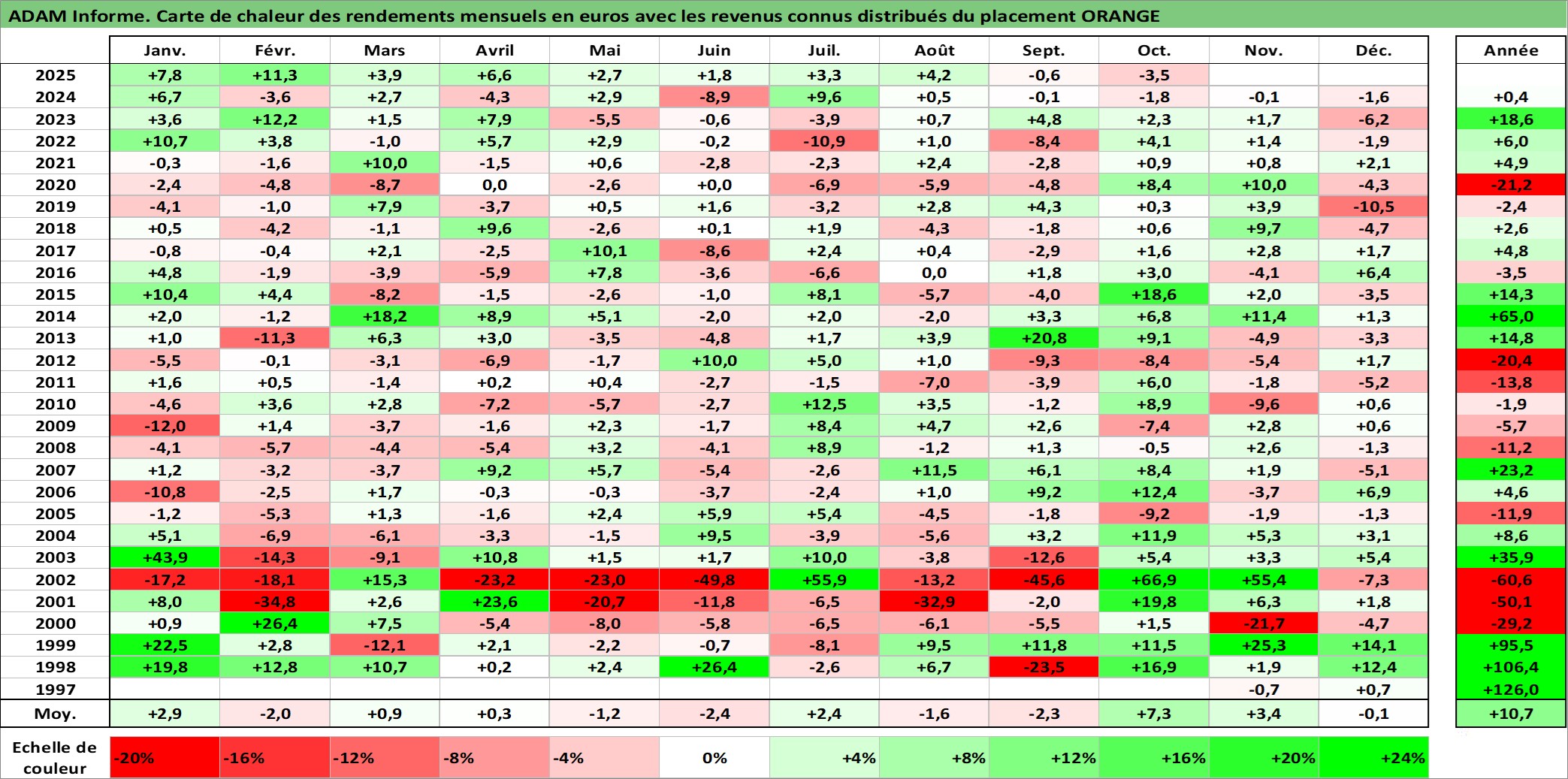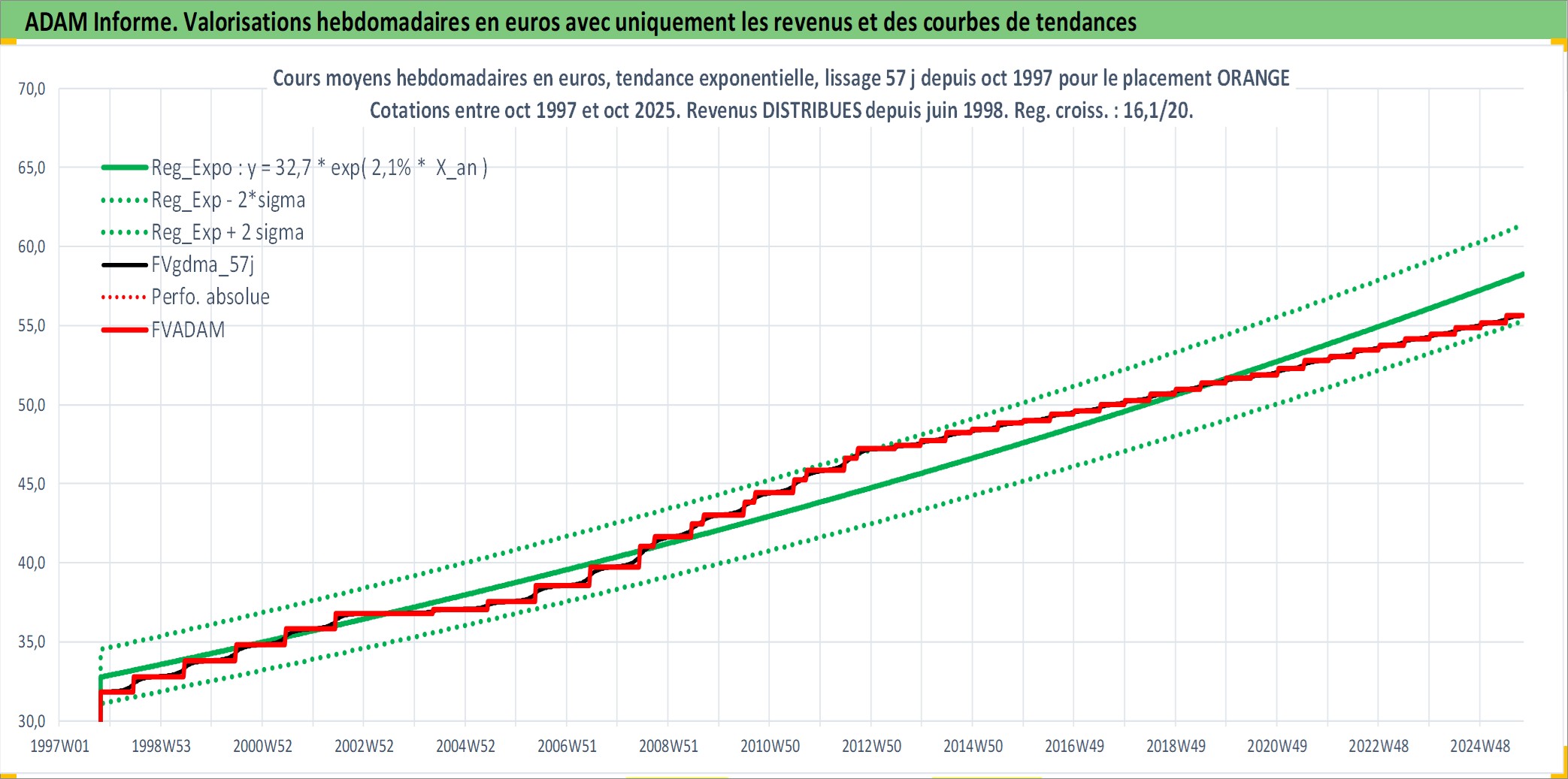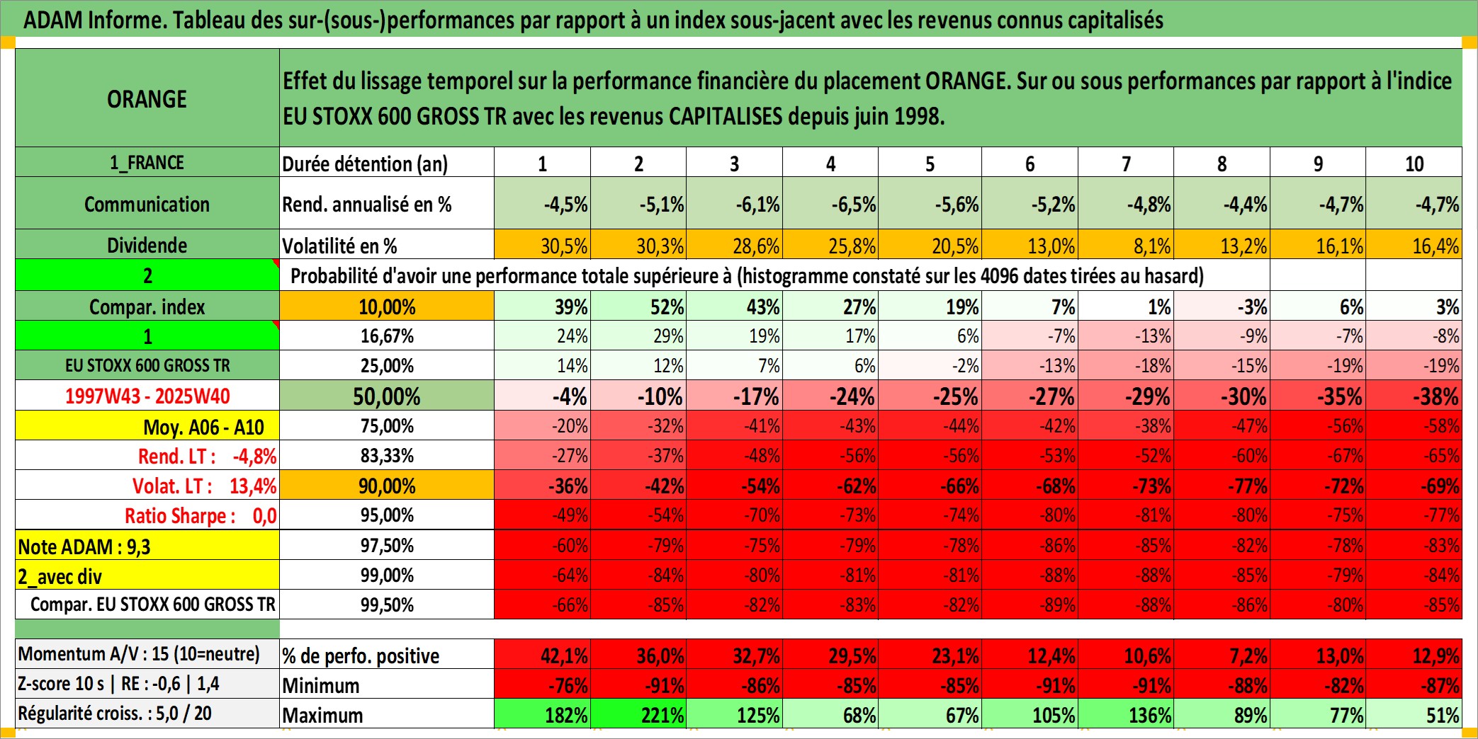 Site dédié aux investisseursPage dédiée sur site financeAnalyse des valorisations hebdomadaires de l'action ORANGE. Cet actif est cote en EUR. Les valorisations couvrent les semaines 1997W43 a 2025W40. Les revenus de cet actif financier sont pris en compte depuis la semaine 1998W25. La note globale ESG de cet actif est estimee a 12.0 (apres rebasage entre 0 et 20).