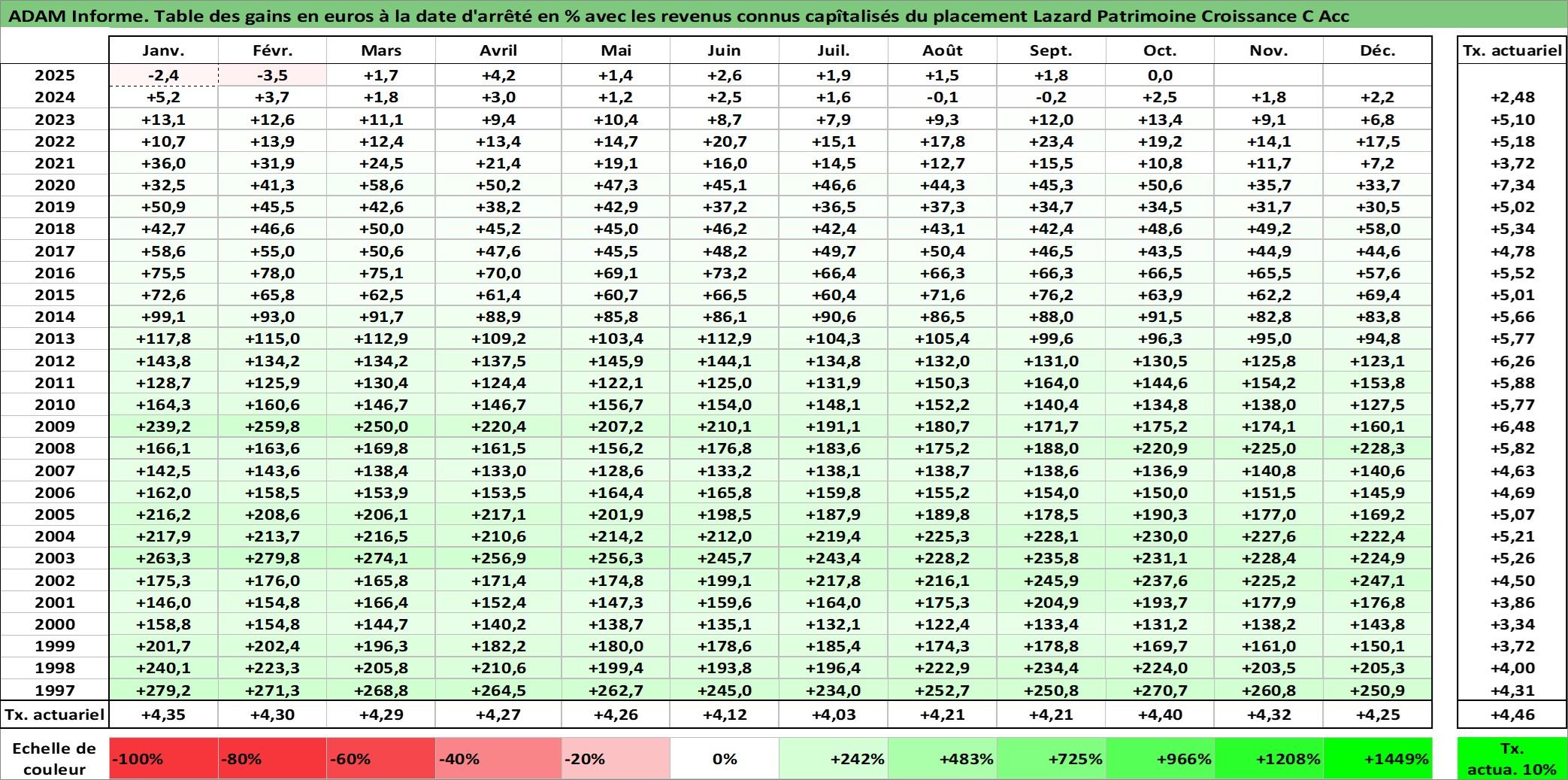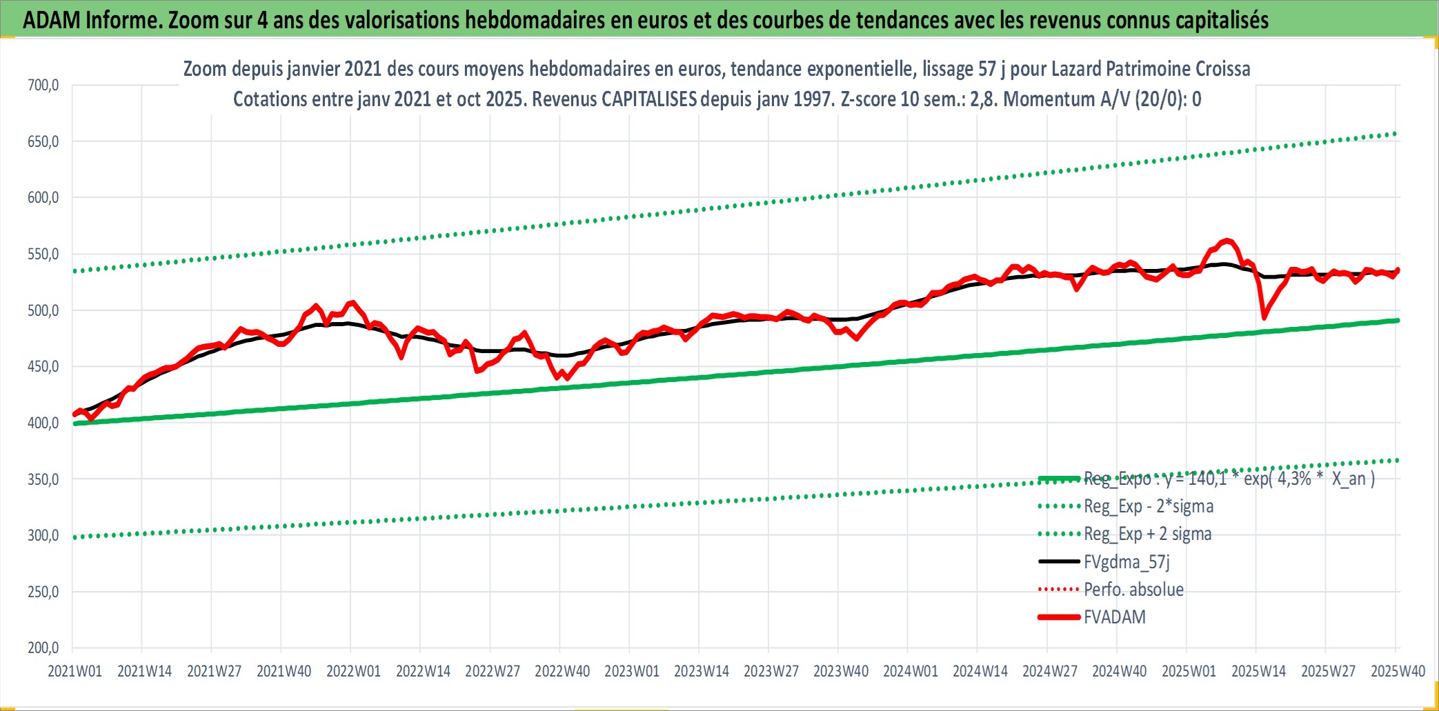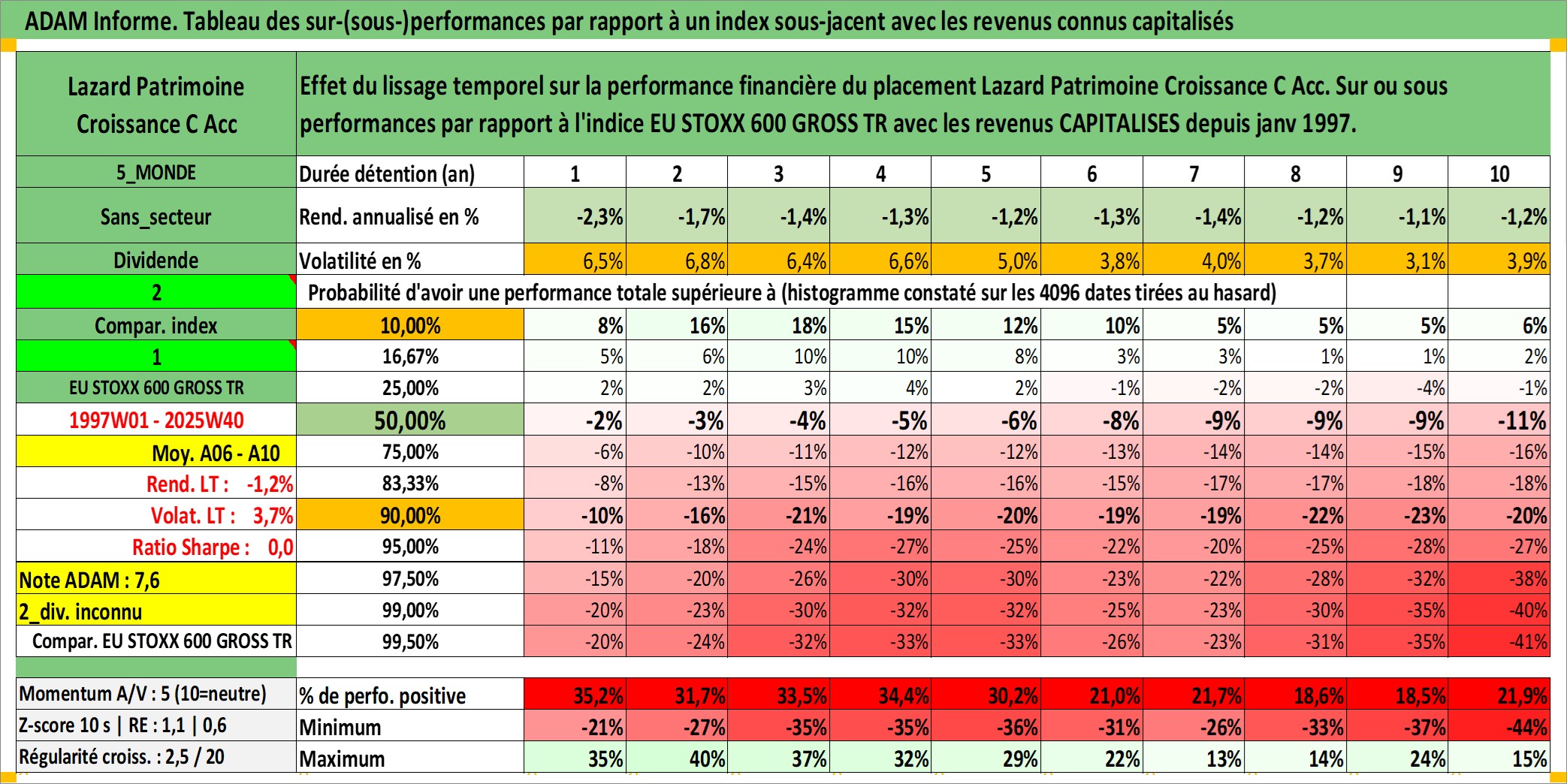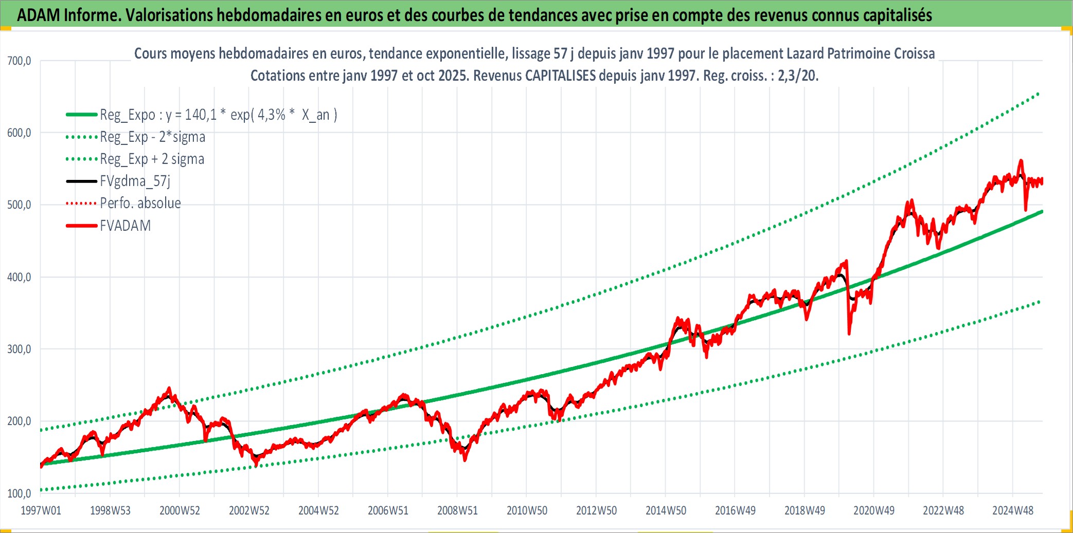 Site dédié aux investisseursPage dédiée sur site financeAnalyse des valorisations hebdomadaires du fonds Lazard Patrimoine Croissance C Acc. Cet actif est cote en EUR. Les valorisations couvrent les semaines 1997W01 a 2025W40. Les revenus de cet actif financier sont pris en compte depuis la semaine 1997W01. La note globale ESG de cet actif est estimee a 10.0 (apres rebasage entre 0 et 20).