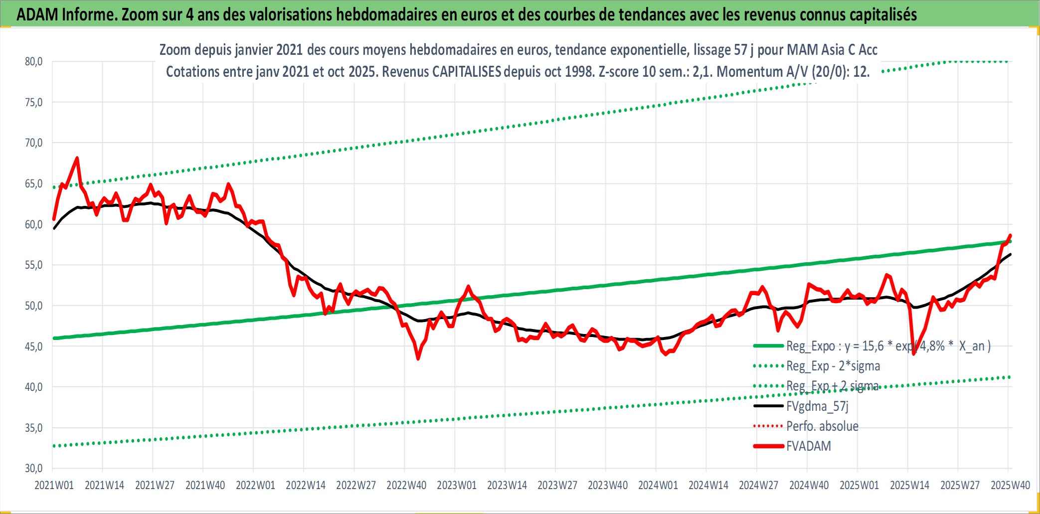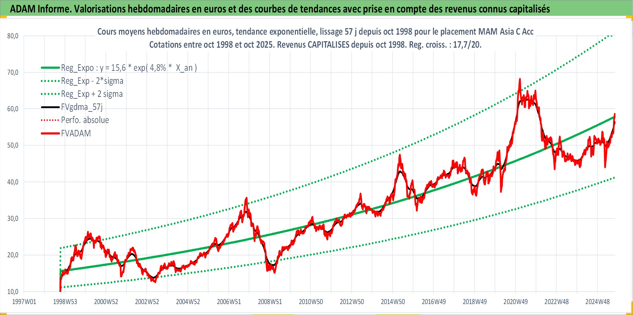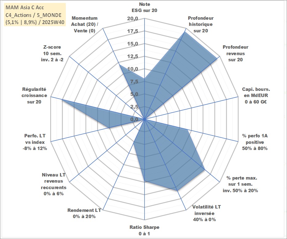 Site dédié aux investisseursPage dédiée sur site financeAnalyse des valorisations hebdomadaires du fonds MAM Asia C Acc. Cet actif est cote en EUR. Les valorisations couvrent les semaines 1998W41 a 2025W40. Les revenus de cet actif financier sont pris en compte depuis la semaine 1998W41. La note globale ESG de cet actif est estimee a 8.0 (apres rebasage entre 0 et 20).