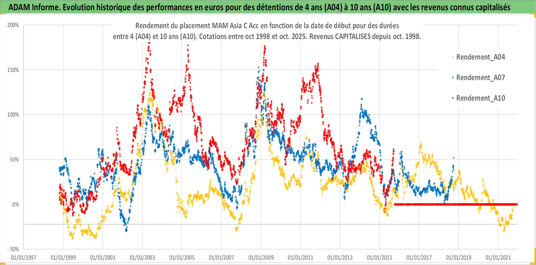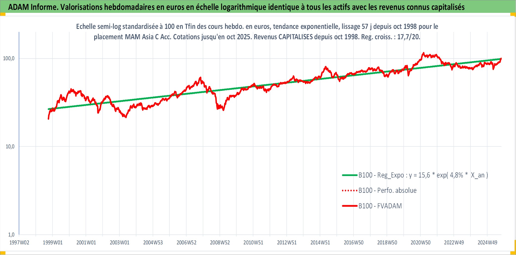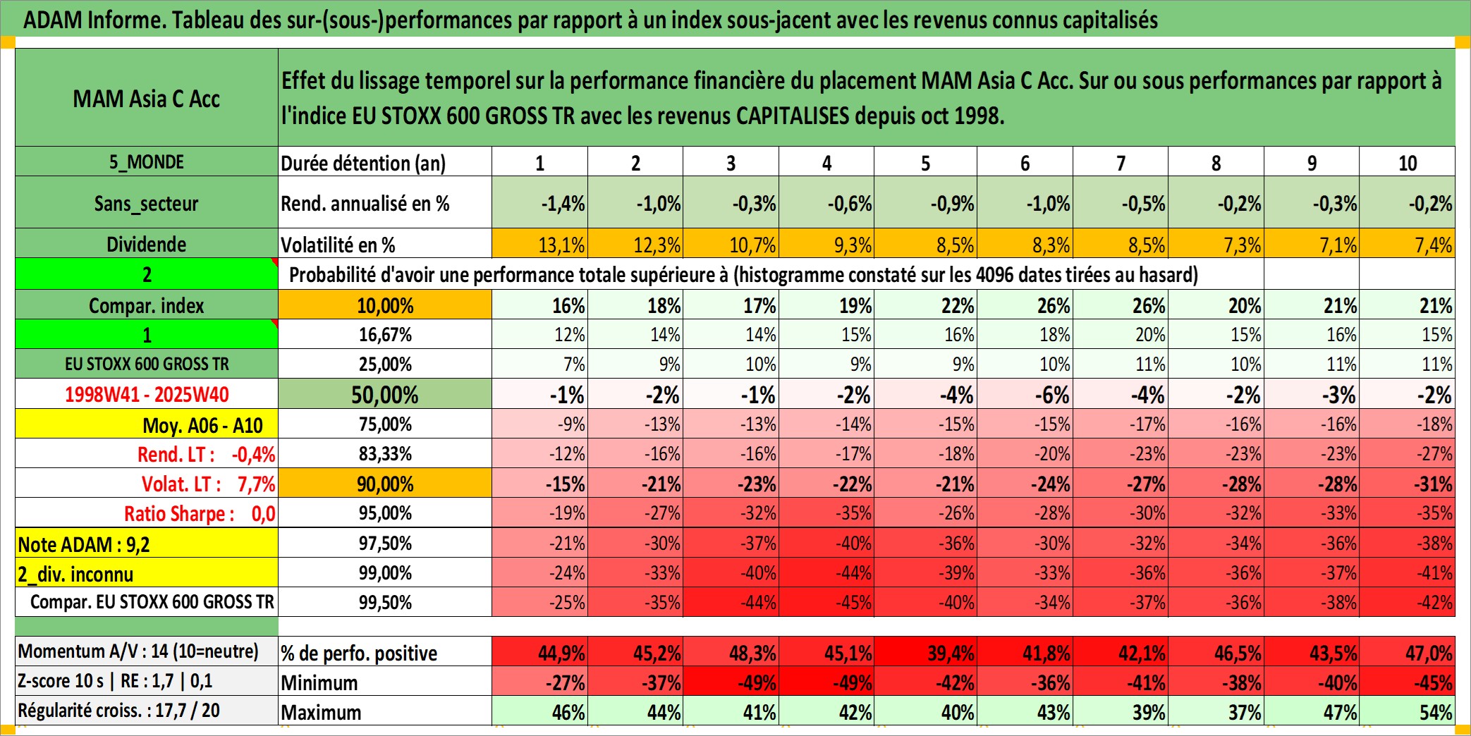 Site dédié aux investisseursPage dédiée sur site financeAnalyse des valorisations hebdomadaires du fonds MAM Asia C Acc. Cet actif est cote en EUR. Les valorisations couvrent les semaines 1998W41 a 2025W40. Les revenus de cet actif financier sont pris en compte depuis la semaine 1998W41. La note globale ESG de cet actif est estimee a 8.0 (apres rebasage entre 0 et 20).