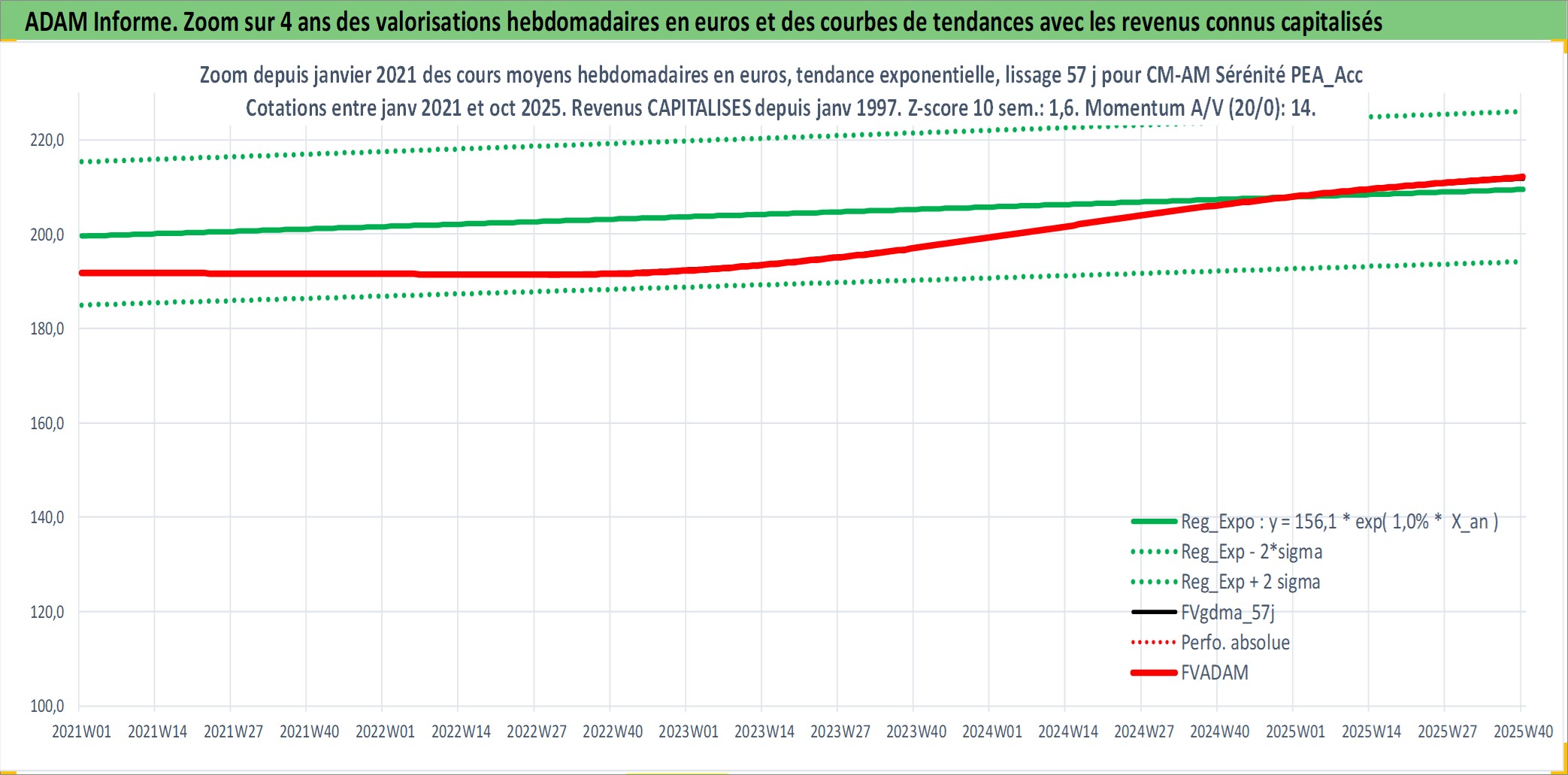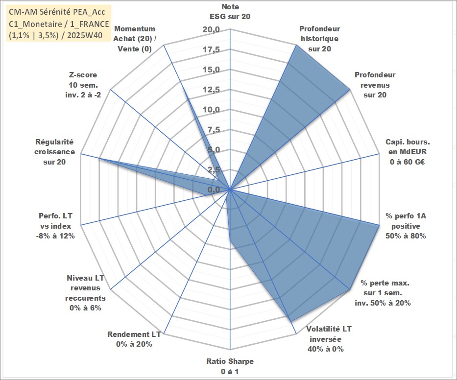 Site dédié aux investisseursPage dédiée sur site financeAnalyse des valorisations hebdomadaires du fonds CM-AM Sérénité PEA_Acc. Cet actif est cote en EUR. Les valorisations couvrent les semaines 1997W01 a 2025W40. Les revenus de cet actif financier sont pris en compte depuis la semaine 1997W01. La note ESG de cet actif n'est pas connue.