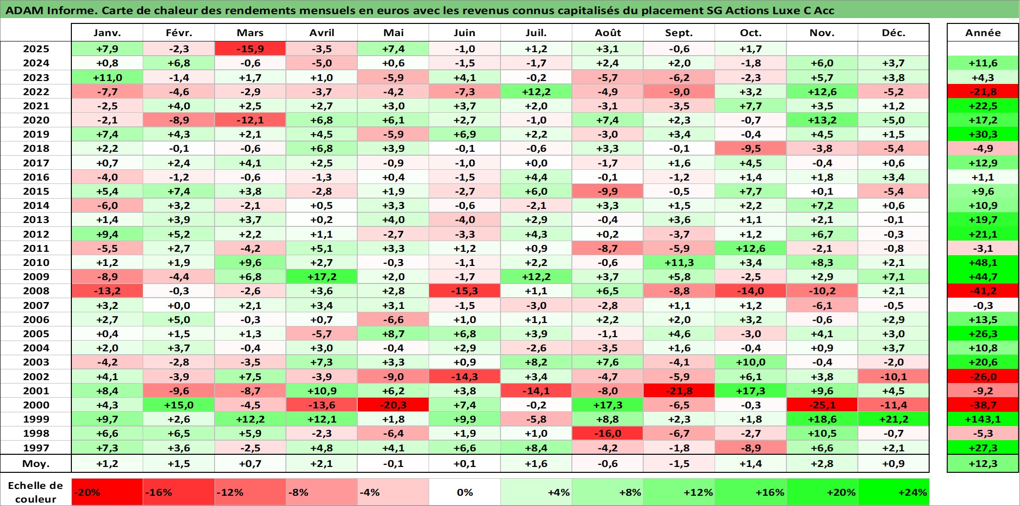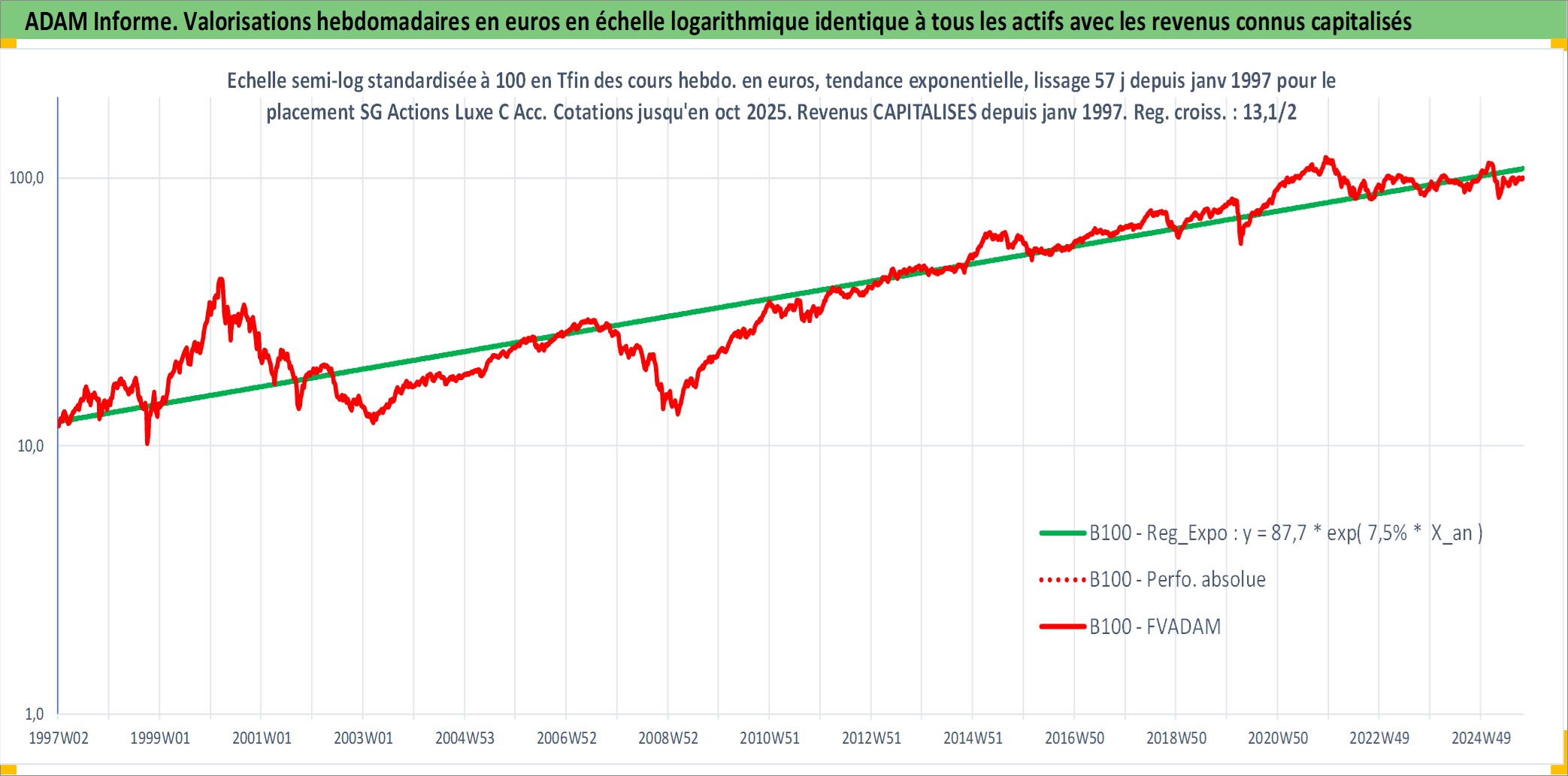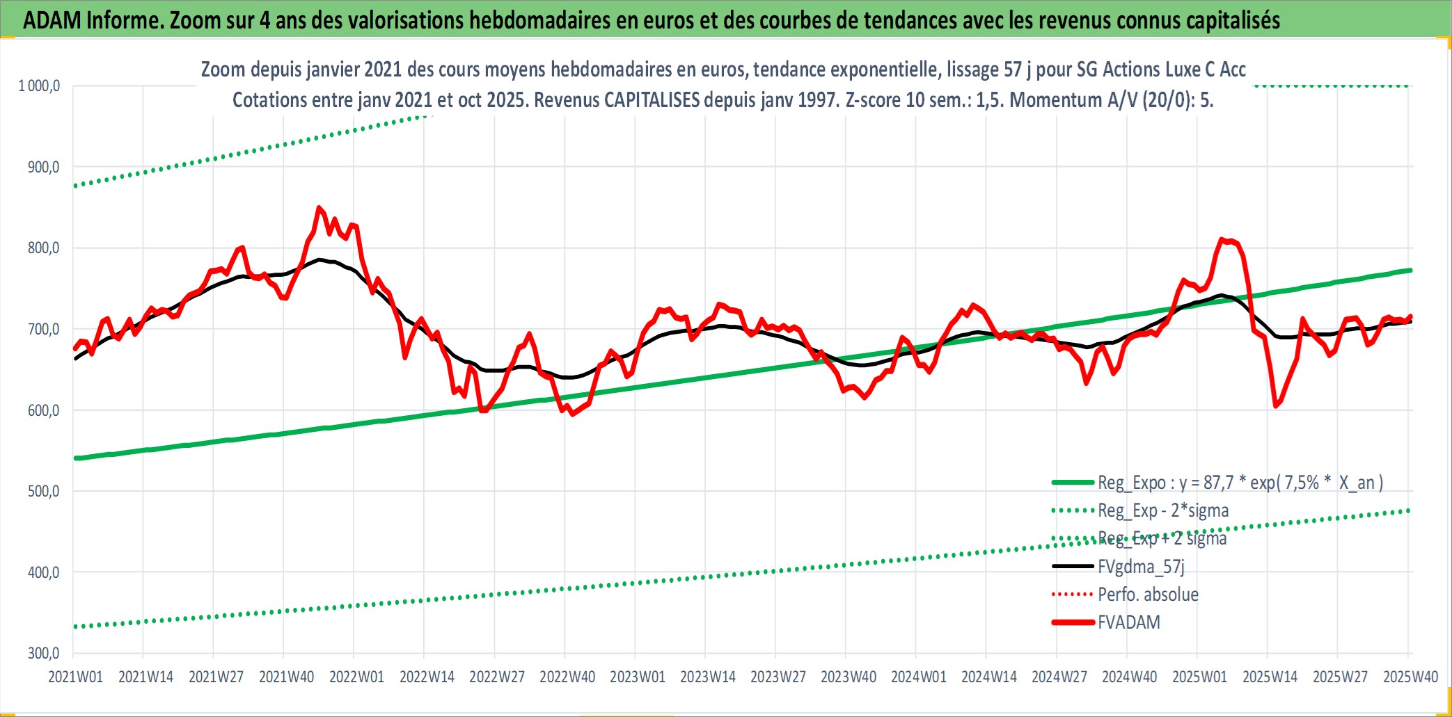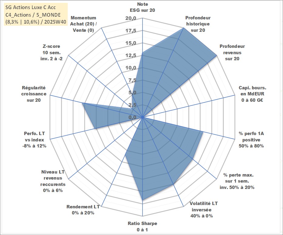 Site dédié aux investisseursPage dédiée sur site financeAnalyse des valorisations hebdomadaires du fonds SG Actions Luxe C Acc. Cet actif est cote en EUR. Les valorisations couvrent les semaines 1997W01 a 2025W40. Les revenus de cet actif financier sont pris en compte depuis la semaine 1997W01. La note globale ESG de cet actif est estimee a 13.0 (apres rebasage entre 0 et 20).