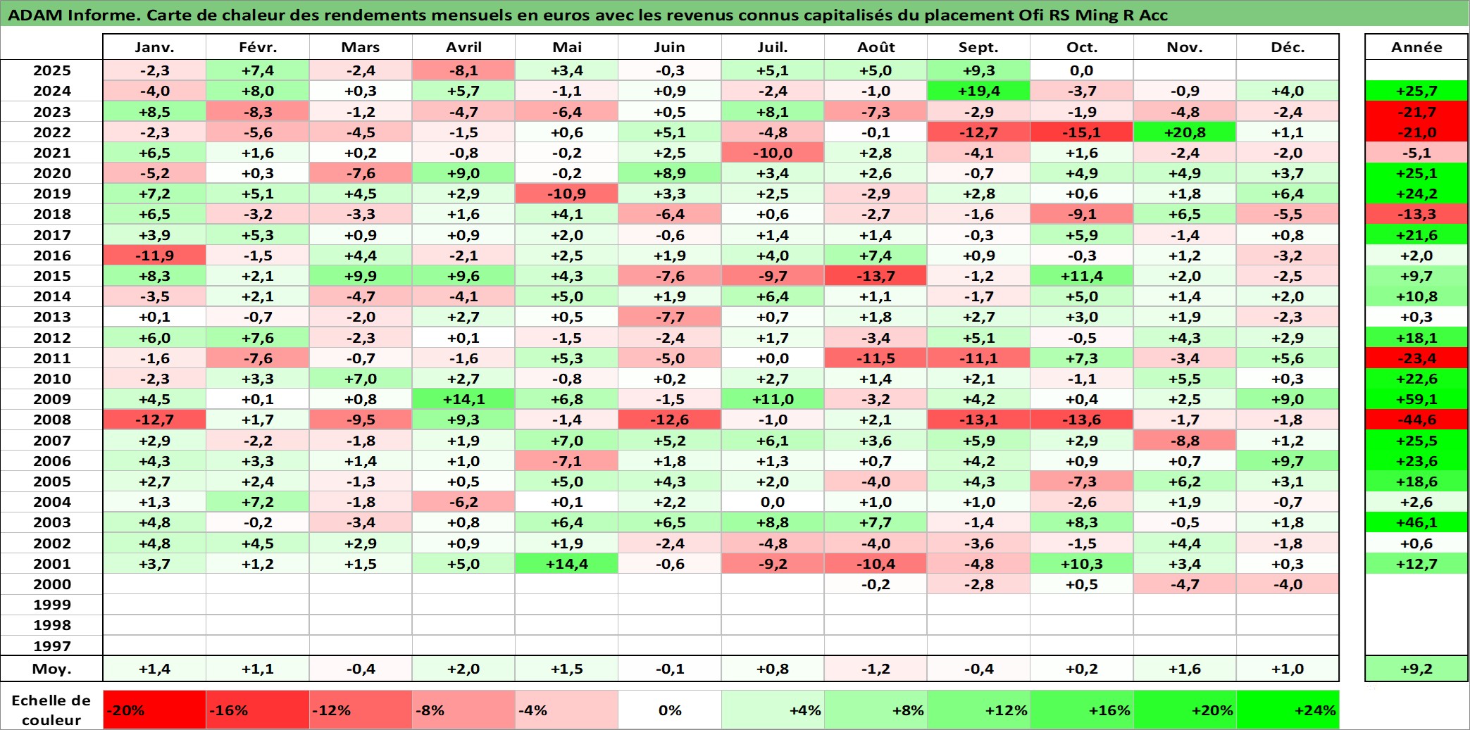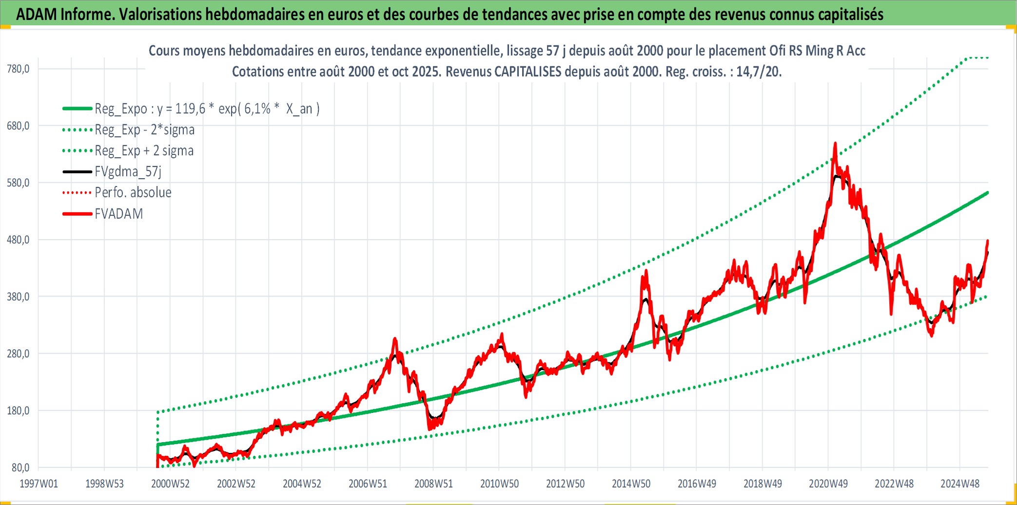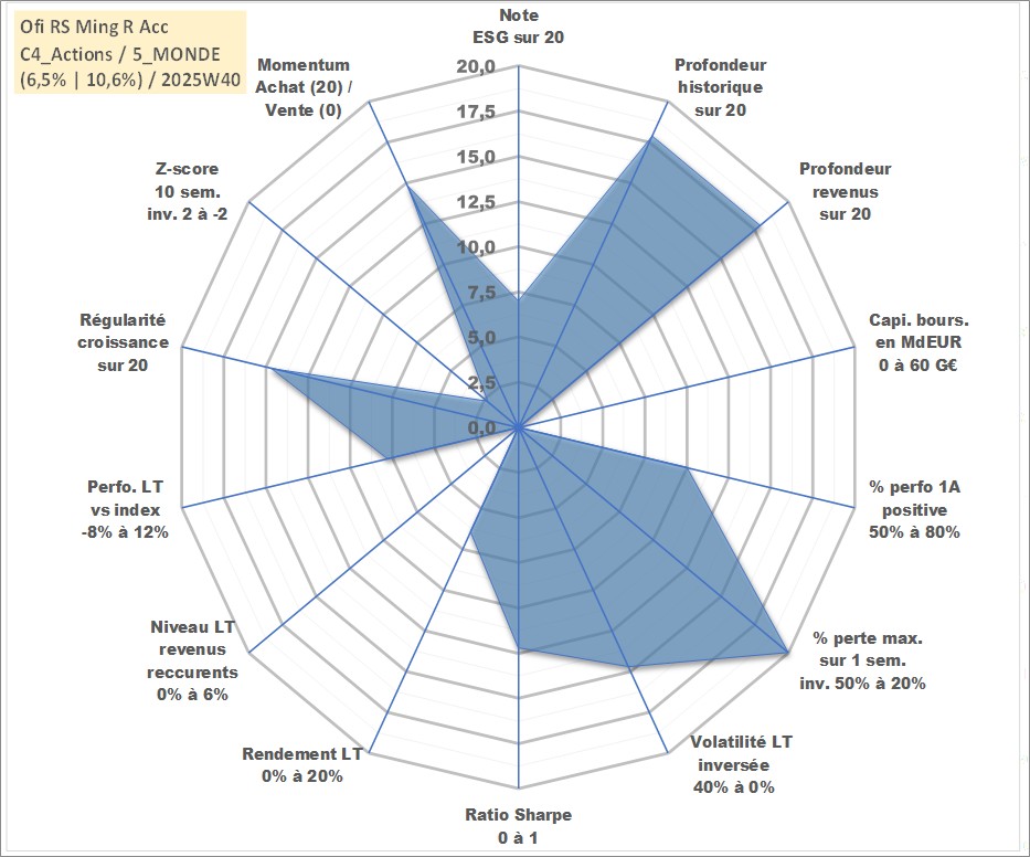 Site dédié aux investisseursPage dédiée sur site financeAnalyse des valorisations hebdomadaires du fonds Ofi RS Ming R Acc. Cet actif est cote en EUR. Les valorisations couvrent les semaines 2000W32 a 2025W40. Les revenus de cet actif financier sont pris en compte depuis la semaine 2000W32. La note globale ESG de cet actif est estimee a 7.0 (apres rebasage entre 0 et 20).