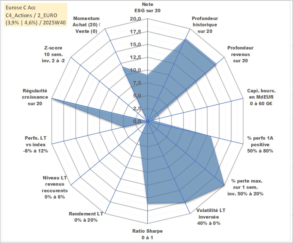 Site dédié aux investisseursPage dédiée sur site financeAnalyse des valorisations hebdomadaires du fonds Eurose C Acc. Cet actif est cote en EUR. Les valorisations couvrent les semaines 2000W48 a 2025W40. Les revenus de cet actif financier sont pris en compte depuis la semaine 2000W48. La note globale ESG de cet actif est estimee a 9.0 (apres rebasage entre 0 et 20).