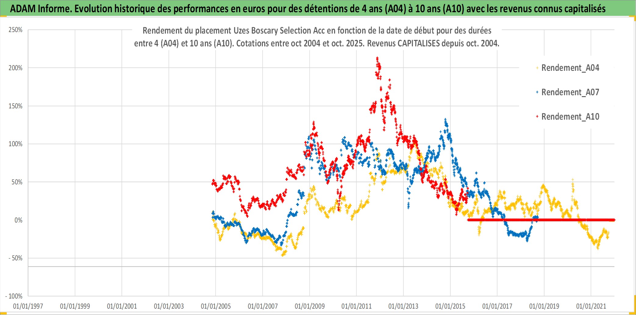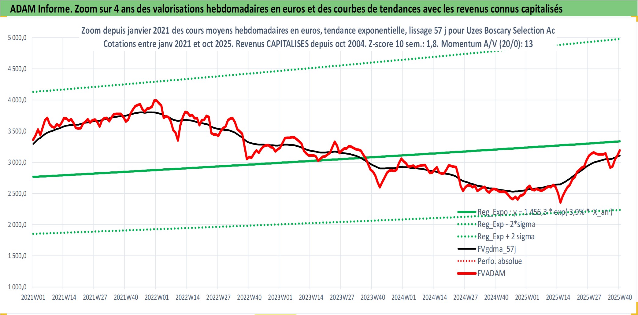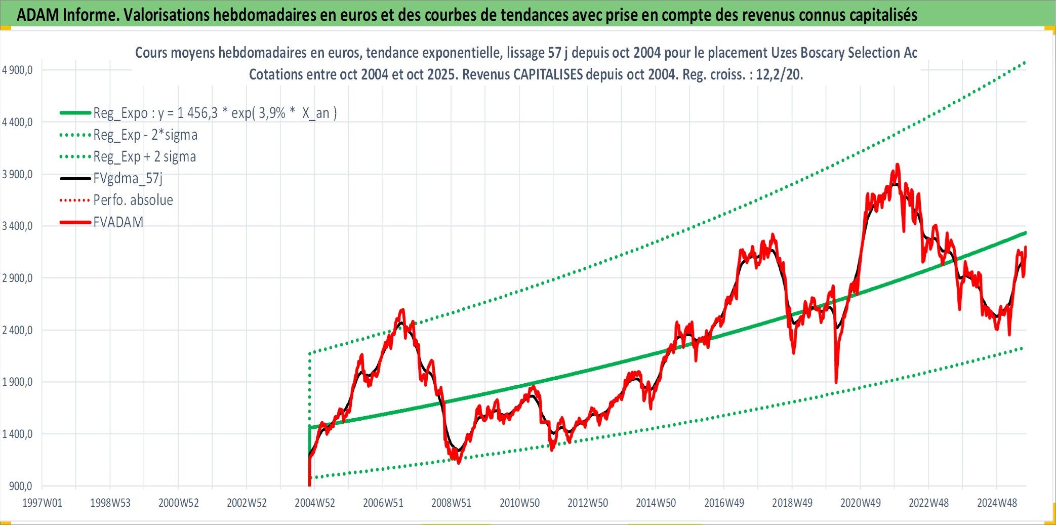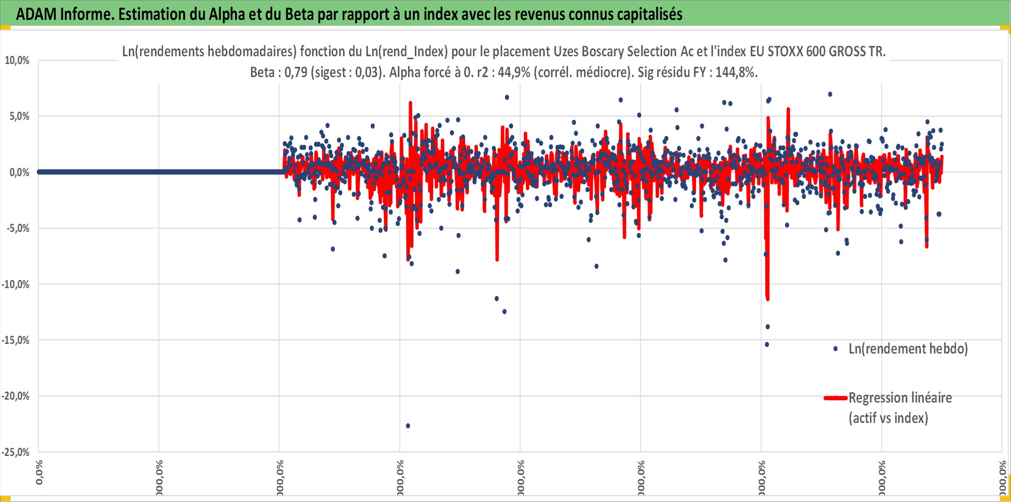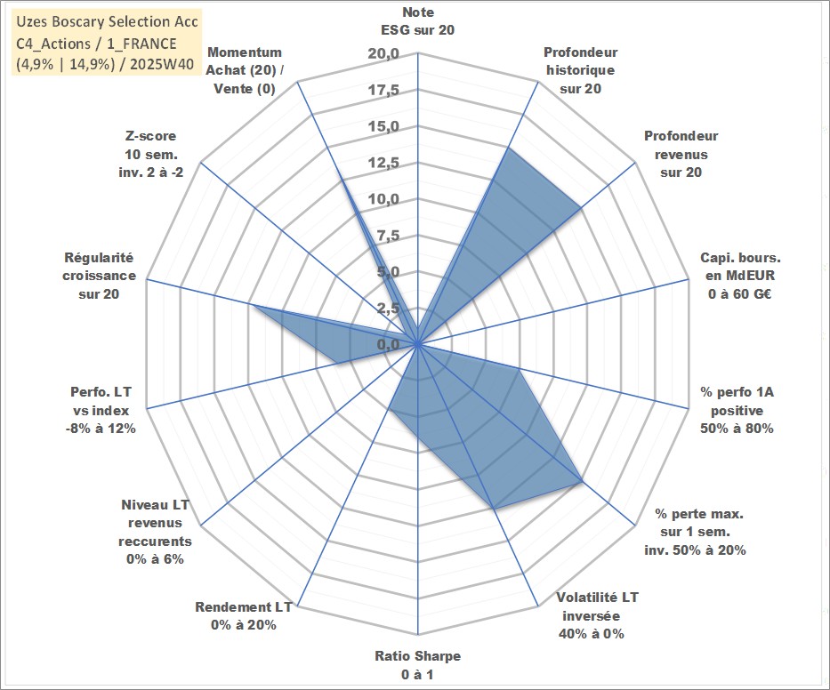 Site dédié aux investisseursPage dédiée sur site financeAnalyse des valorisations hebdomadaires du fonds Uzes Boscary Selection Acc. Cet actif est cote en EUR. Les valorisations couvrent les semaines 2004W44 a 2025W40. Les revenus de cet actif financier sont pris en compte depuis la semaine 2004W44. La note globale ESG de cet actif est estimee a 1.0 (apres rebasage entre 0 et 20).