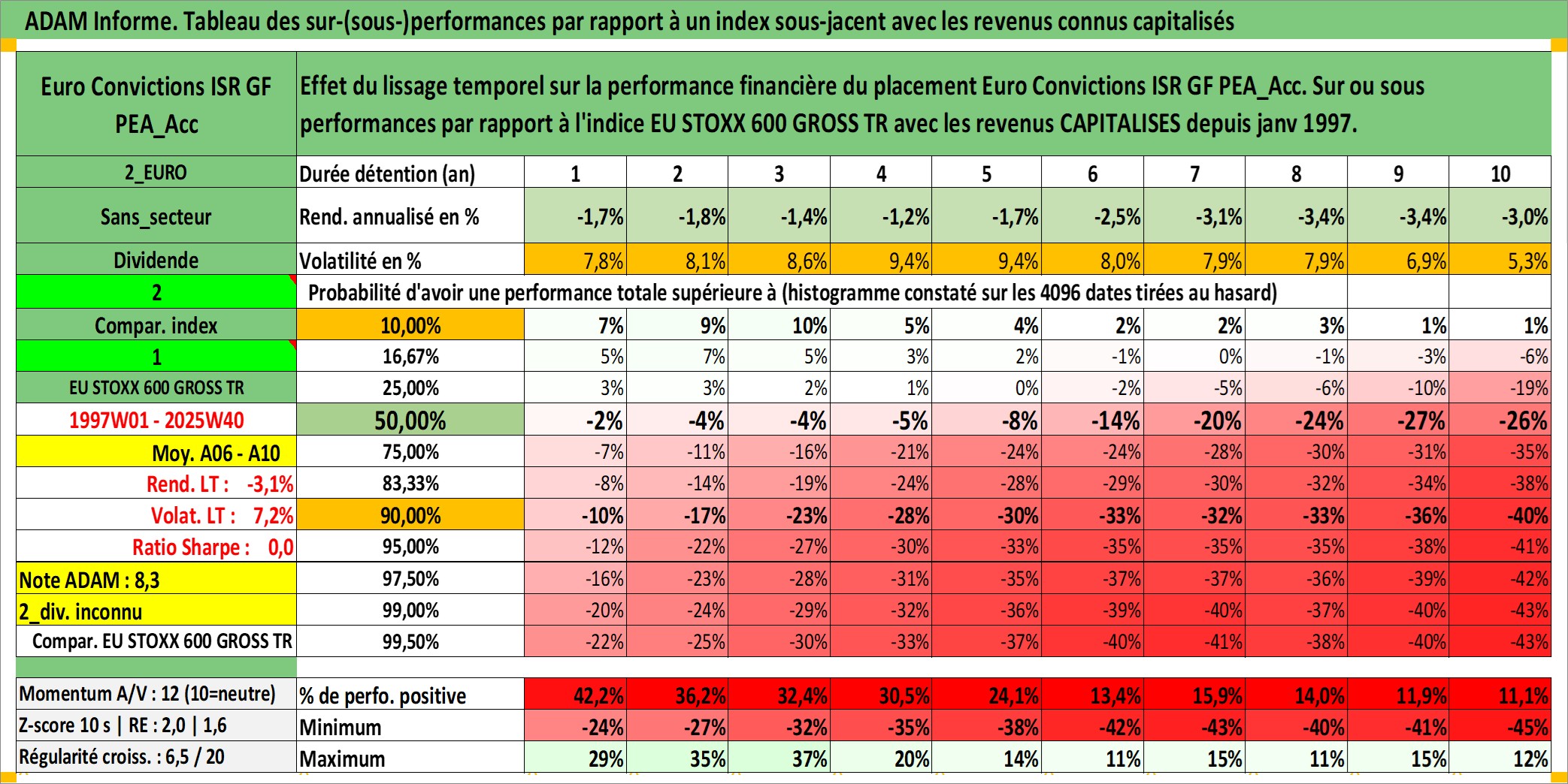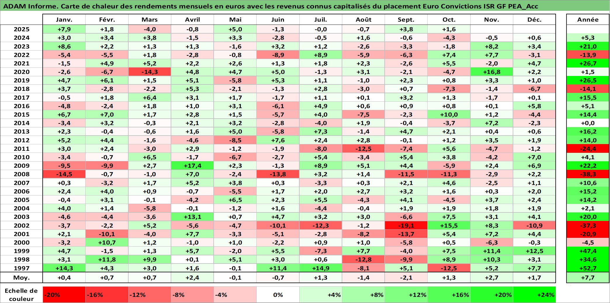 Site dédié aux investisseursPage dédiée sur site financeAnalyse des valorisations hebdomadaires du fonds Euro Convictions ISR GF PEA_Acc. Cet actif est cote en EUR. Les valorisations couvrent les semaines 1997W01 a 2025W40. Les revenus de cet actif financier sont pris en compte depuis la semaine 1997W01. La note ESG de cet actif n'est pas connue.