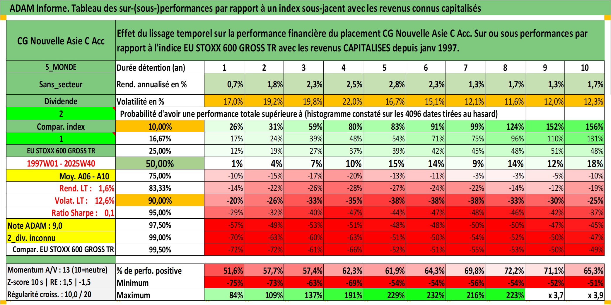 Site dédié aux investisseursPage dédiée sur site financeAnalyse des valorisations hebdomadaires du fonds CG Nouvelle Asie C Acc. Cet actif est cote en EUR. Les valorisations couvrent les semaines 1997W01 a 2025W40. Les revenus de cet actif financier sont pris en compte depuis la semaine 1997W01. La note globale ESG de cet actif est estimee a 7.0 (apres rebasage entre 0 et 20).